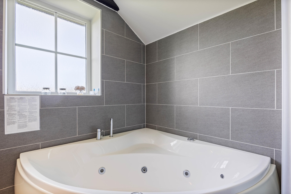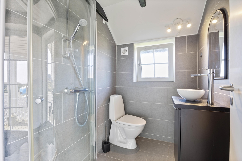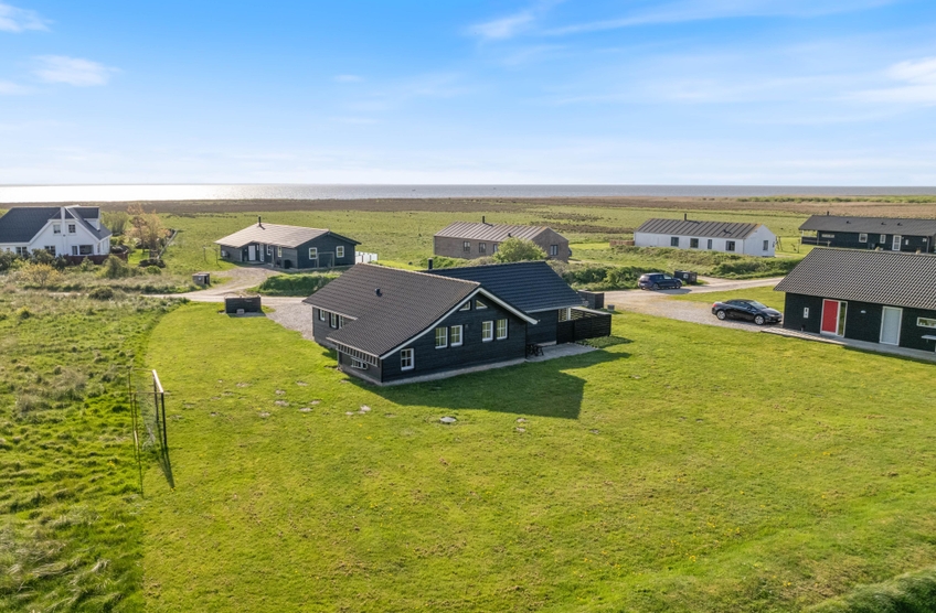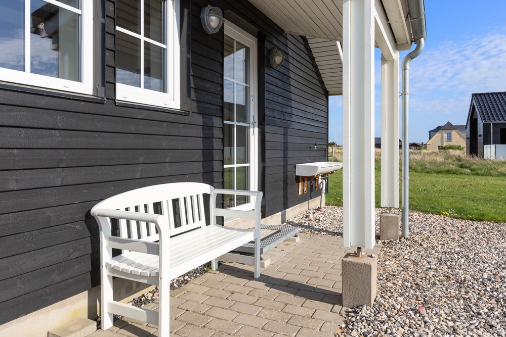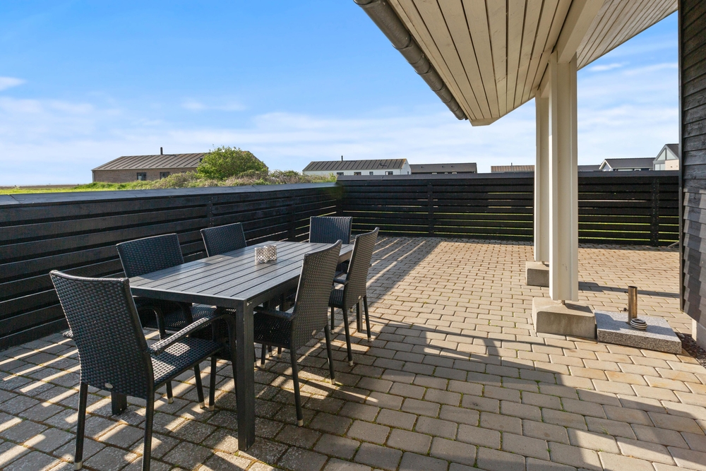 Der er flere terrasser til dette feriehus. Mod nord er der en mindre terrasse, hvor indgangspartiet også er, her kan man nyde sin morgenkaffe. Mod syd er der en fantastisk terrasse, som både er lukket, delvist afskærmet og delvis overdækket. Så den kan bruges det meste af dagen, samt til de hyggelige grillaftener. Har man børn eller hund med, er den særligt velegnet. Har man været ud og fiske, kan man rense fiskene udenfor hoveddøren, hvor der er en velegnet vask til dette.