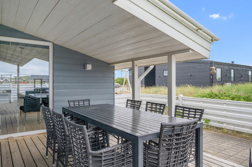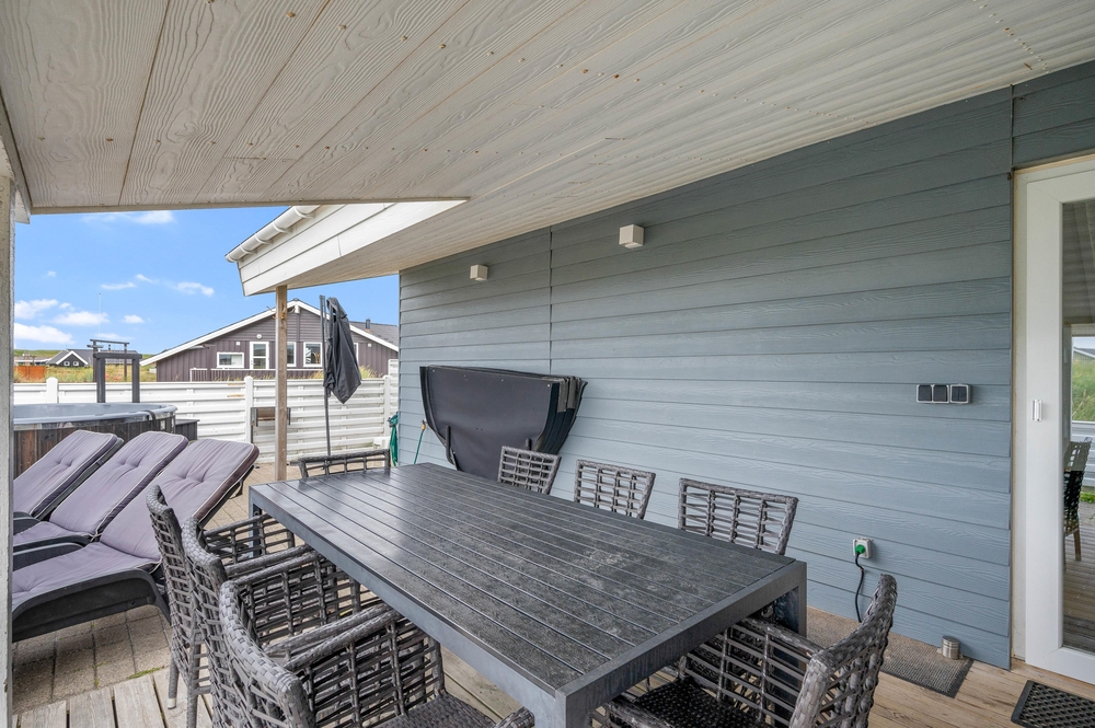Der er en dejlig lukket terrasse, hvor du sagtens kan lade småbørn og hunde færdes under mindre opsyn. Da den er sydvest-vendt vil du her kunne nyde solen det meste af dagen, og endda få dagens sidste solstråler med, mens bøfferne vendes på grillen. Skulle vejret vise sig fra sin drilske side, kan du også sidde i ly og læ under terrassens halvtag. Udenfor finder I også et vildmarksbad, som ligger op til mange timers hygge og afslapning.