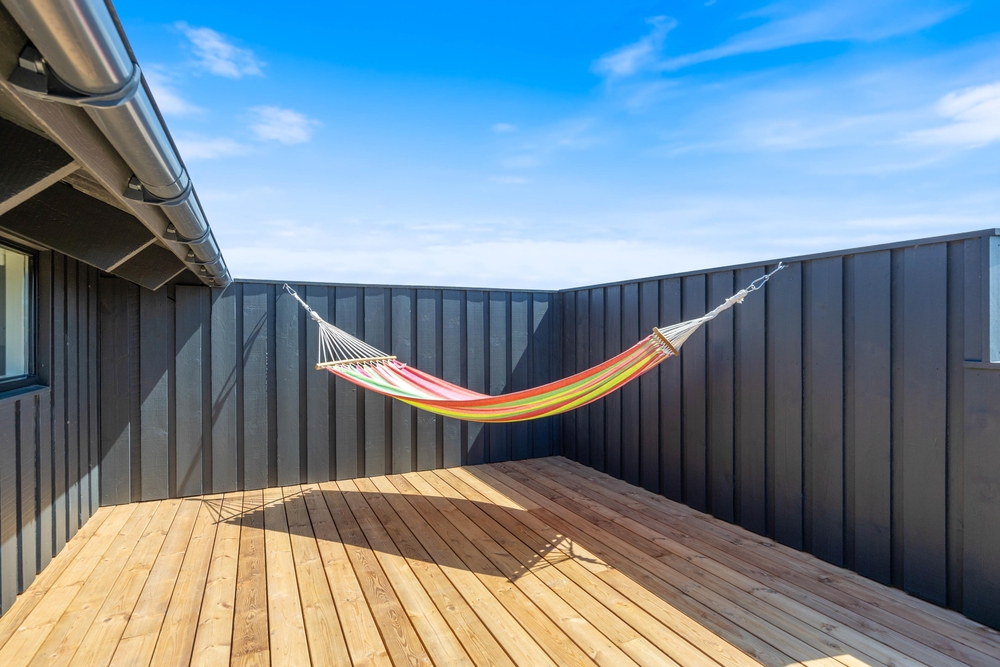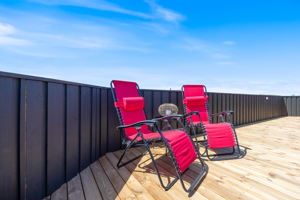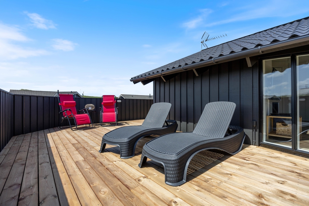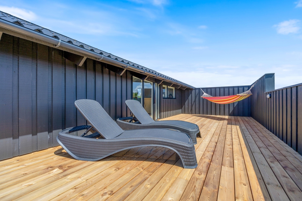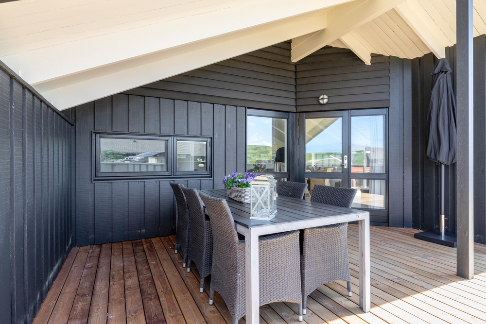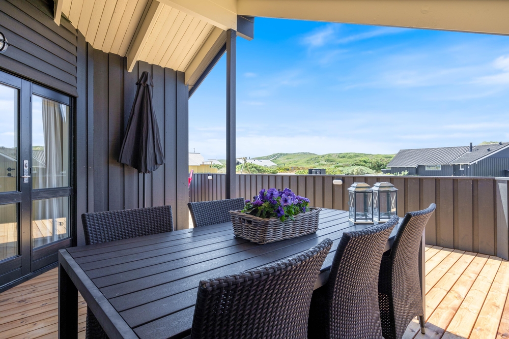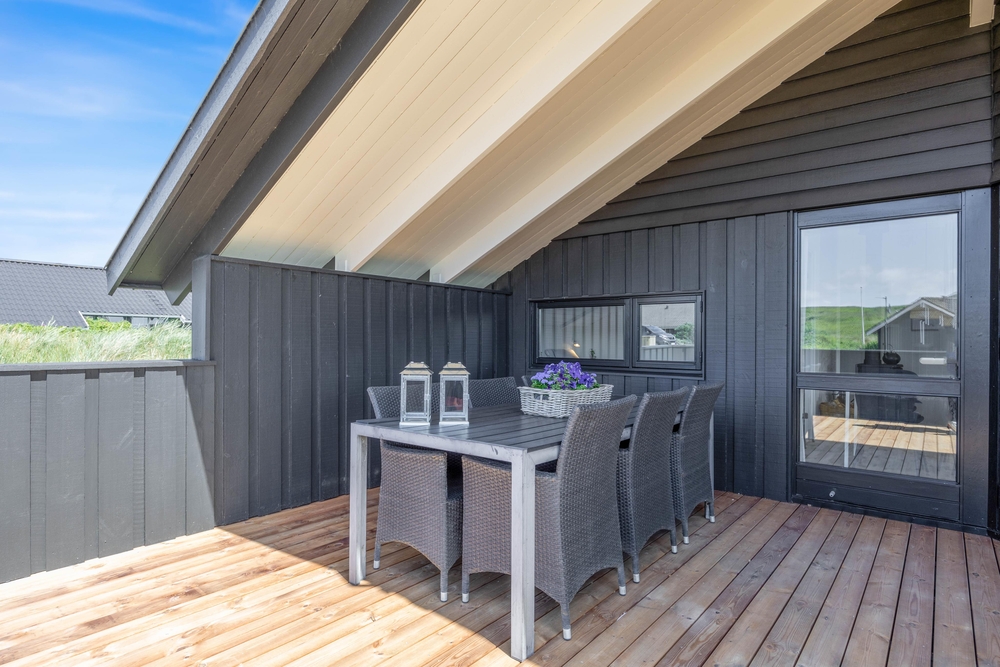 I feriehusets udendørsområde findes smukke terrasseområder. En af terrasserne er også indhegnet, så her vil hunden elske at gå på opdagelse, mens der hygges omkring havebordet med lækker sommermad og kolde drikkevarer.