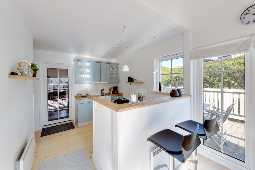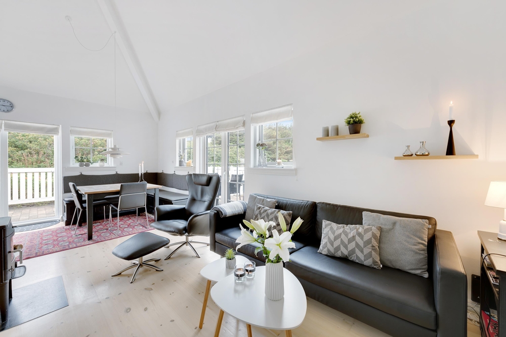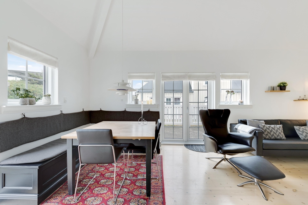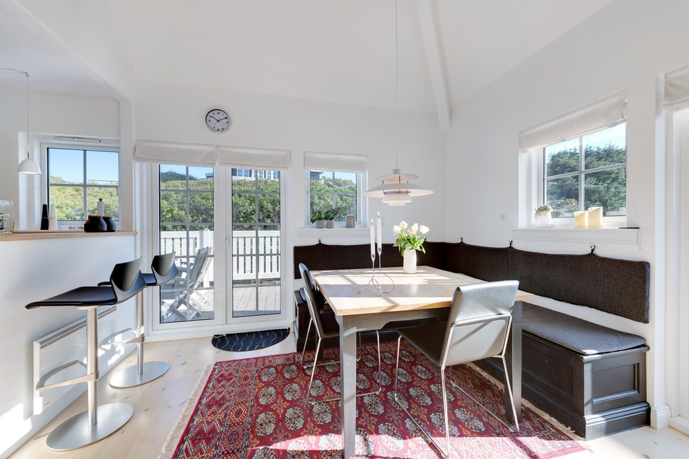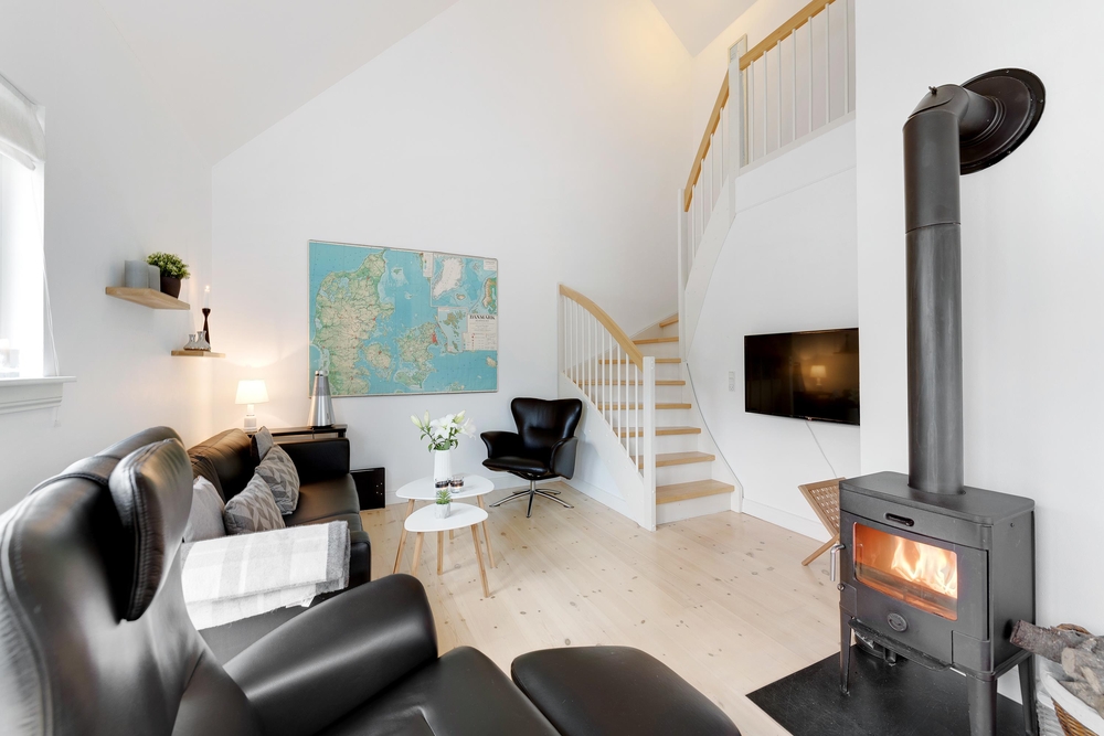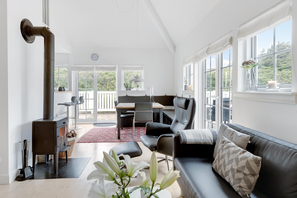 Indretningen er enkel og hyggelig med lyse farver og søde detaljer, og de mange store vinduer rundt omkring inviterer solens lys og Søndervigs naturskønne landskab indenfor. På de kølige efterårs- og vinterdage kan I tænde op i brændeovnen i fællesrummet, som med sine knitrende flammer spreder både varme og ægte ferieatmosfære.