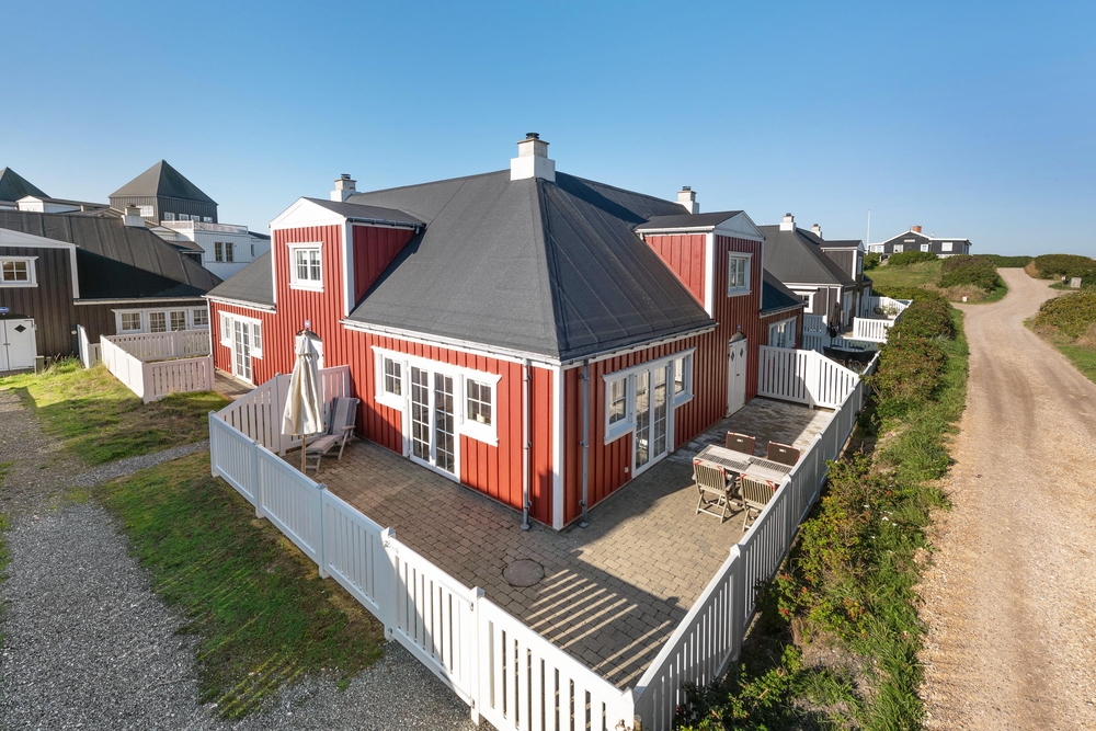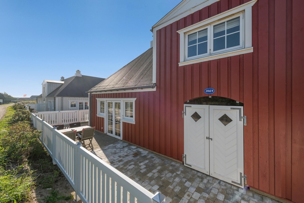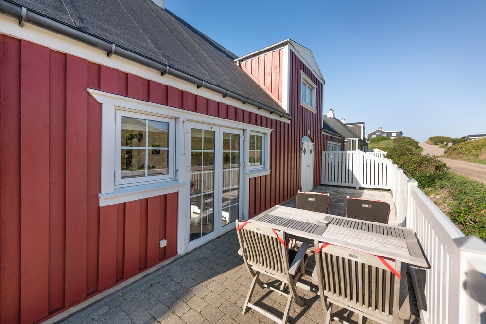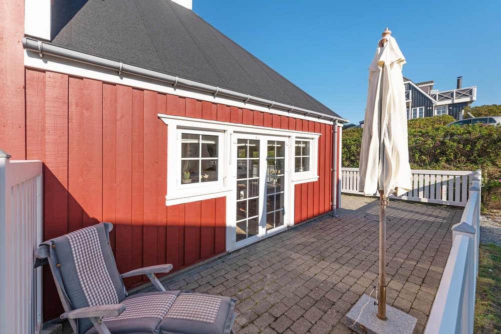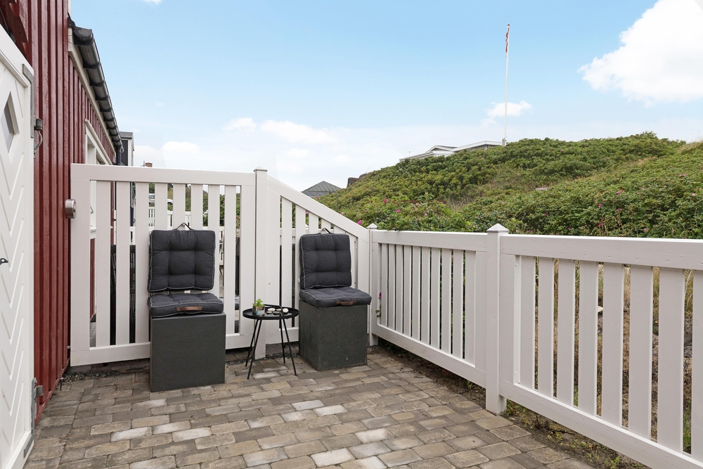 Rundt om ferieboligen går en lille lukket terrasse, hvor havemøbler, liggestole og grill står klar til at gøre de solrige feriedage ekstra gode. Tag morgenkaffen med udenfor eller tilbered aftensmaden på grillen på en lun sommeraften.