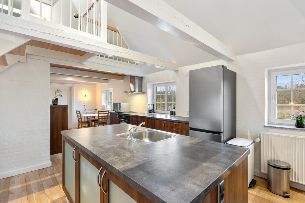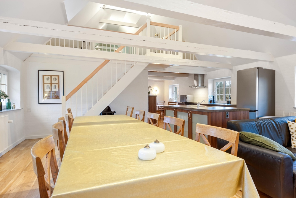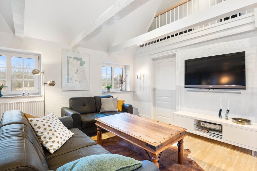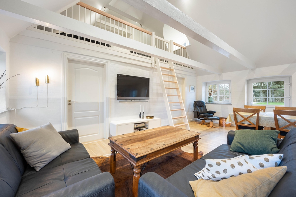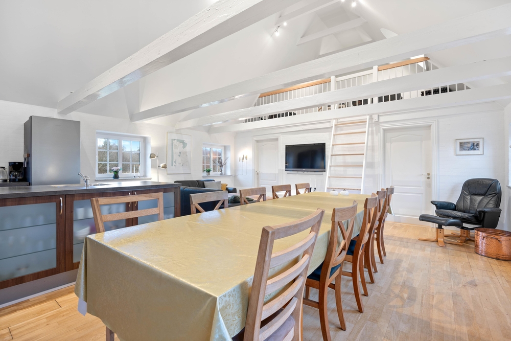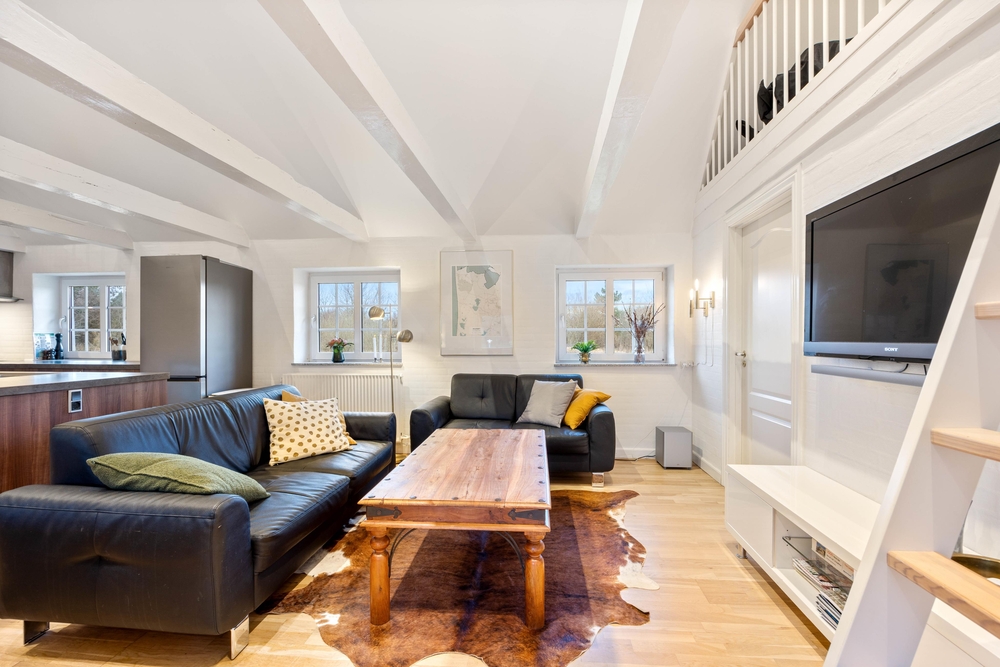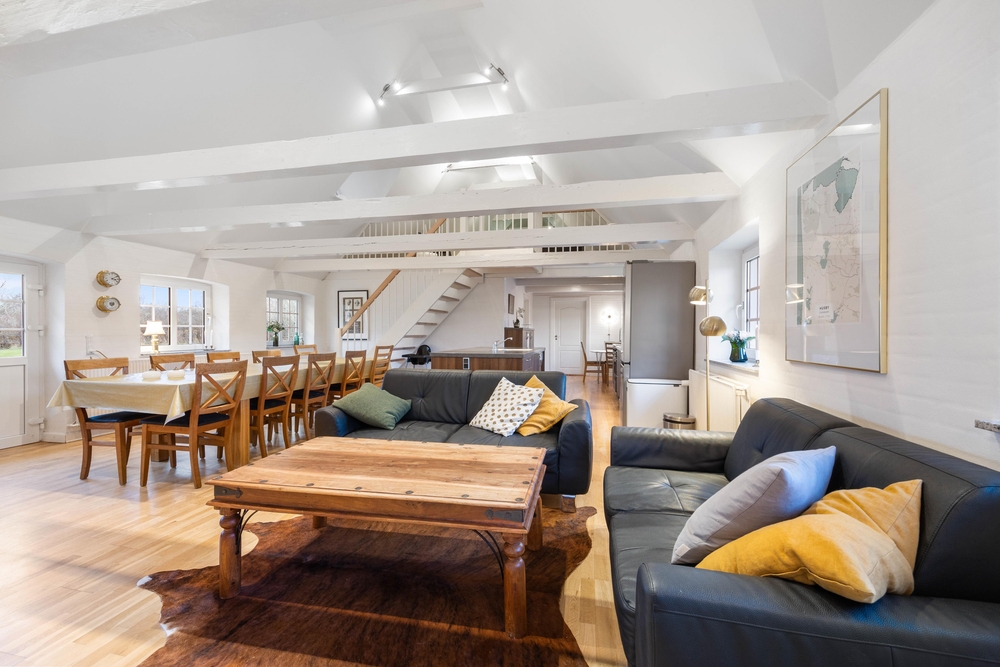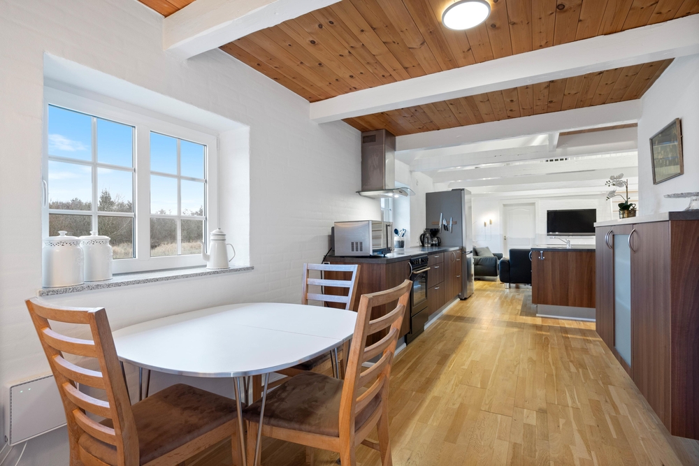 Når I træder ind i feriehuset, bliver I mødt af et hyggeligt og lyst interiør. Feriehusets midtpunkt er det store opholdsrum, som kombinerer køkken, spiseplads og stue. Her er der plads til alle, uanset om man vil lave mad, se sin yndlingsserie eller planlægge de næste ferieaktiviteter. Køkkenet er udstyret med en ovn og en kombiovn, hvor kombiovnen er en kombination af varmluft, grillfunktion og mikroovn. Fra stuen er der via en trappe adgang til aktivitetsrummet, hvor I finder billardbord og bordfodbold, så I kan arrangere jeres helt egen billardturnering på regnvejrsdage. Der er også et spillerum med en Xbox og en gammel arkademaskine. I stuen er der en Chromecast, som gør, at I kan streame direkte op på fjernsynet fra jeres telefon.