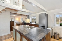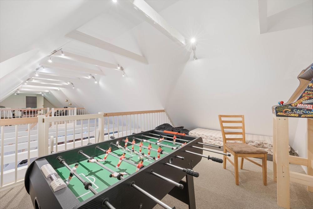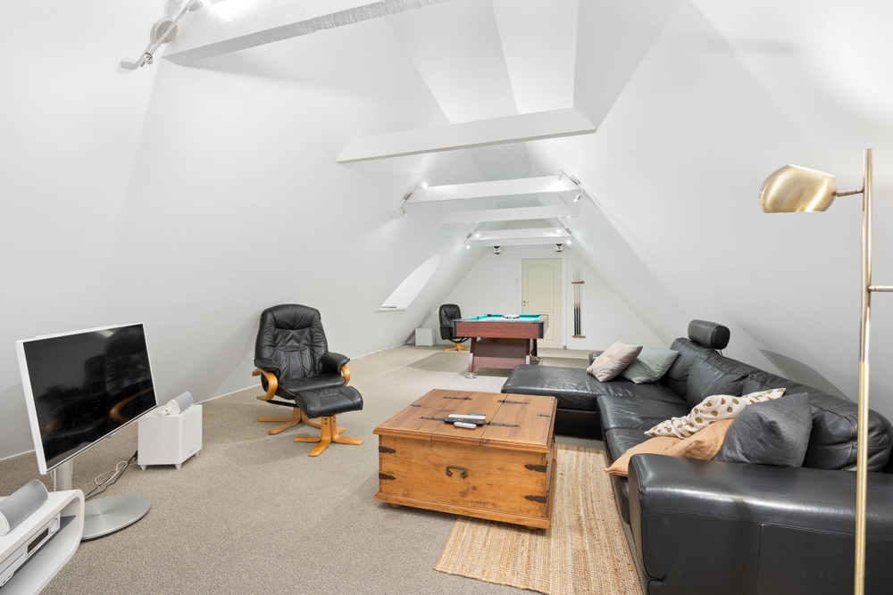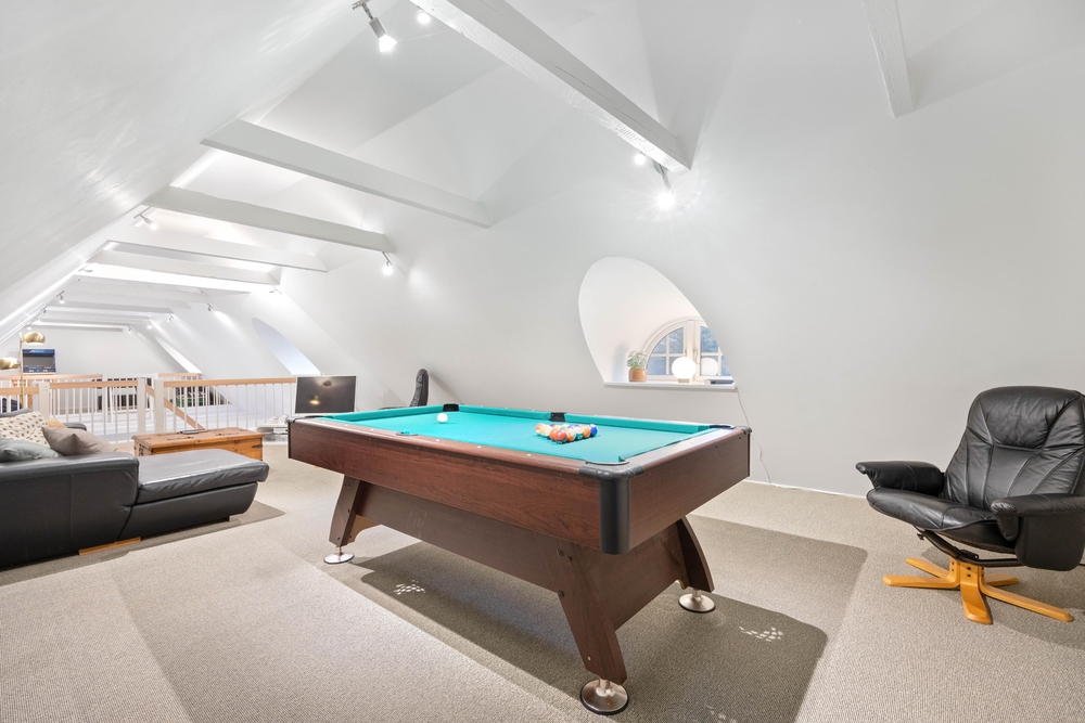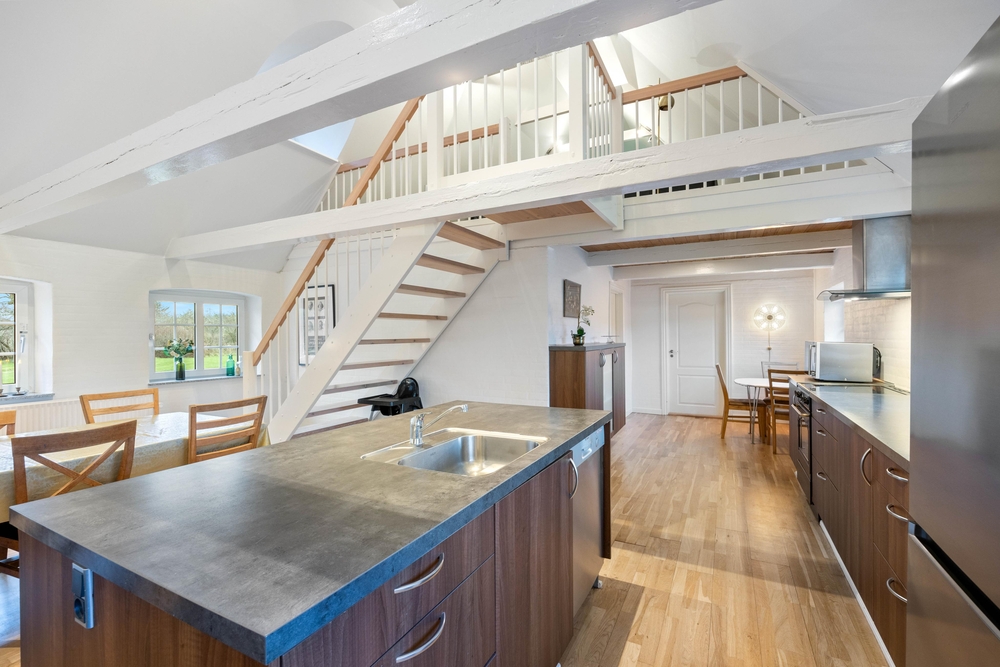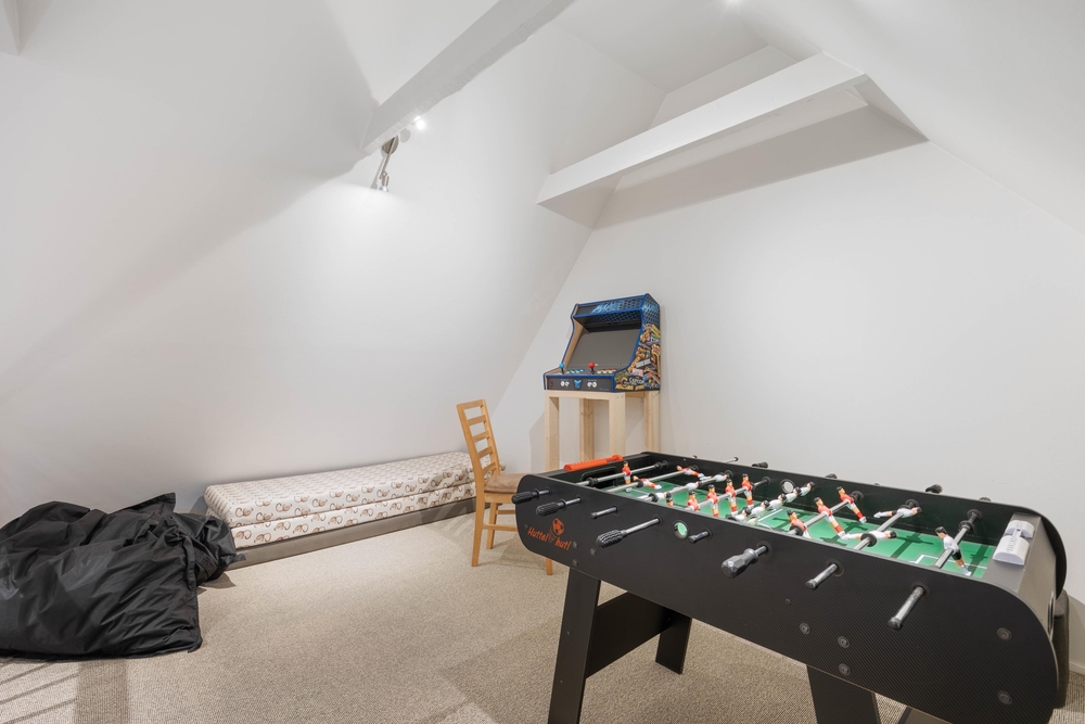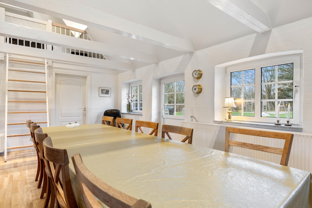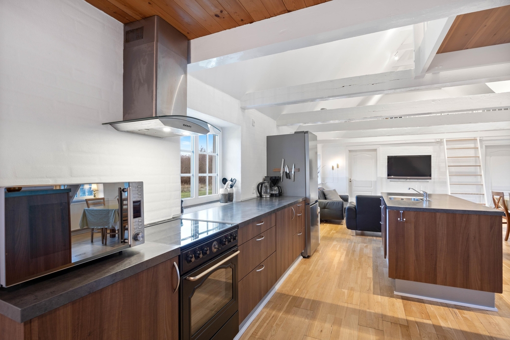 Når I træder ind i feriehuset, bliver I mødt af et hyggeligt og lyst interiør. Feriehusets midtpunkt er det store opholdsrum, som kombinerer køkken, spiseplads og stue. Her er der plads til alle, uanset om man vil lave mad, se sin yndlingsserie eller planlægge de næste ferieaktiviteter. Køkkenet er udstyret med en ovn og en kombiovn, hvor kombiovnen er en kombination af varmluft, grillfunktion og mikroovn. Fra stuen er der via en trappe adgang til aktivitetsrummet, hvor I finder billardbord og bordfodbold, så I kan arrangere jeres helt egen billardturnering på regnvejrsdage. Der er også et spillerum med en Xbox og en gammel arkademaskine. I stuen er der en Chromecast, som gør, at I kan streame direkte op på fjernsynet fra jeres telefon.