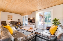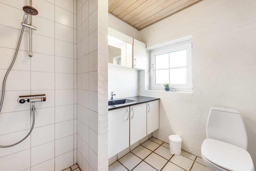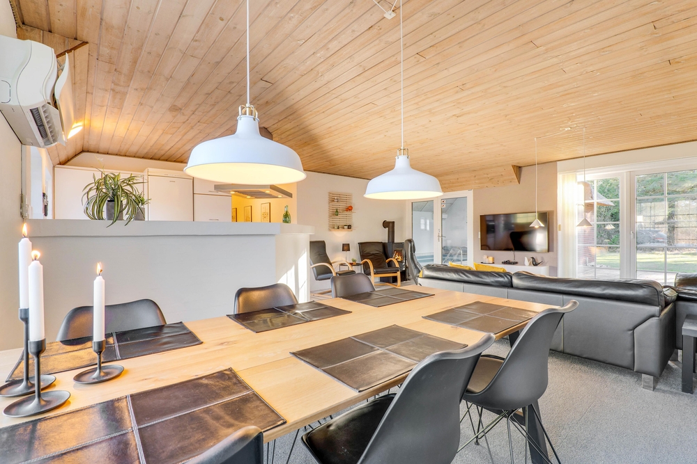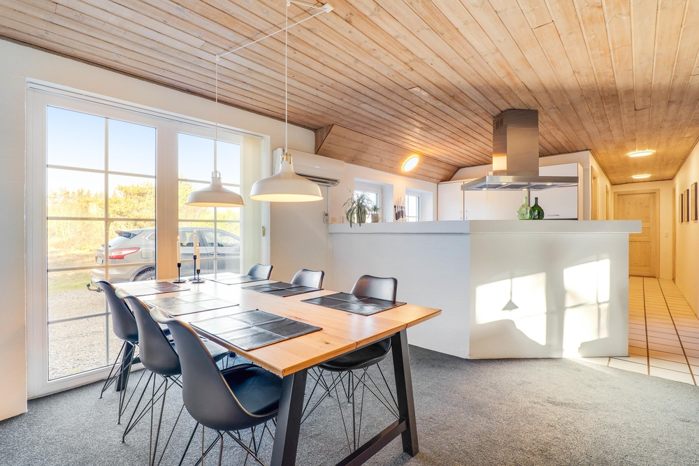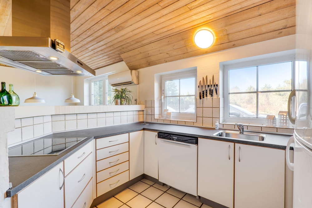 Alt i sommerhuset er gennemtænkt og praktisk udstyret. Det åbne samtalekøkken står i åben forbindelse til sommerhusets lyse opholdsrum med brændeovn. Køkkenet er veludstyret og står klar til, at feriekokken kan slå sig løs. Opvasken klares naturligvis af opvaskemaskinen.