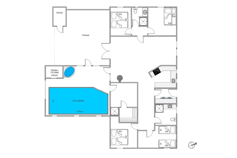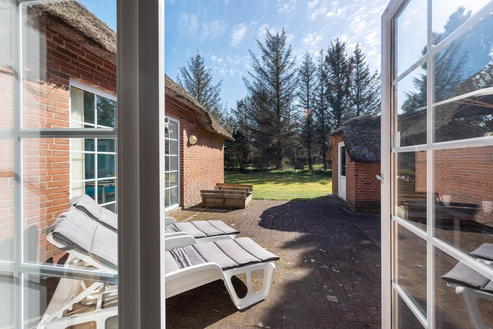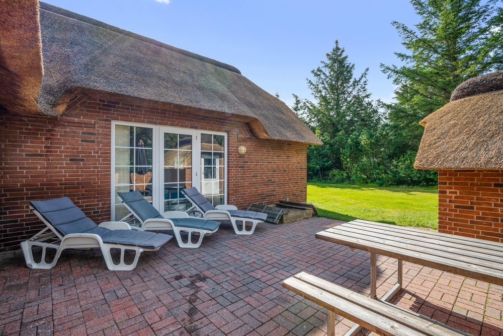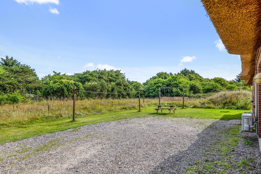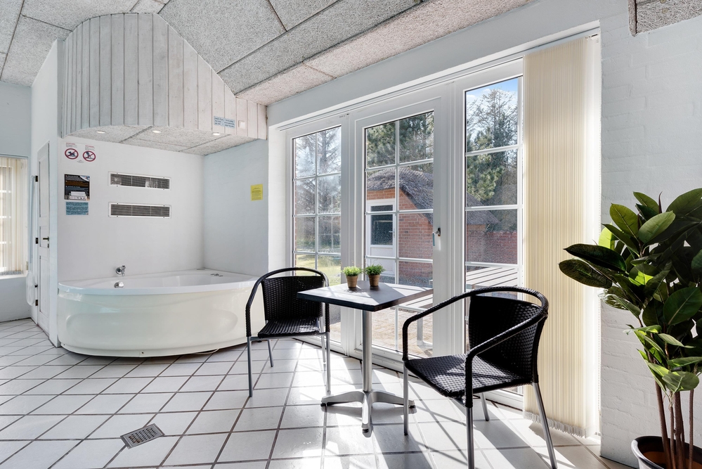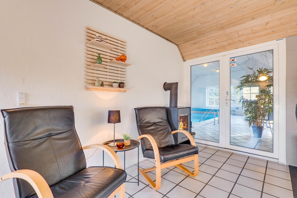 Afskærmet fra nabohusene ligger det idylliske stråtækte sommerhus på en over 5000 kvadratmeter stor naturgrund. Sommerhuset har meget at byde på året rundt. For familier med børn er poolrummet et sandt paradis! Her kan børnene plaske rundt og rigtigt lære at svømme. Uafhængigt af vejr og vind er der badeferie året rundt, når man har en 25 kvadratmeter stor pool til rådighed. Trænger I til lidt ekstra forkælelse på jeres badeferie, skal der blot tændes op i saunaen og spabadet, så er der ren wellness for krop og sjæl. Især efter en lang dag med mange gå- og cykelture i det naturskønne område kan man falde helt til ro.