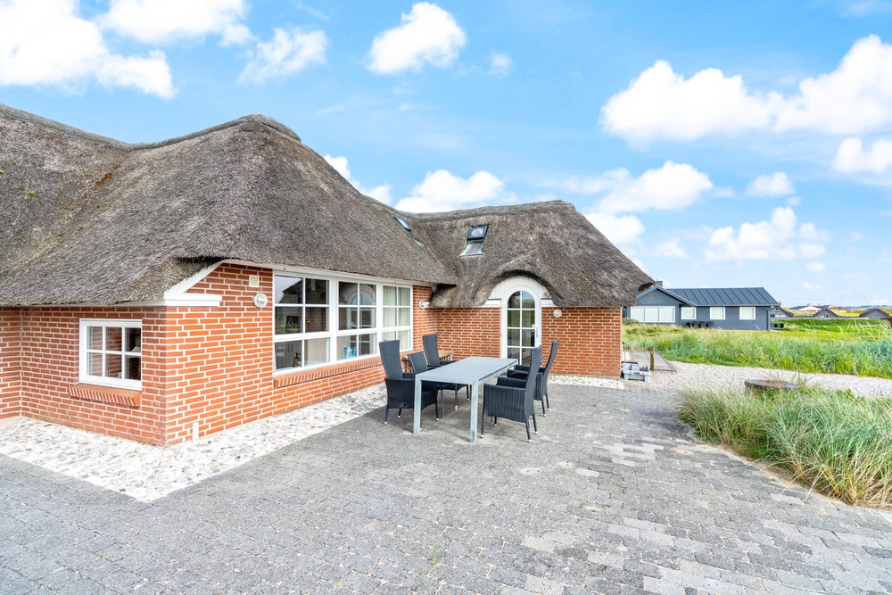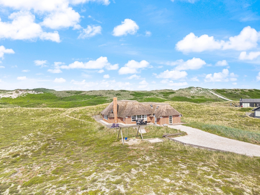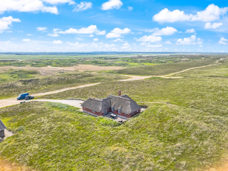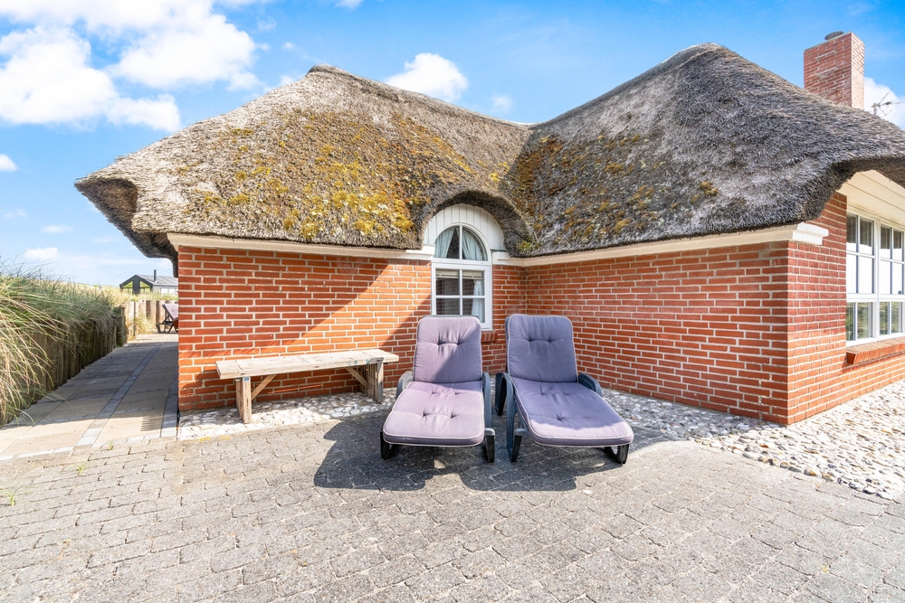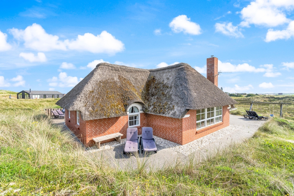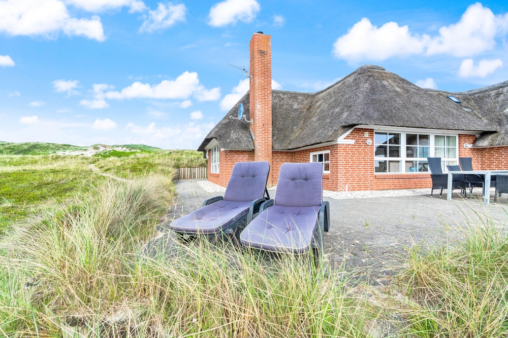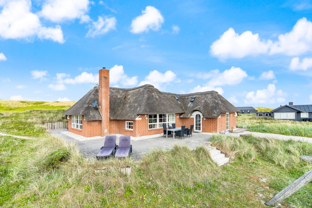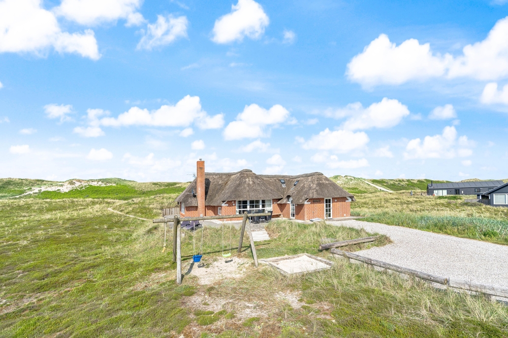 Dette store og flotte sommerhus er bygget i mursten, har stråtag og opfylder de vildeste drømme om en fantastisk ferie. Feriehuset er stort og rummeligt og har en flot indretning. Fra den hyggelige stue er der udsigt til endeløse hedeområder og de høje klitter. Her er et velindrettet køkken og flot opholdsstue, der står i åben forbindelse med hinanden med klinkegulve og gulvvarme.