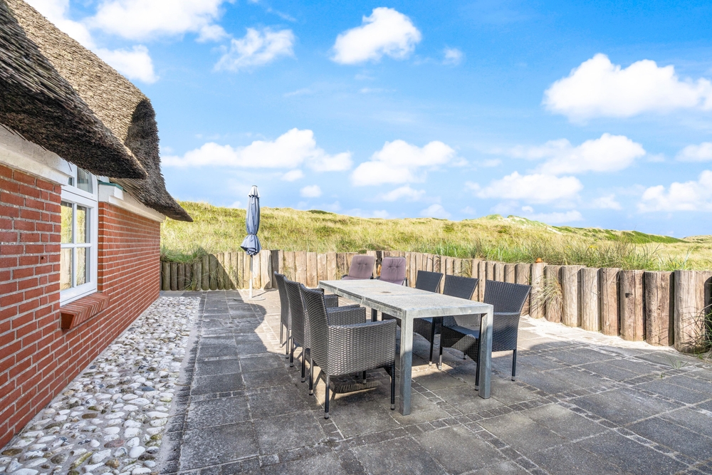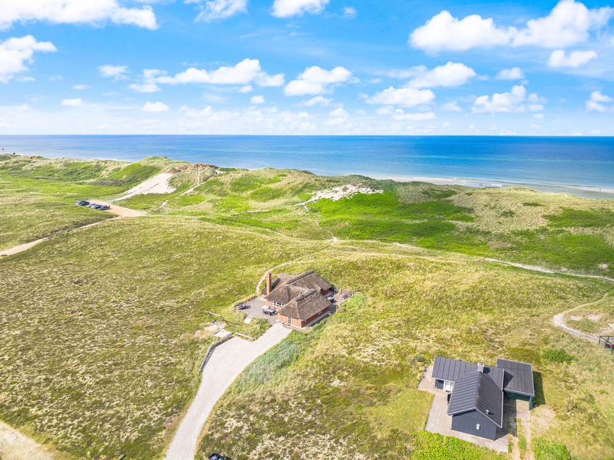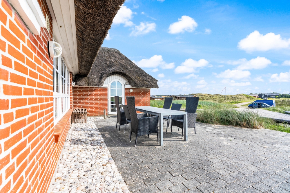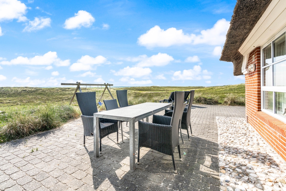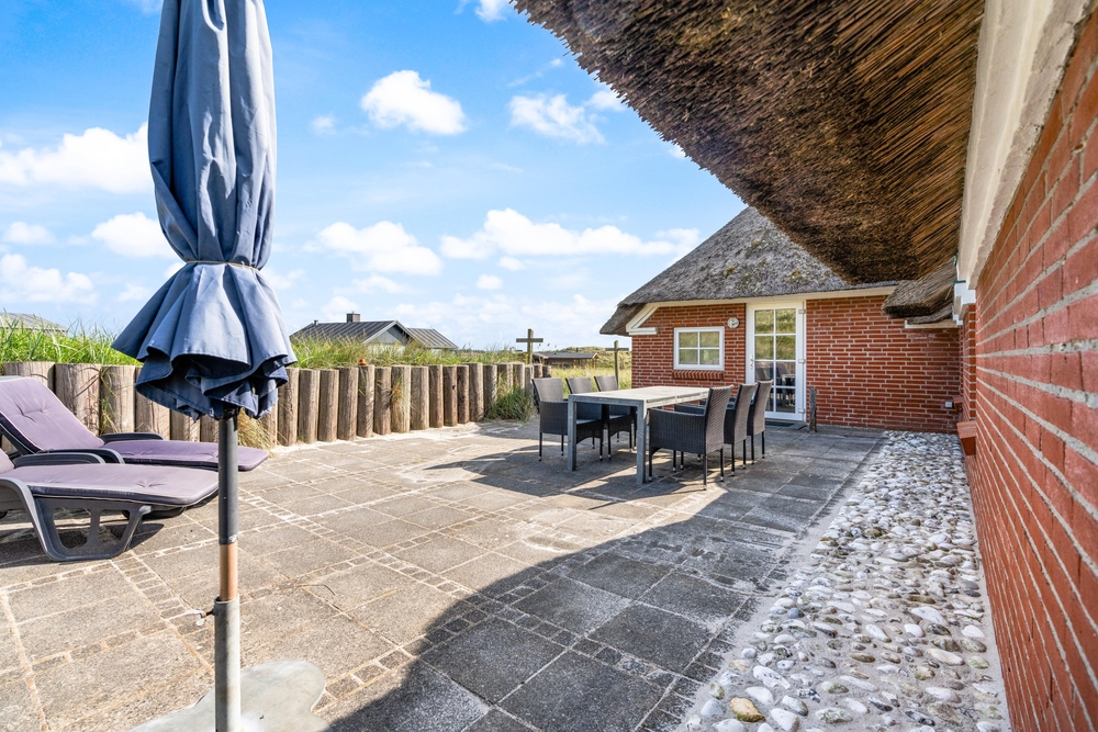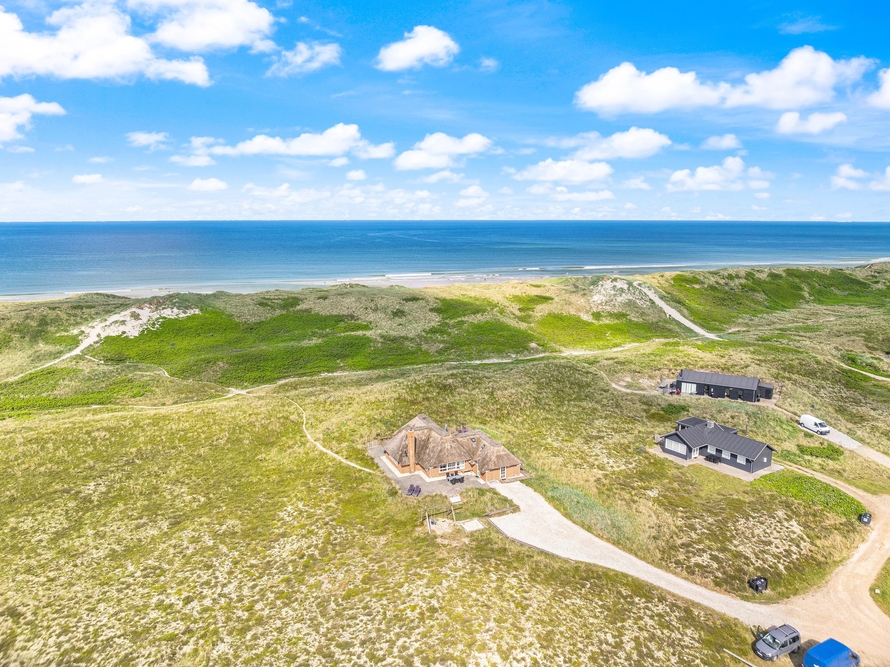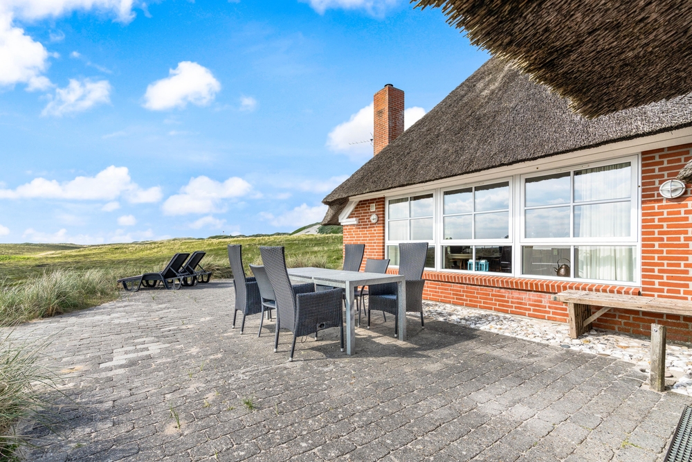 Dette store og flotte sommerhus er bygget i mursten, har stråtag og opfylder de vildeste drømme om en fantastisk ferie. Feriehuset er stort og rummeligt og har en flot indretning. Fra den hyggelige stue er der udsigt til endeløse hedeområder og de høje klitter. Her er et velindrettet køkken og flot opholdsstue, der står i åben forbindelse med hinanden med klinkegulve og gulvvarme.