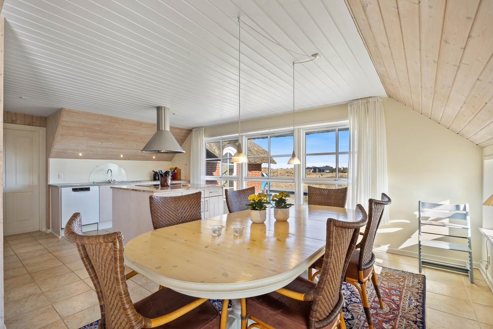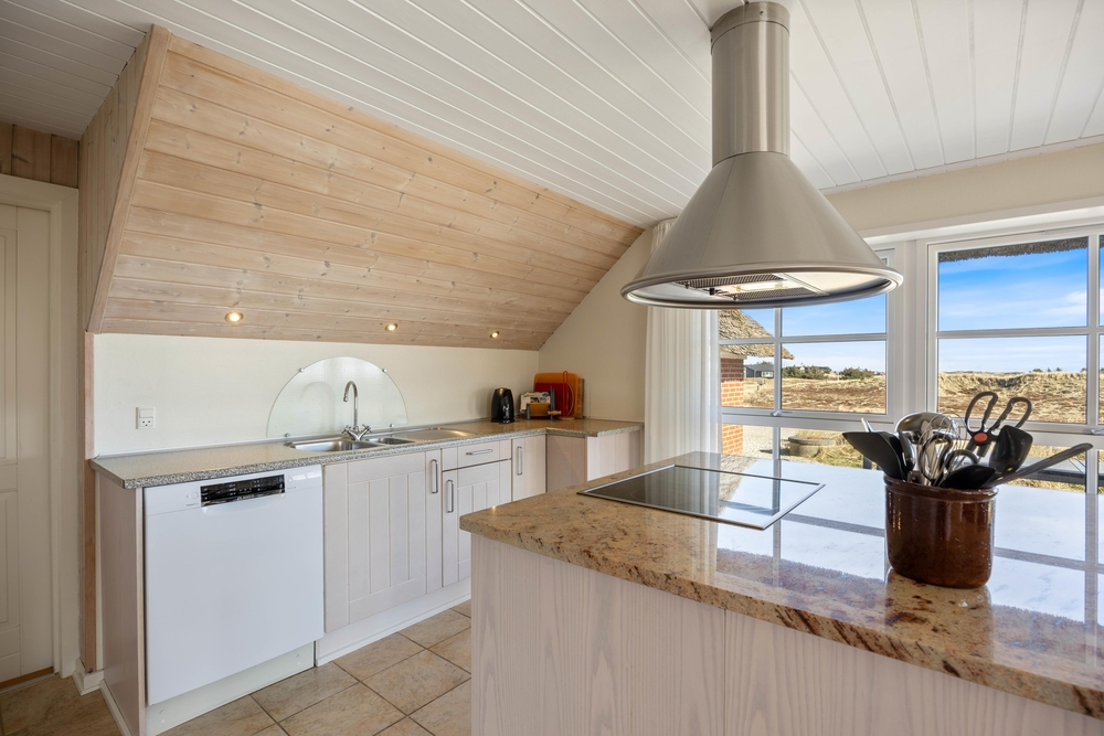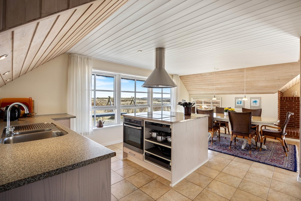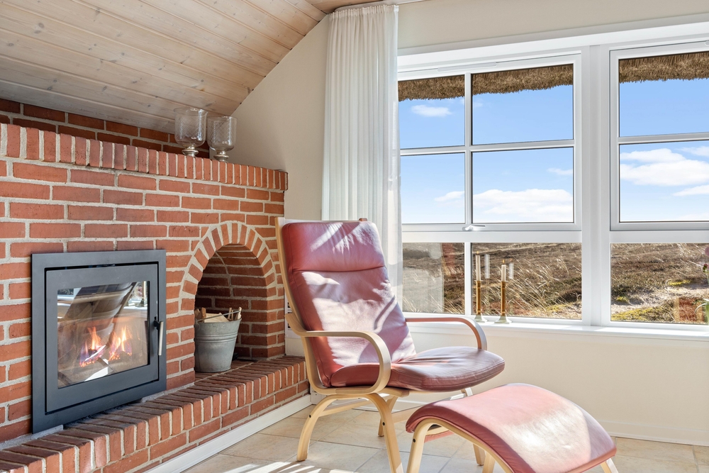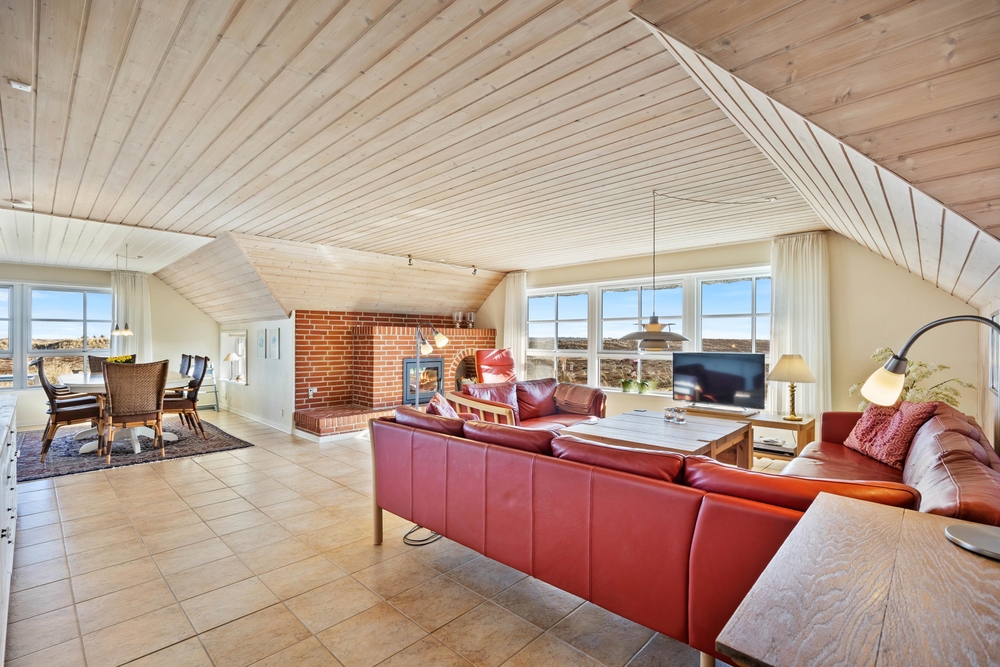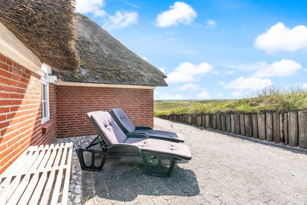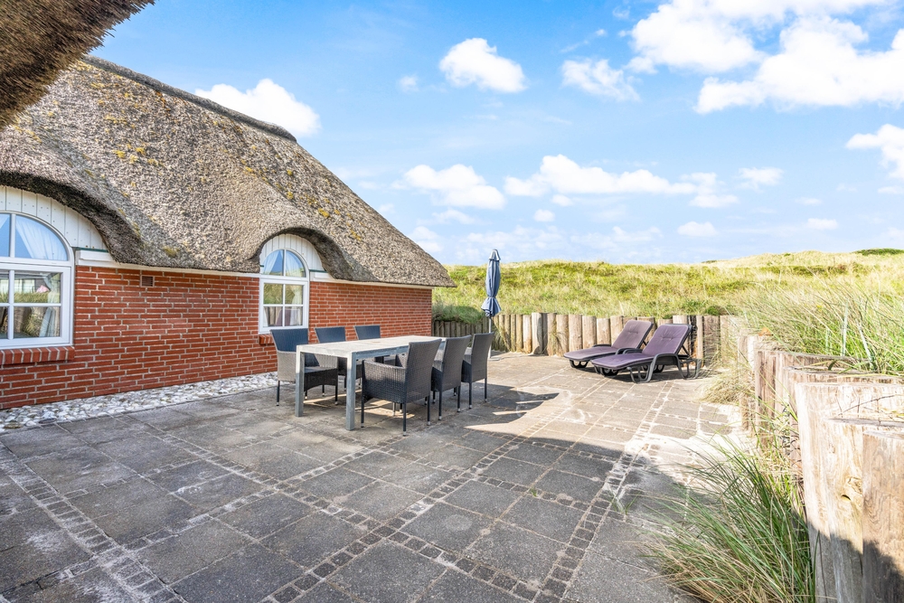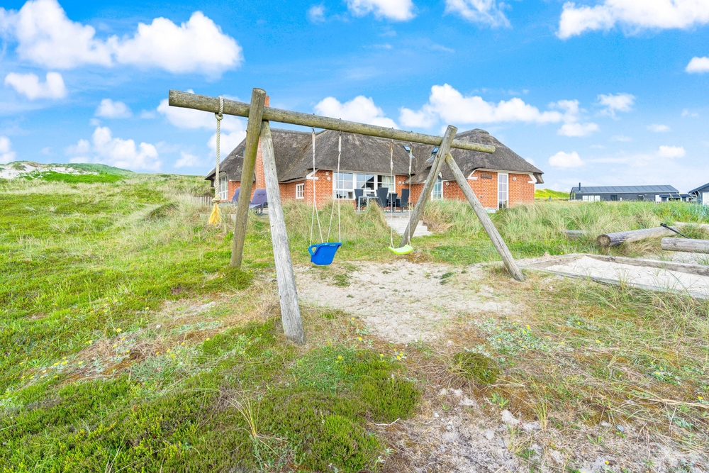 Dette store og flotte sommerhus er bygget i mursten, har stråtag og opfylder de vildeste drømme om en fantastisk ferie. Feriehuset er stort og rummeligt og har en flot indretning. Fra den hyggelige stue er der udsigt til endeløse hedeområder og de høje klitter. Her er et velindrettet køkken og flot opholdsstue, der står i åben forbindelse med hinanden med klinkegulve og gulvvarme.