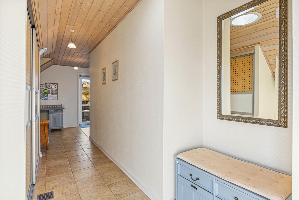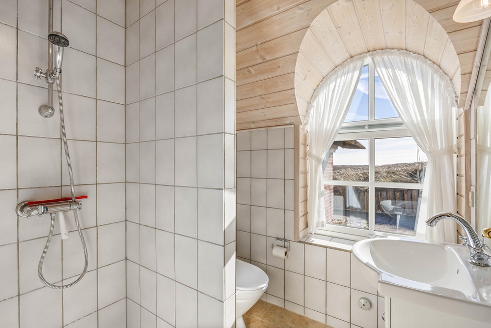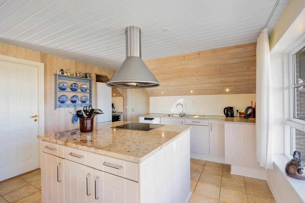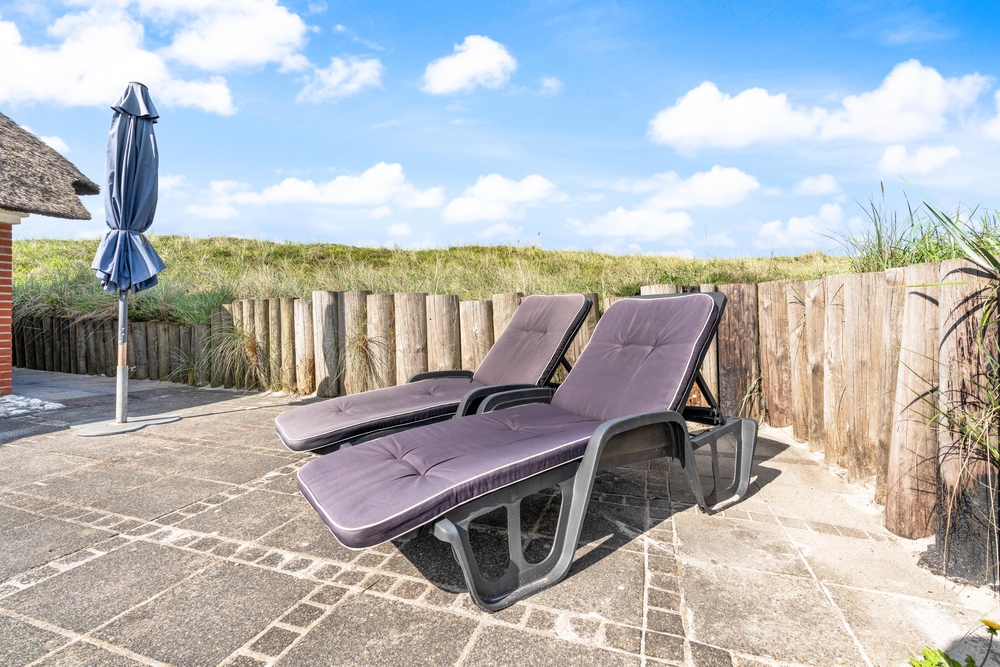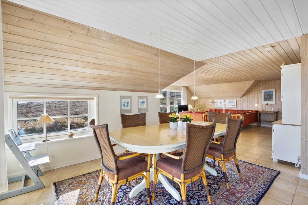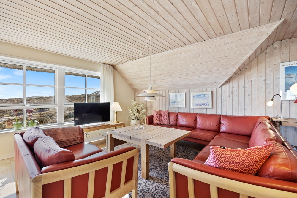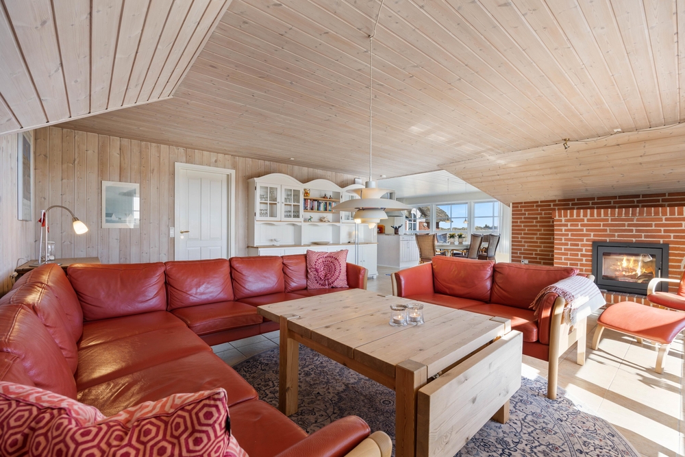 Dette store og flotte sommerhus er bygget i mursten, har stråtag og opfylder de vildeste drømme om en fantastisk ferie. Feriehuset er stort og rummeligt og har en flot indretning. Fra den hyggelige stue er der udsigt til endeløse hedeområder og de høje klitter. Her er et velindrettet køkken og flot opholdsstue, der står i åben forbindelse med hinanden med klinkegulve og gulvvarme.