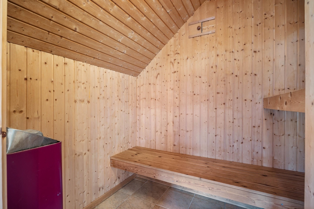 Sommerhuset ligger fuldstændig uforstyrret og er omgivet af naturligt afskærmede terrasser, som er udstyret med havemøbler, liggestole og grill. Til børnene er der både sandkasse og gyngestativ.
