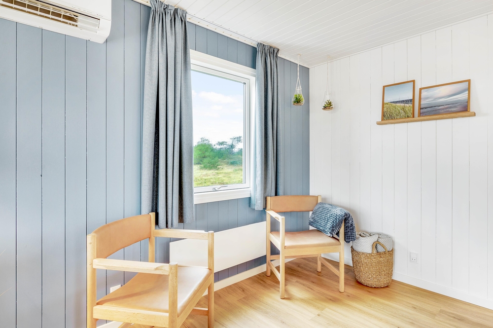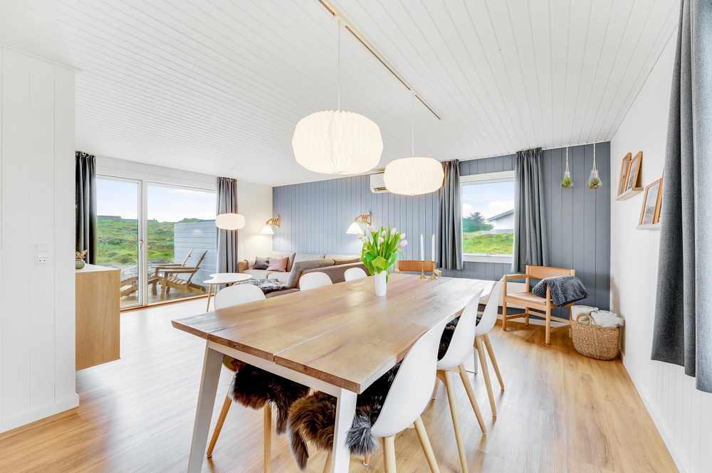 I sommerhuset venter jer en pænt møbleret, moderne stue med et hyggeligt sofahjørne. Her kan I tilbringe mange gode stunder med familien, mens I ser jeres yndlingsfilm, som kan streames via. chromecasten.