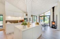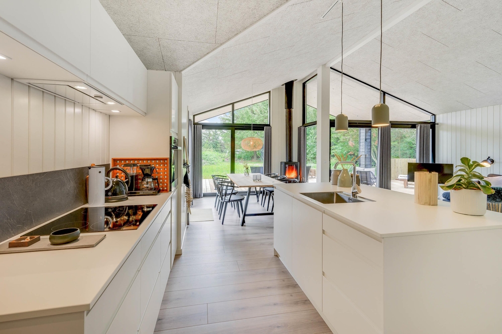 De store panoramavinduer åbner op for en skøn udsigt til grunden og inviterer lyset ind i stuen. I det hyggelige stuehjørne kan I slappe af med kortspil ? eller læse en god bog, henslængt i sofaen foran den knitrende ild i brændeovnen.