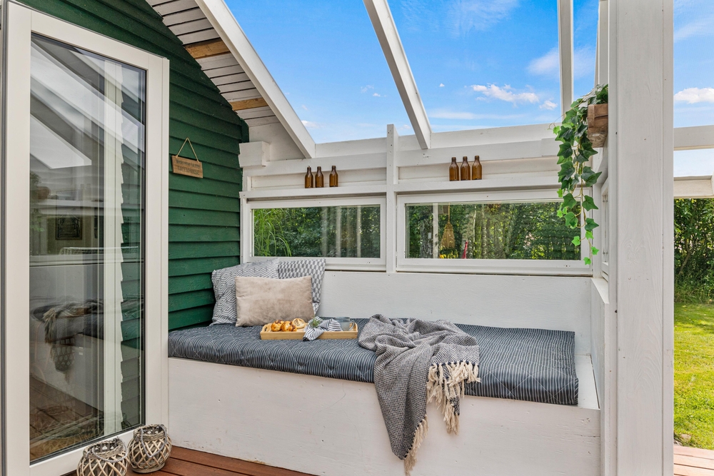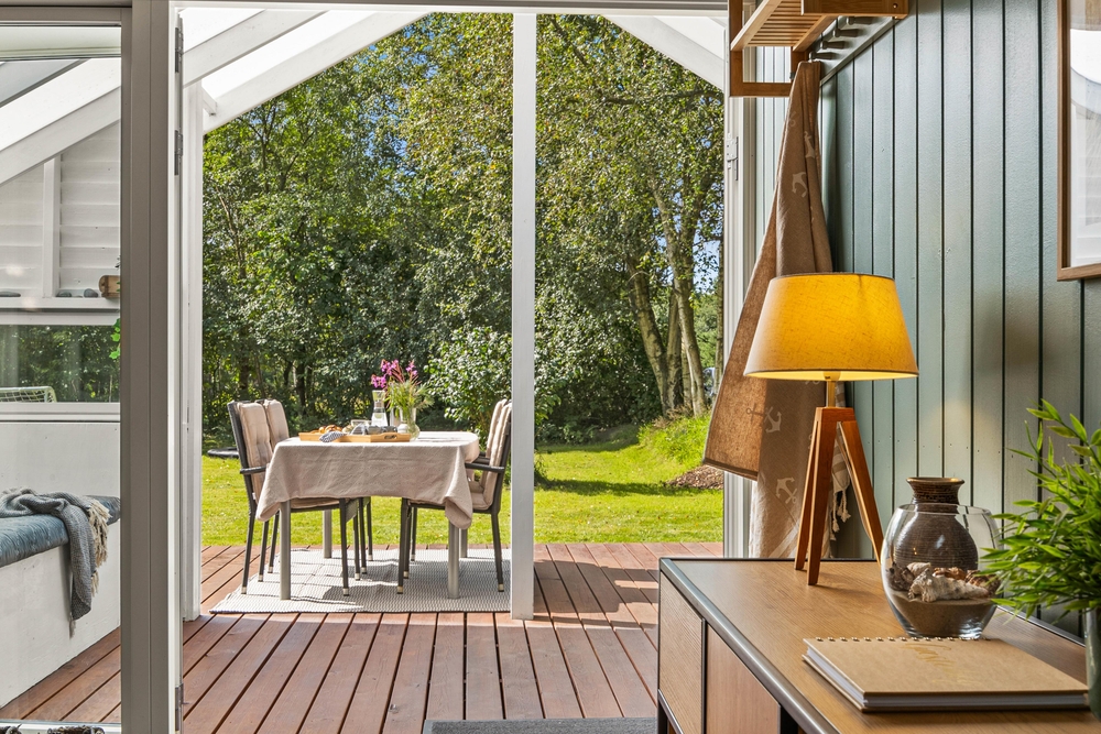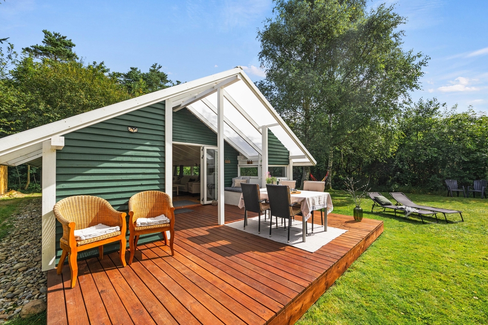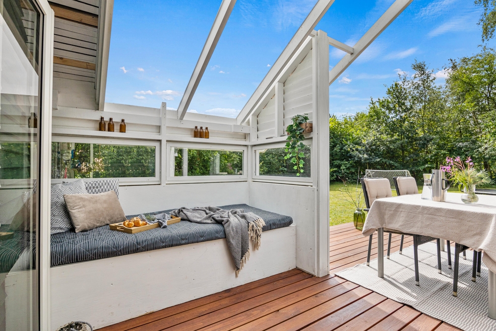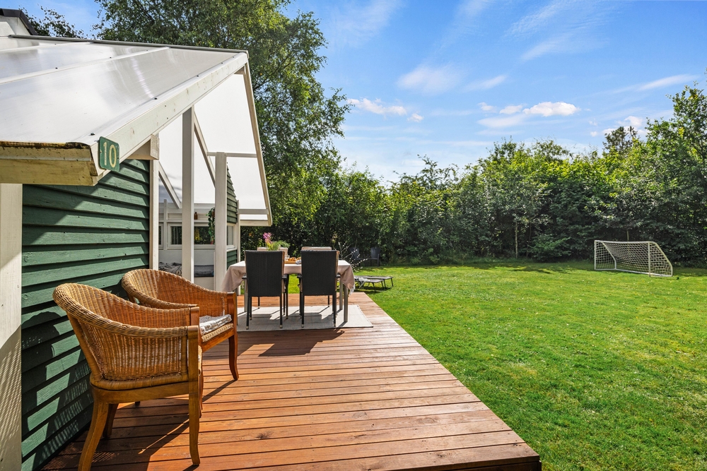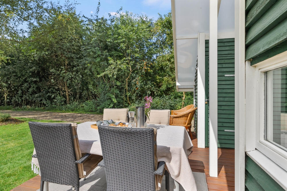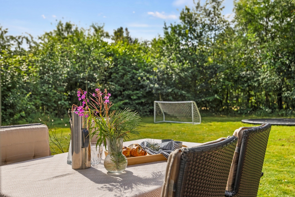 Fra stuen kan I gå direkte ud på terrassen, der delvist er overdækket, så I kan sidde udenfor, selv hvis det skulle dryppe lidt, eller gå i skygge, når solen bager ned. Den indbydende træterrasse er udstyret med komfortable havemøbler og solvogne, der opfordrer til afslappende timer med en god bog eller et forfriskende glas vin i hånden. Mens I nyder udsigten til den smukke have, kan I lade grillkullene blive klar til en lækker middag under åben himmel.