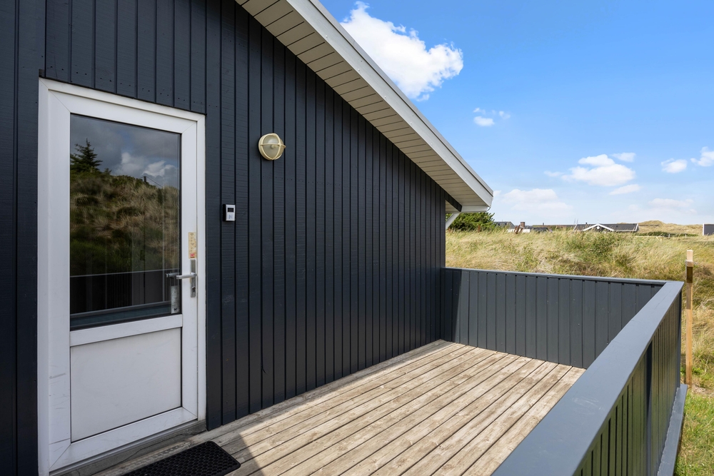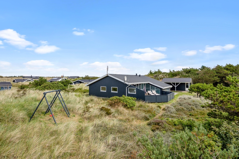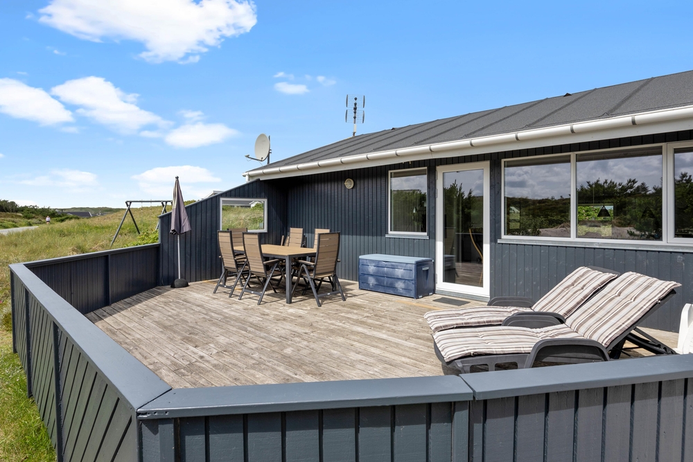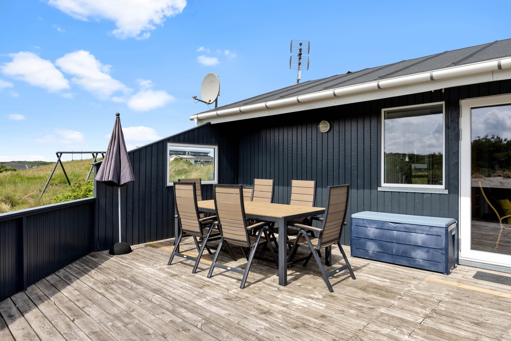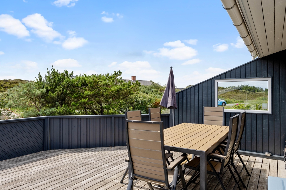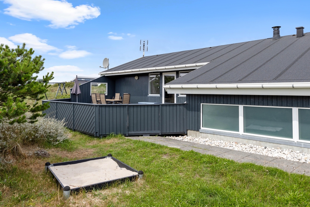 Fra opholdsrummet har I udgang til en afskærmet og lukket terrasse, som indbyder til mange hyggelige stunder på lune sommerdage. Her kan I tænde op i grillen og tilberede et lækkert aftensmåltid, mens solen går ned bag klitterne. Sommerhuset ligger på en dejlig naturgrund med gyngestativ, hvor børnene kan lege, mens kødet grilles færdigt.