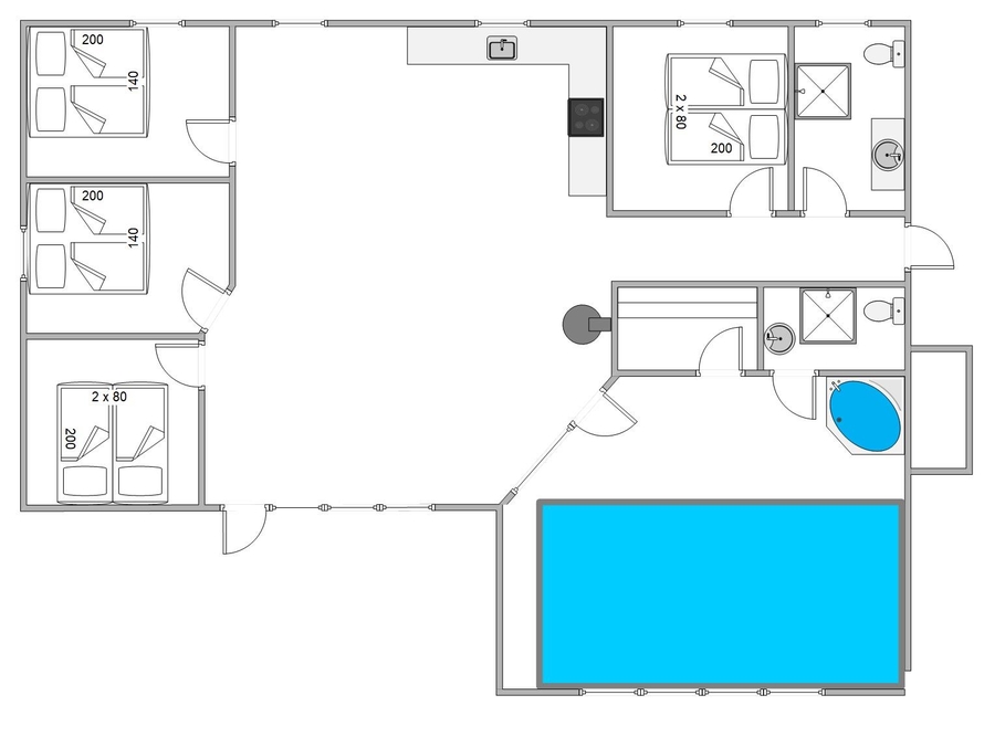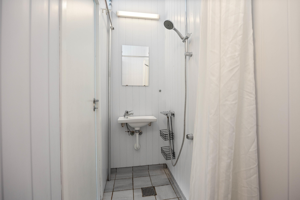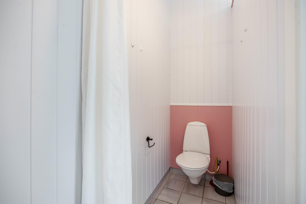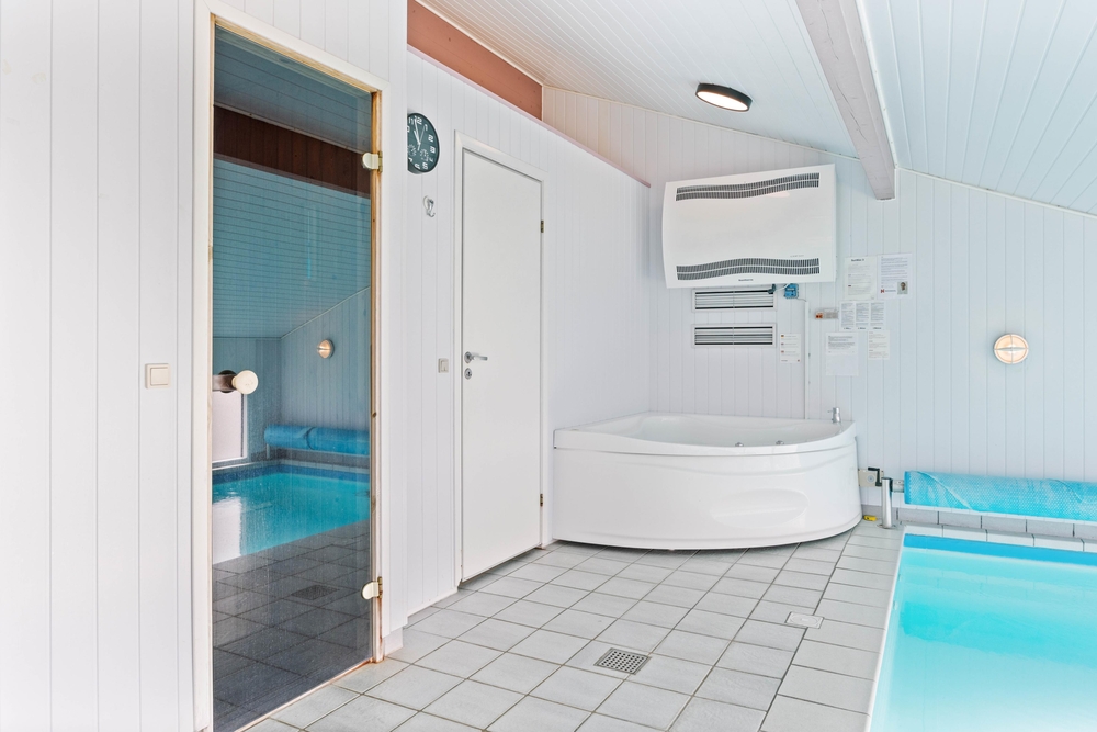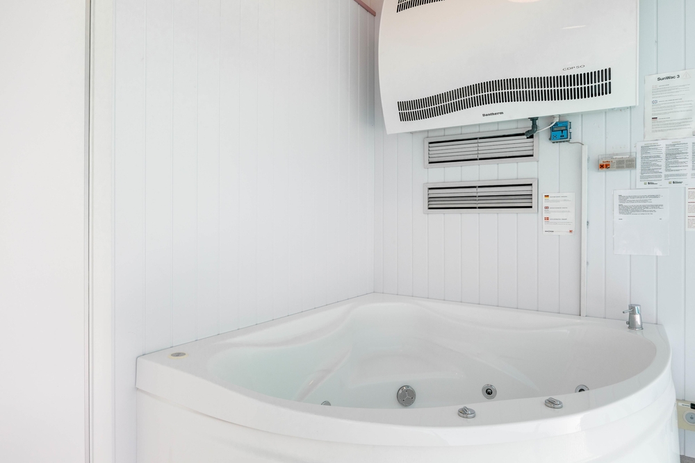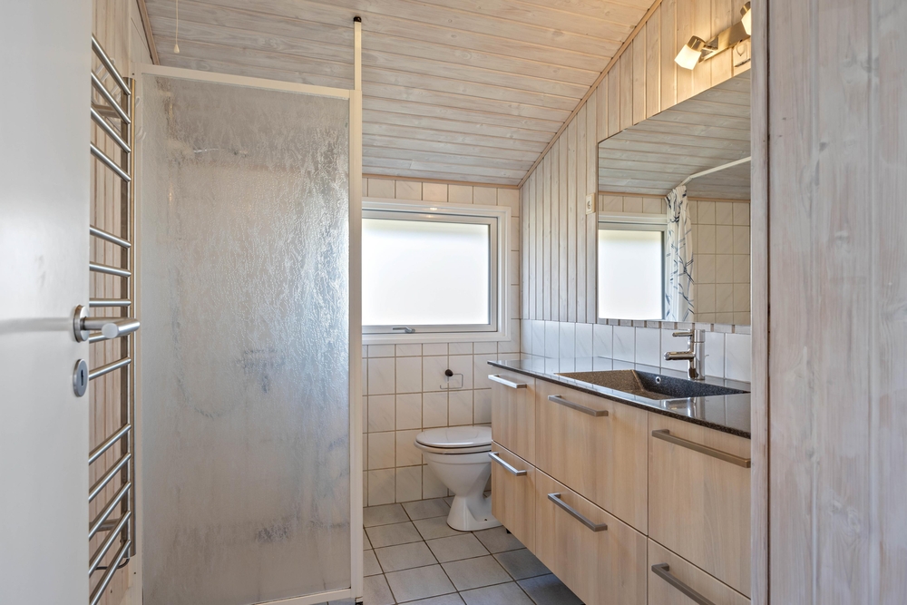 I feriehuset finder I hele 2 badeværelser, hvoraf det ene ligger i forbindelse med poolrummet. Der er gulvvarme på badeværelserne, og desuden er der både vaskemaskine og tørretumbler i sommerhuset.