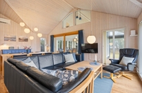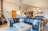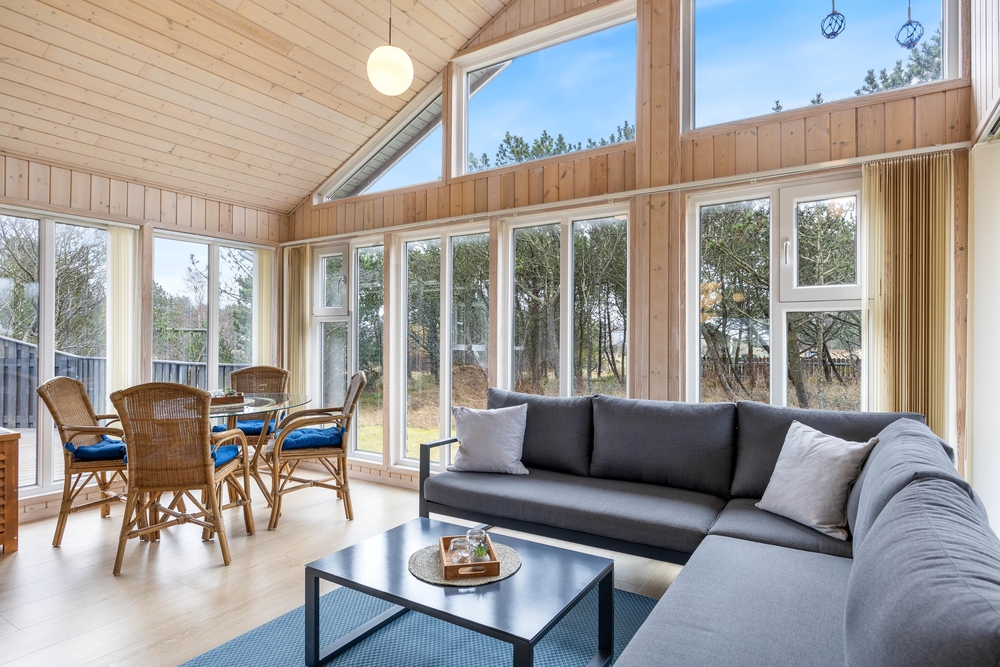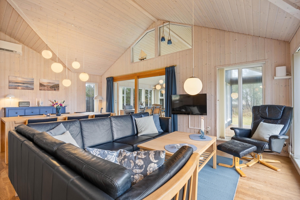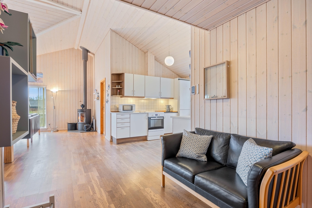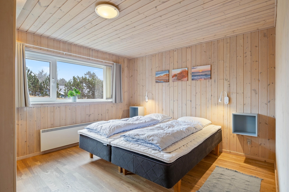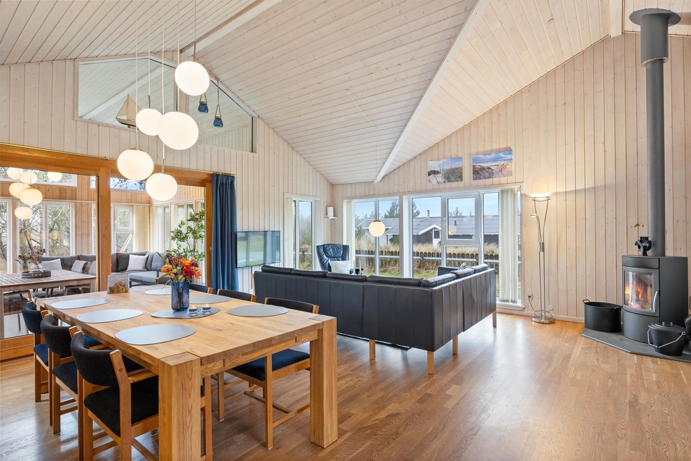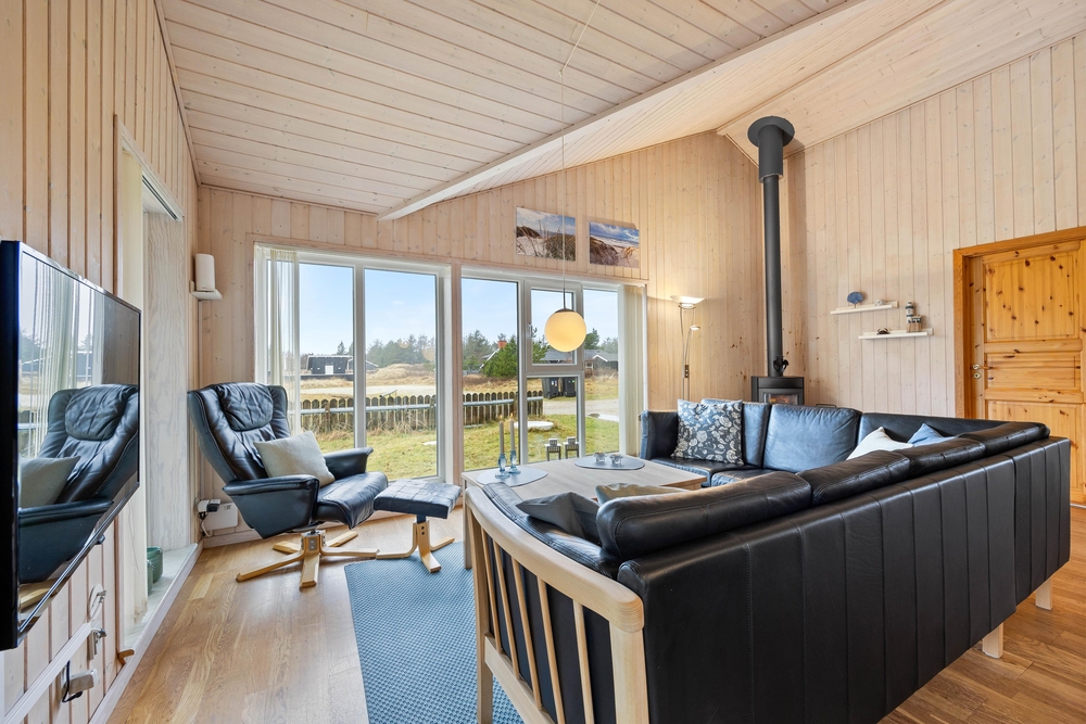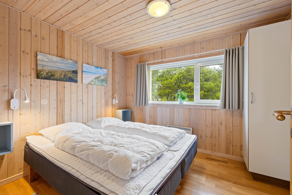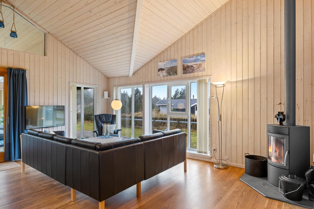 På Bjerregårdsvej 21 venter jer et dejligt sommerhus med plads til 6 gæster. Tag også gerne hundene med ? De er velkomne her. Sommerhuset er hyggeligt indrettet med lyse trævægge, komfortable møbler og med højt til loftet, hvilket, sammen med de store vinduer, skaber en luftig fornemmelse og lukker det helt specielle lys ind. En varmepumpe sørger for et behageligt indeklima sammen med den hyggelige brændeovn.