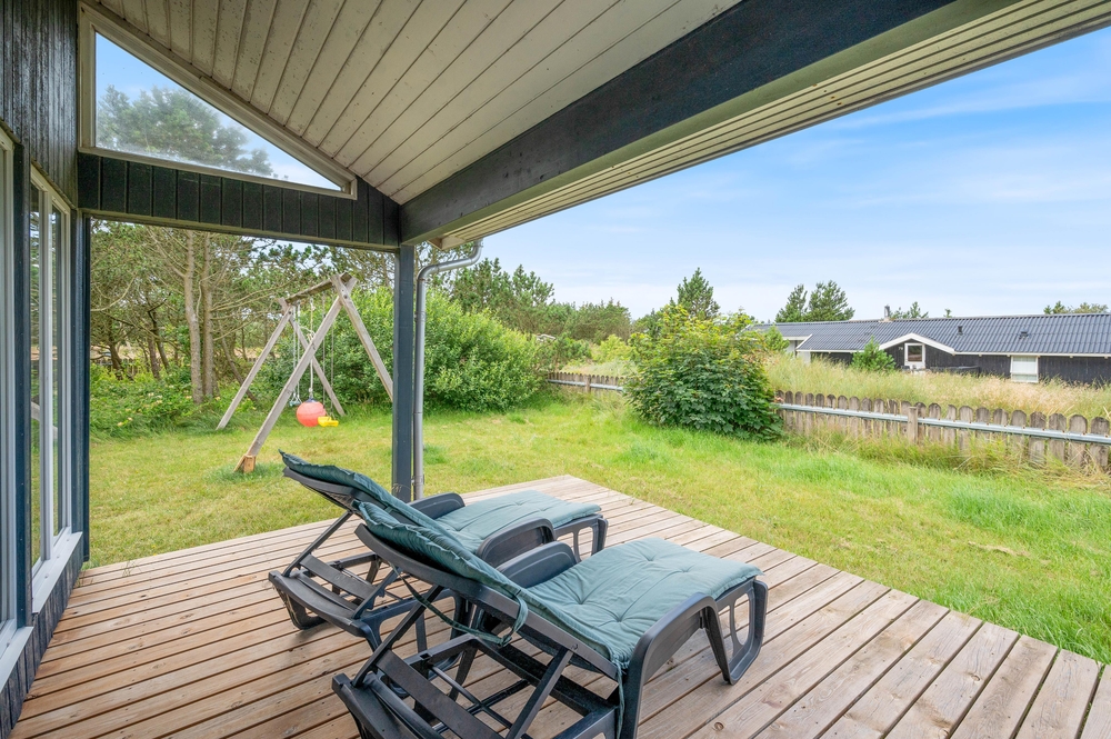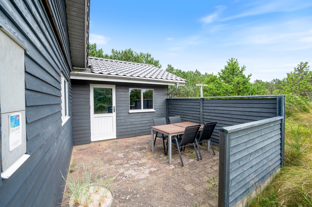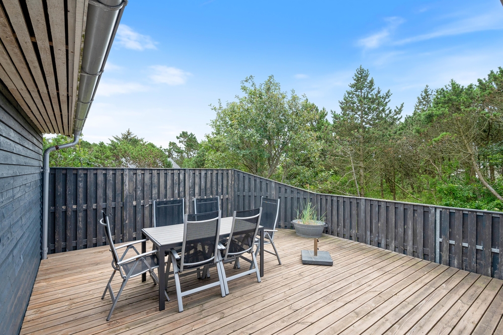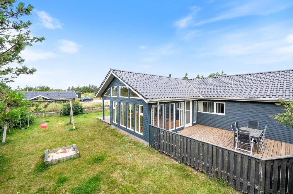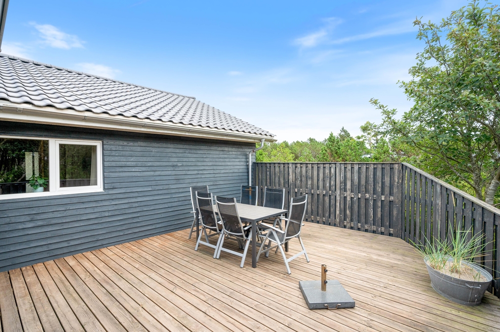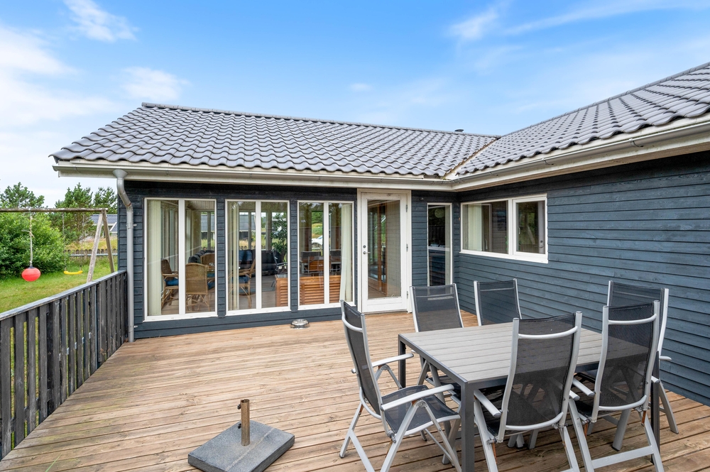 Fra udestuen er der udgang til de lukkede terrasser med mulighed for altid at kunne finde læ. Vestterrassen er delvist overdækket, den øst og sydøst-vendte er noget større og strækker sig på hele sommerhusets bagside. På naturgrunden er der gynge og sandkasse. Den rummelige garage er til disposition.