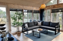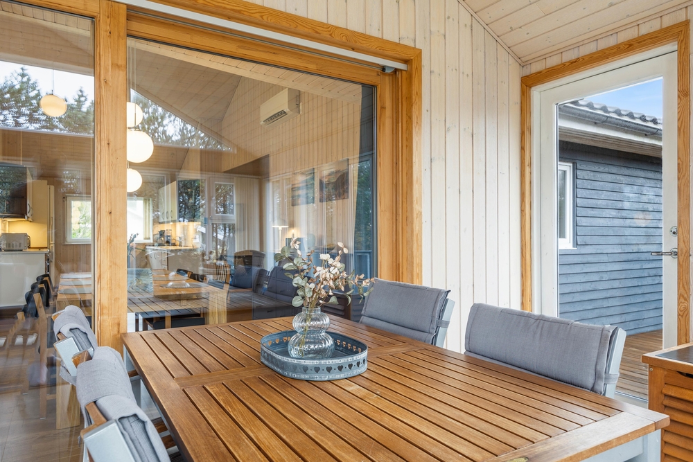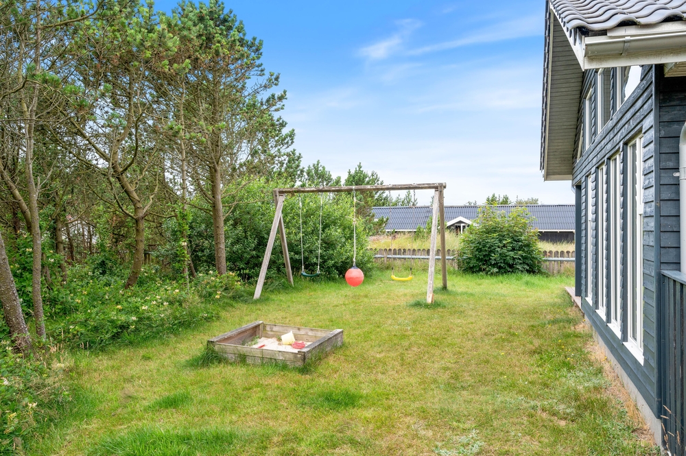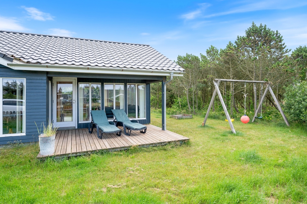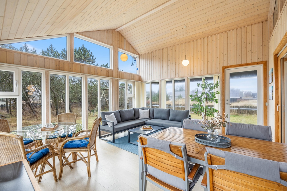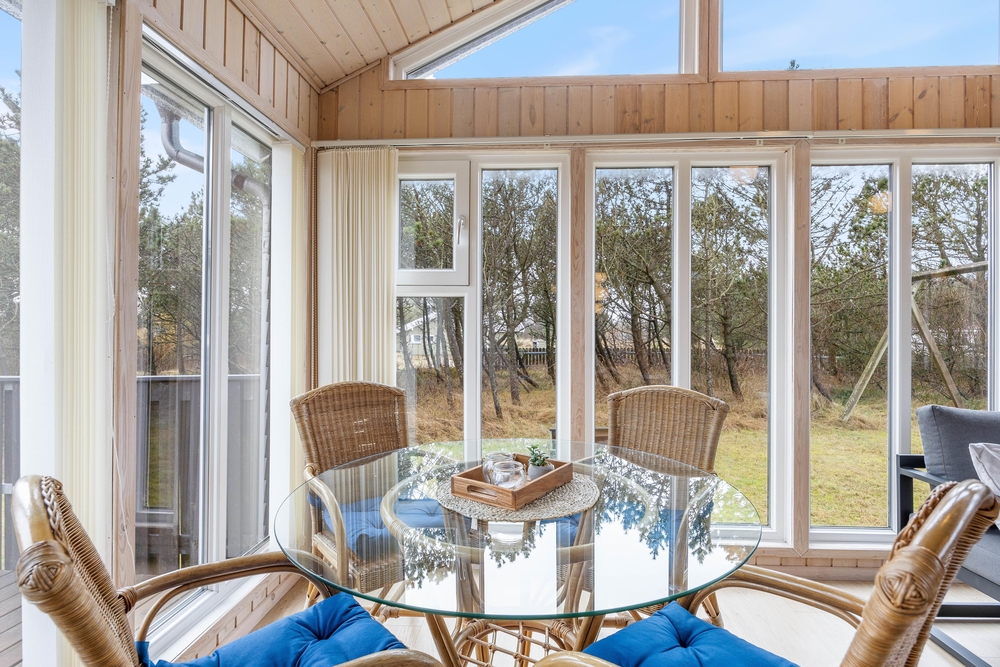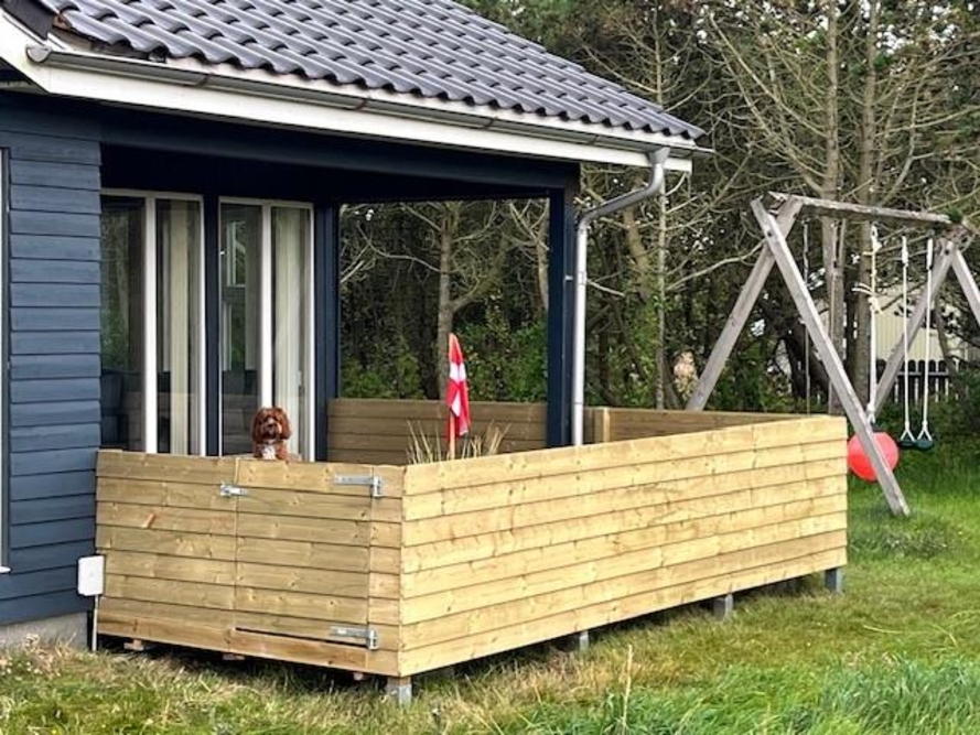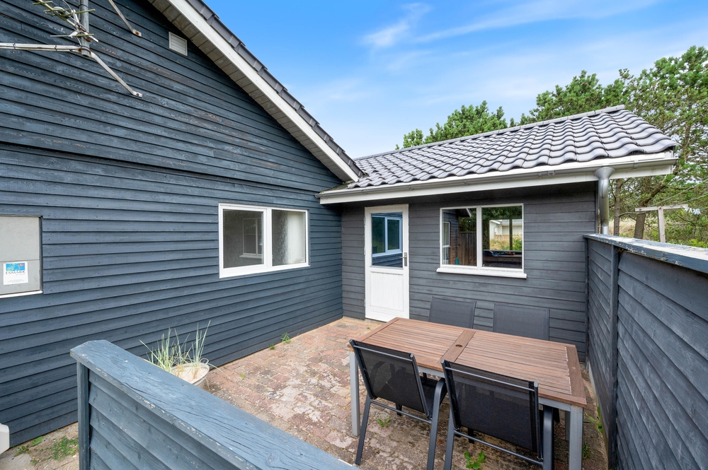 Fra udestuen er der udgang til de lukkede terrasser med mulighed for altid at kunne finde læ. Vestterrassen er delvist overdækket, den øst og sydøst-vendte er noget større og strækker sig på hele sommerhusets bagside. På naturgrunden er der gynge og sandkasse. Den rummelige garage er til disposition.