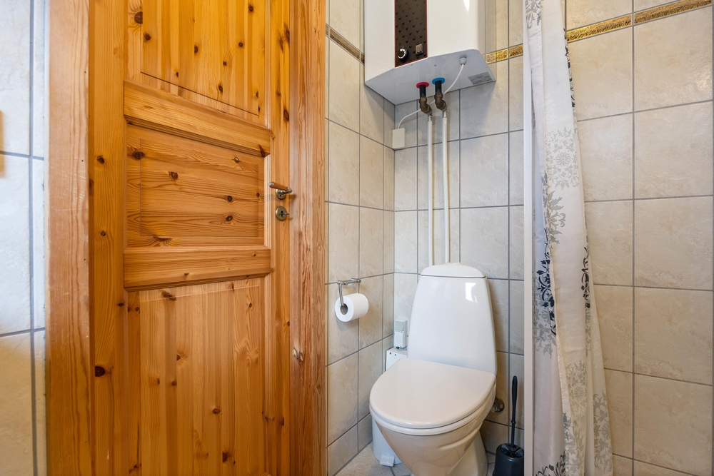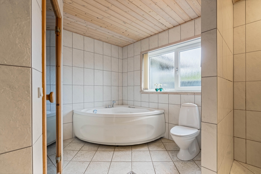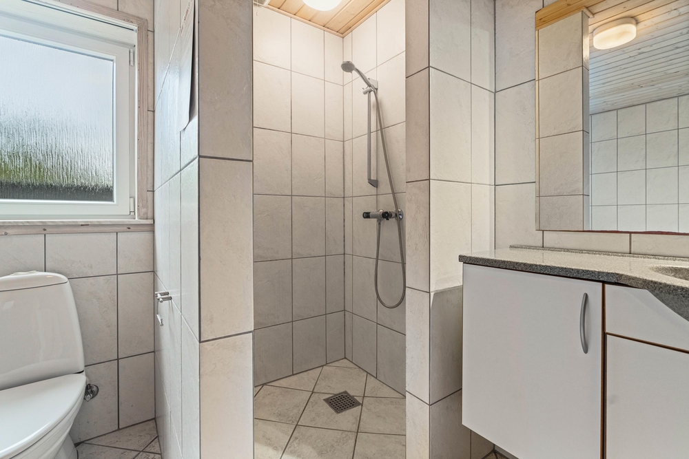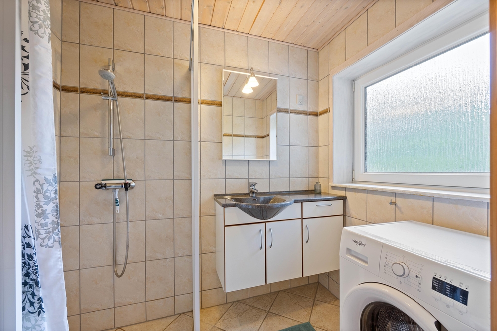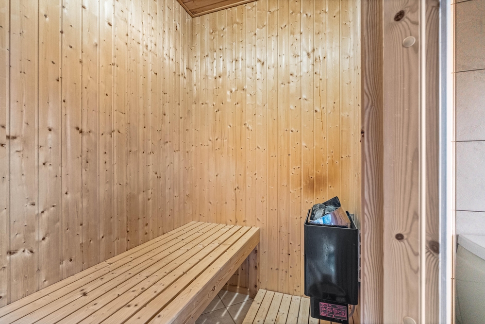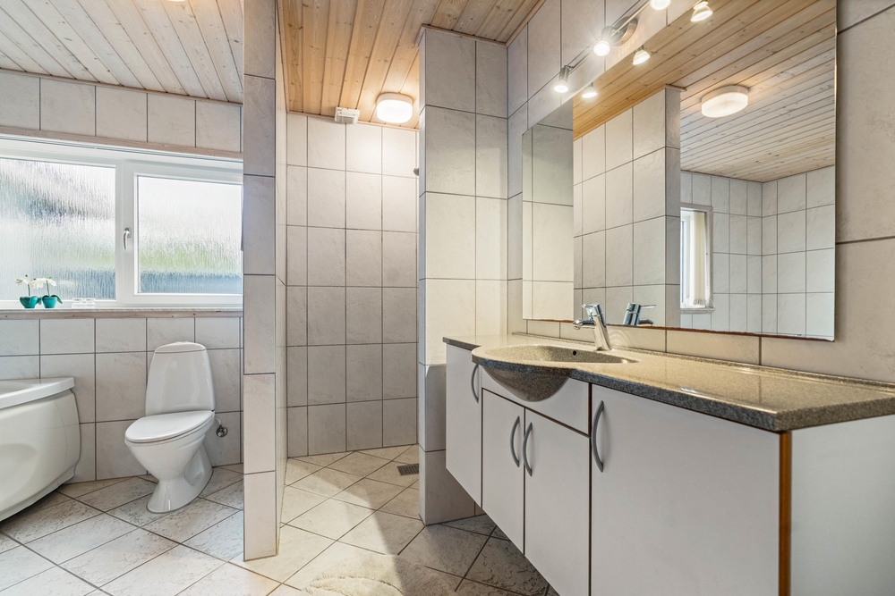 De 2 badeværelser er begge med gulvvarme og bruseniche. På det lille badeværelse findes der vaskemaskine, mens det store badeværelse inviterer til afslapning og selvforkælelse. Her er der nemlig både spa og sauna, hvor I kan koble af og nyde varmen og et efterfølgende bad.