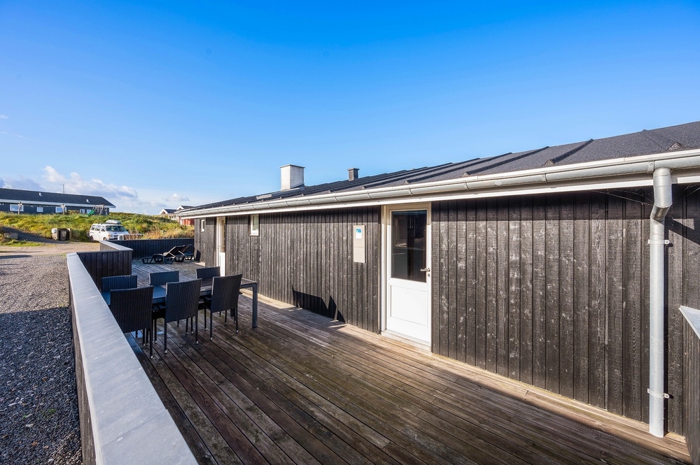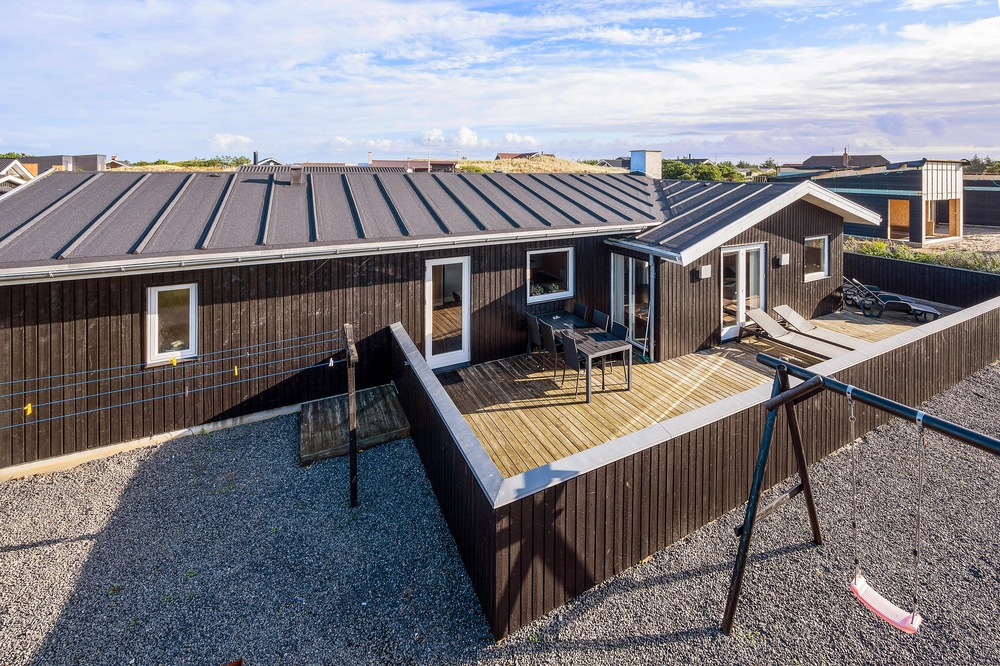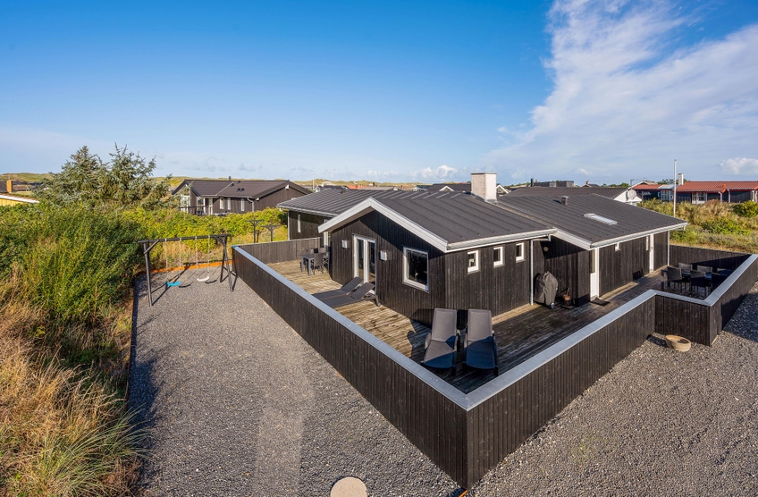 Sommerhuset er roligt beliggende for enden af en lille stikvej, kun få hundrede meter fra stranden. Her er en fin lukket terrasse med havemøbler, liggestole og grill. Til de mindste er der opsat gynger på den fine naturgrund.