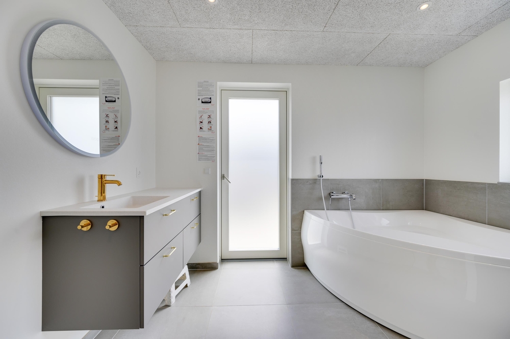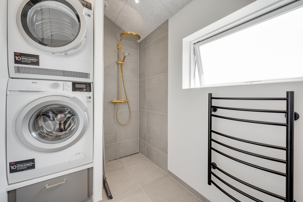 De 2 badeværelser er udstyret med gulvvarme, og på det ene står et badekar klar efter en frisk gåtur ved Vesterhavet. Desuden er der også både vaskemaskine og tørretumbler.
