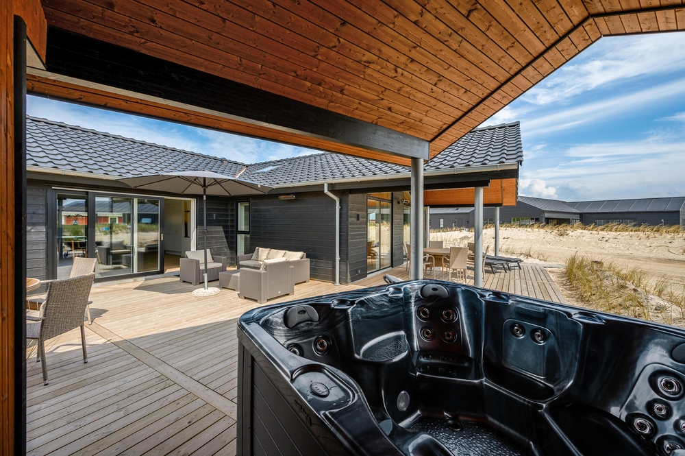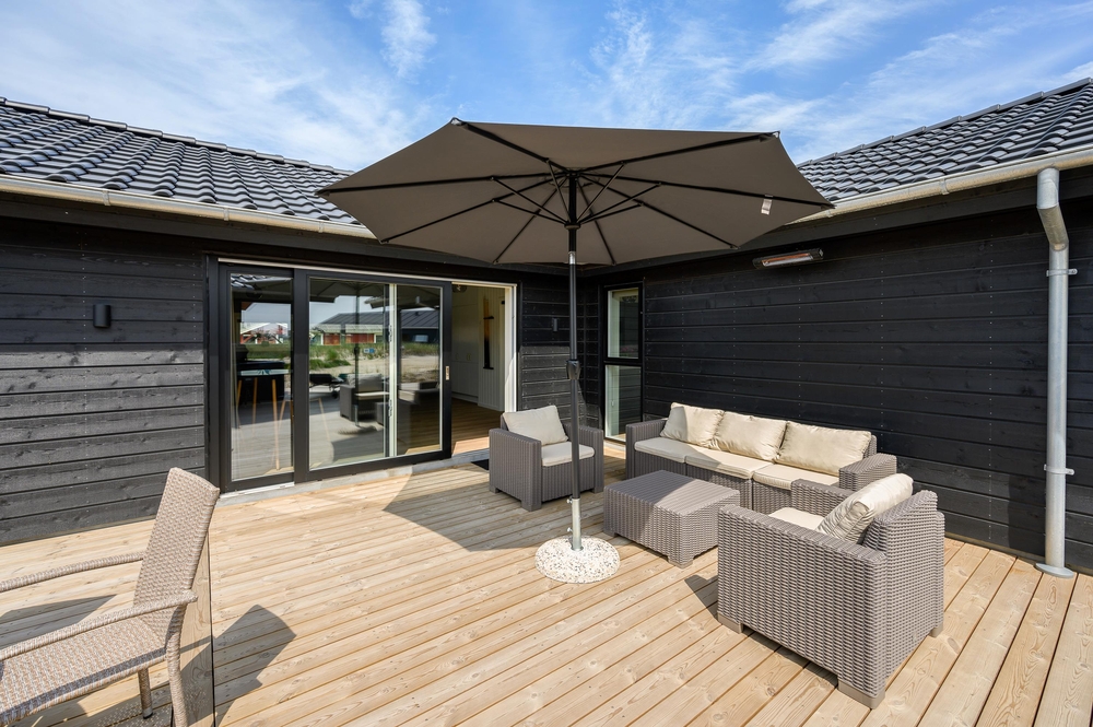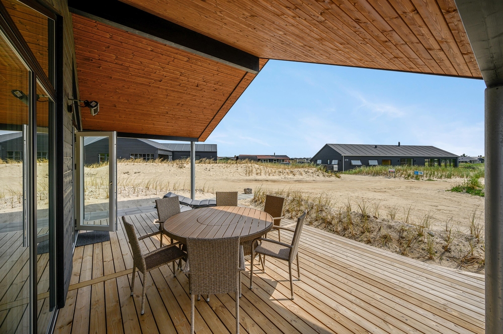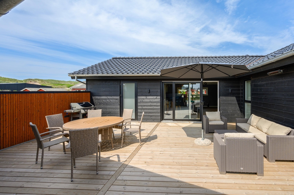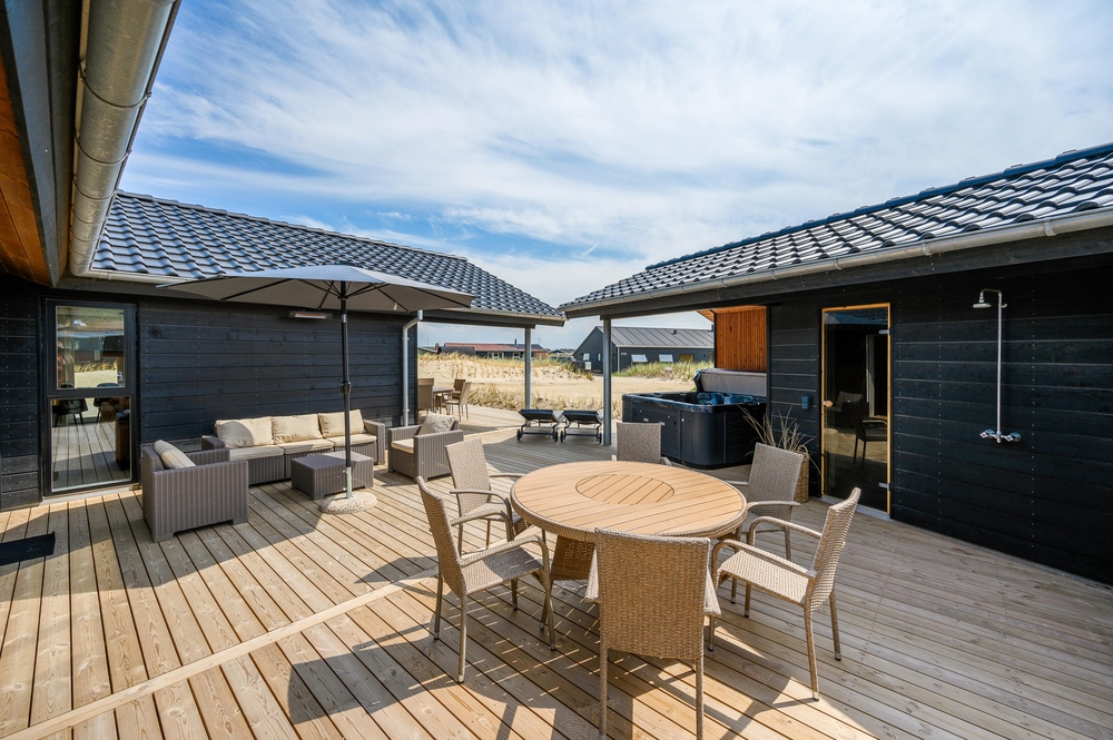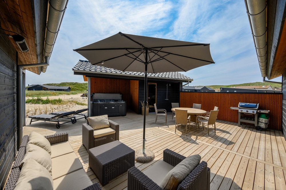 Med direkte adgang fra den moderne stue, aktivitetsrummet og et badeværelse kommer I til det luksuriøse udendørsområde ved sommerhuset. En sand oase til afslapning venter jer her. På den store træterrasse finder du et stort udvalg af komfortable havemøbler, der står klar til en hyggelig grillaften, hvortil der er gasgrill tilgængelig. Det delvist afskærmede og overdækkede udeareal giver jer læ for vind og vejr og tilstrækkelig skygge på varme sommerdage.