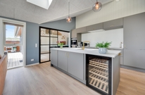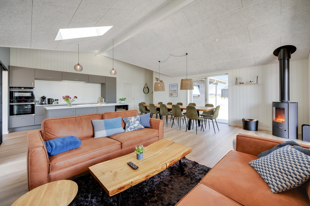 På en kølig sommeraften kan I tænde op i brændeovnen, som spreder både varme og ekstra hyggelig feriestemning. Det naturlige lysindfald fra vinduespartiet og ovenlysvinduerne skaber en behagelig, lys atmosfære i hele rummet.