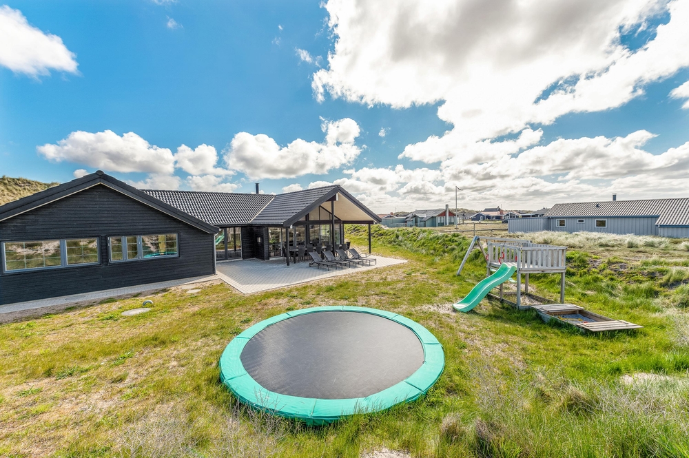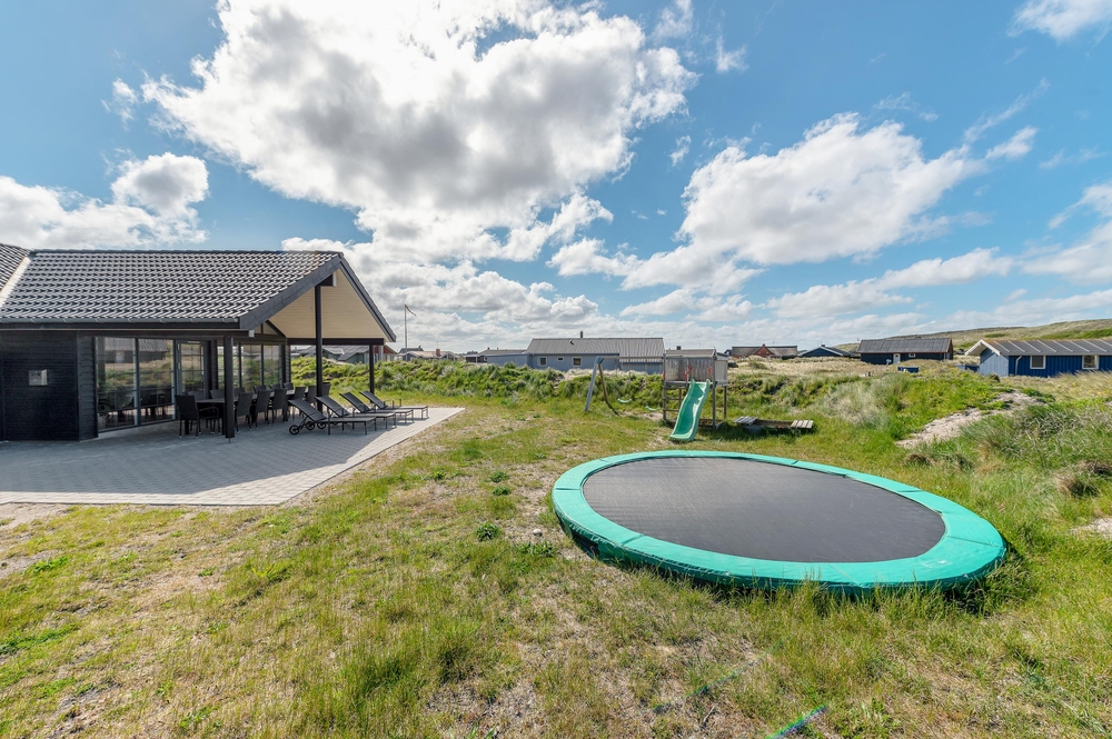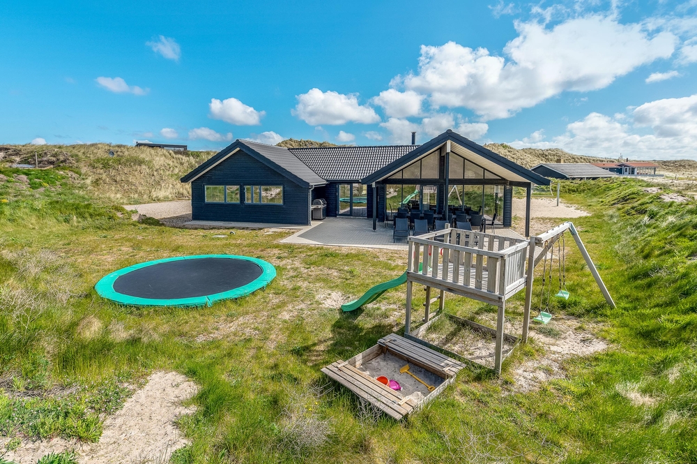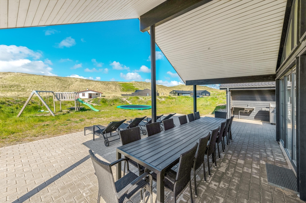 Her kan I dase i det varme vejr, mens børnene og hundene tumler på græsplænen. Der er også sat et gyngestativ op ? og på beachvolleybanen kan hele familien tage et spil volleyball. I udekøkkenet (med koldt og varmt vand) kan I gøre aftenens grillmåltid klart og holde en ægte feriemiddag i den lune aftensol.