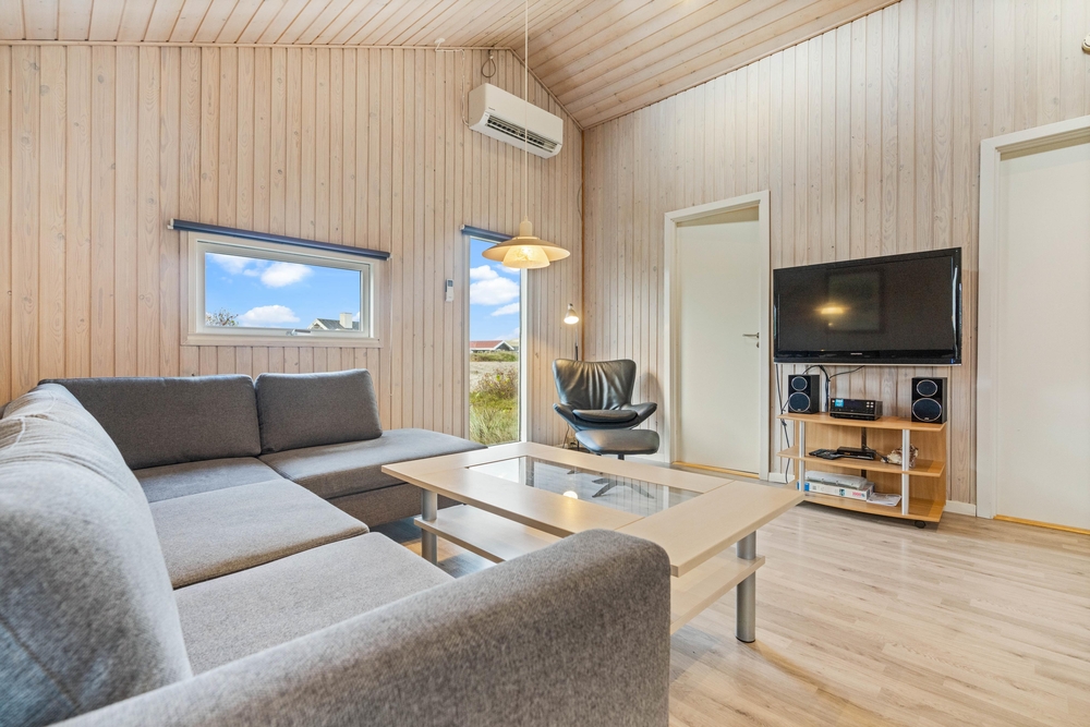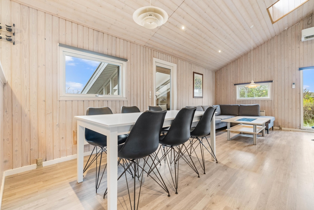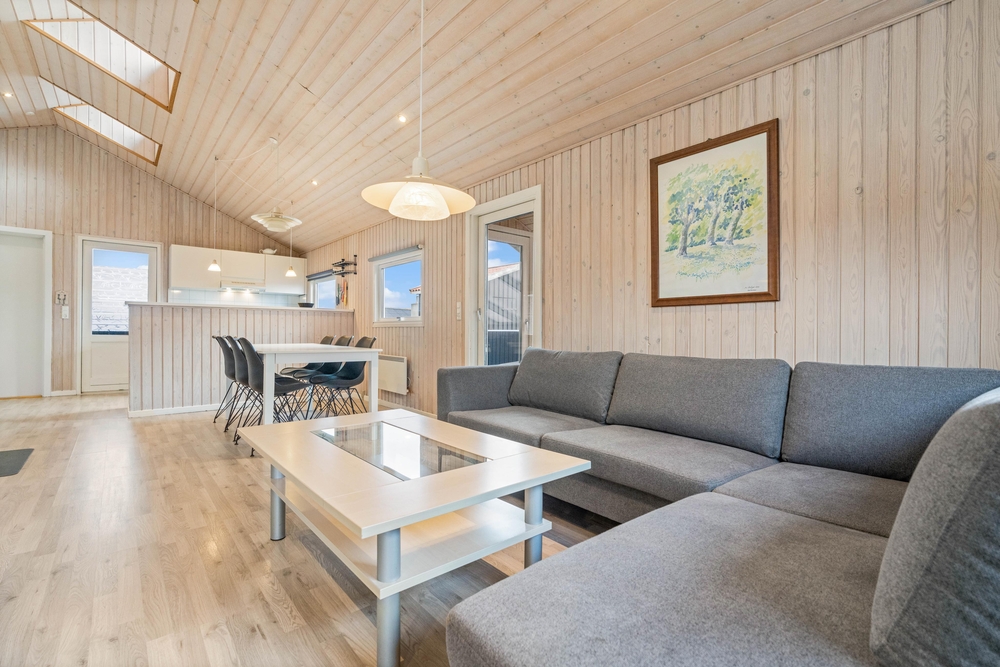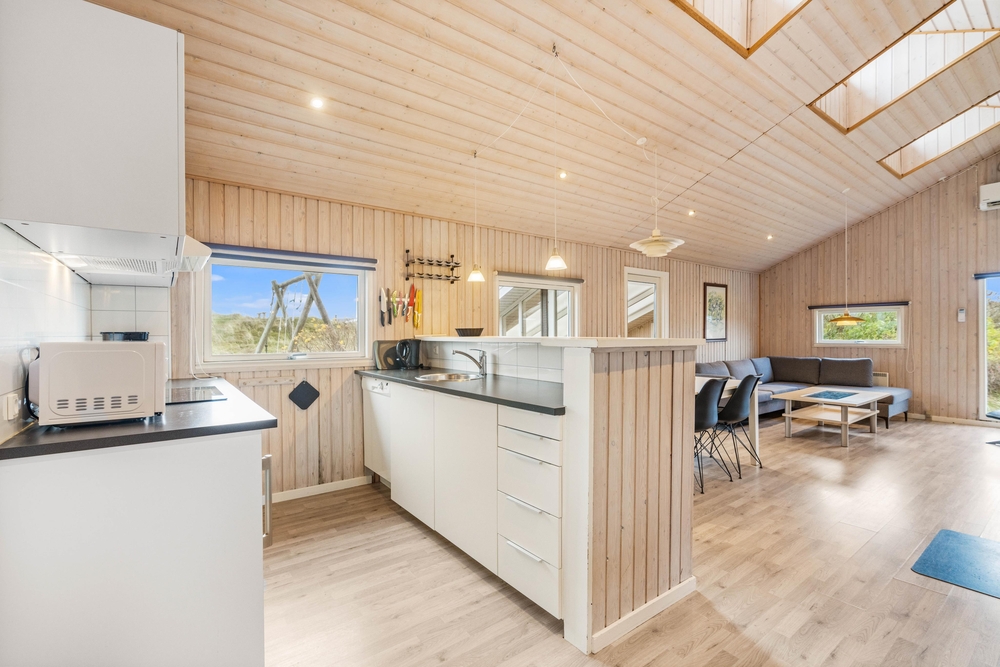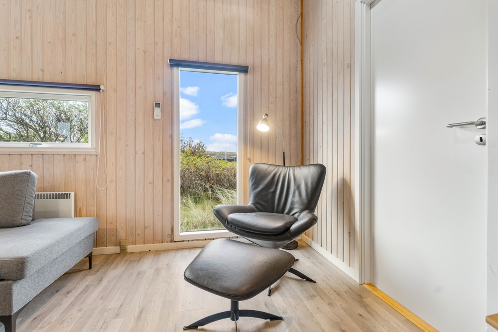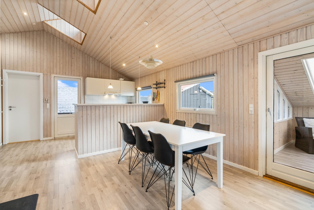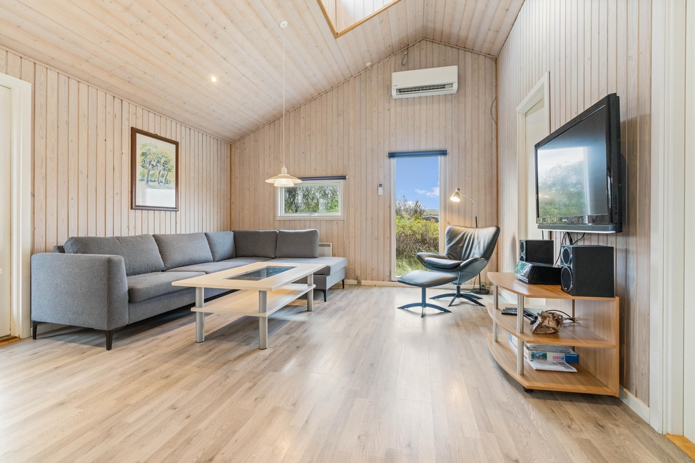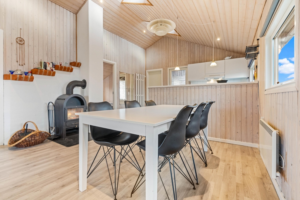 Det åbne køkken- og spisestueområde er feriehusets hjerte og indbyder til mange timers samvær og fælles madlavning. Om aftenen kan I læne jer tilbage i sofaen og hygge jer med en god film, der kan streames vha. Chromecastet. Stuens lænestol er perfekt til ferielæsningen, mens brændeovnen knitrer i baggrunden. Alrummet varmes op af en energibesparende varmepumpe.