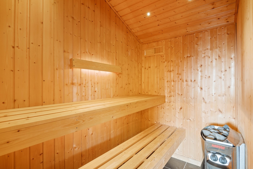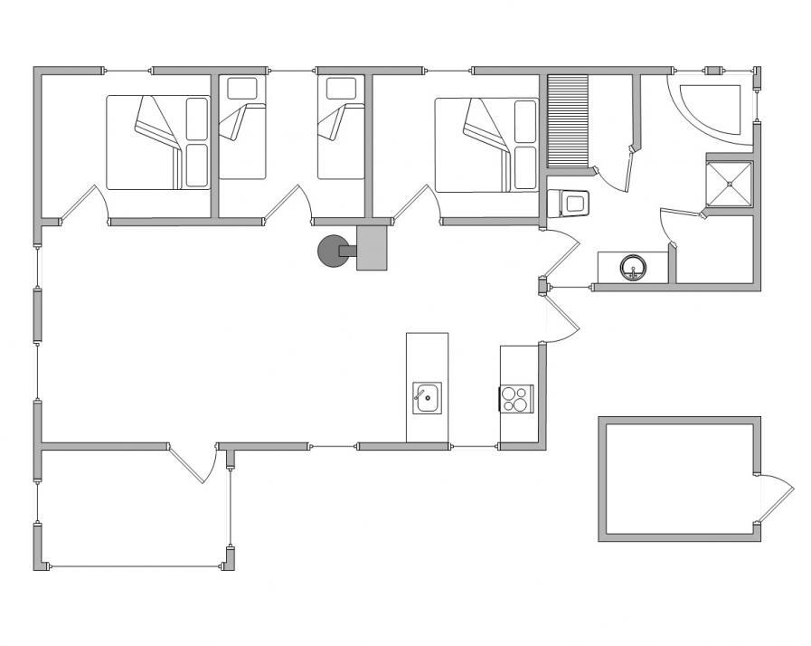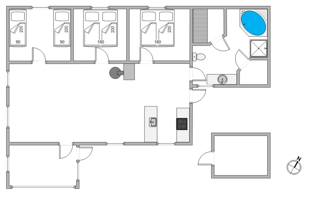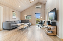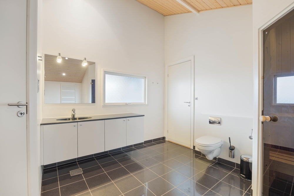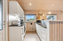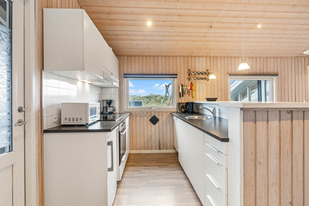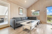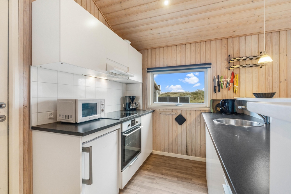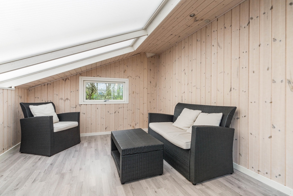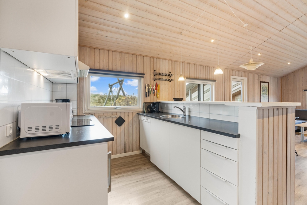 Det åbne køkken- og spisestueområde er feriehusets hjerte og indbyder til mange timers samvær og fælles madlavning. Om aftenen kan I læne jer tilbage i sofaen og hygge jer med en god film, der kan streames vha. Chromecastet. Stuens lænestol er perfekt til ferielæsningen, mens brændeovnen knitrer i baggrunden. Alrummet varmes op af en energibesparende varmepumpe.