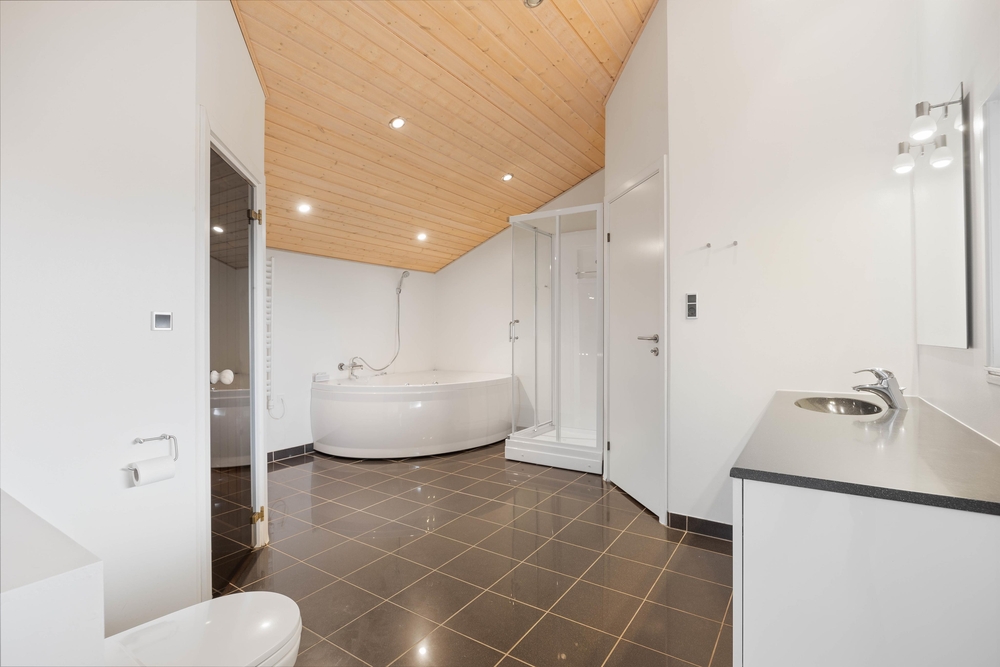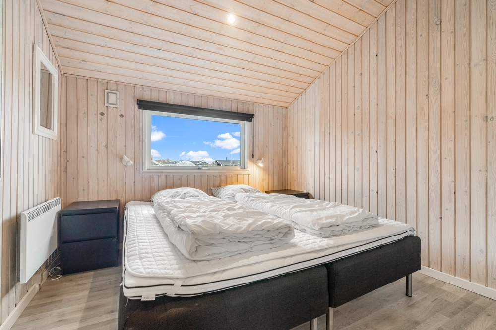 Lyst feriehus til seks personer og to hunde ? velegnet til ferie med familie eller venner. Feriehuset er rummeligt indrettet, så overalt fremstår det lyst og danner de rette ferierammer. Her er tre gode værelser med dobbeltsenge, mens I på det store badeværelse kan slappe i spabadet eller i saunaen ? perfekt efter en lang dag på farten.