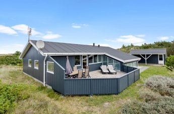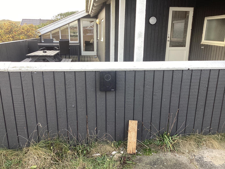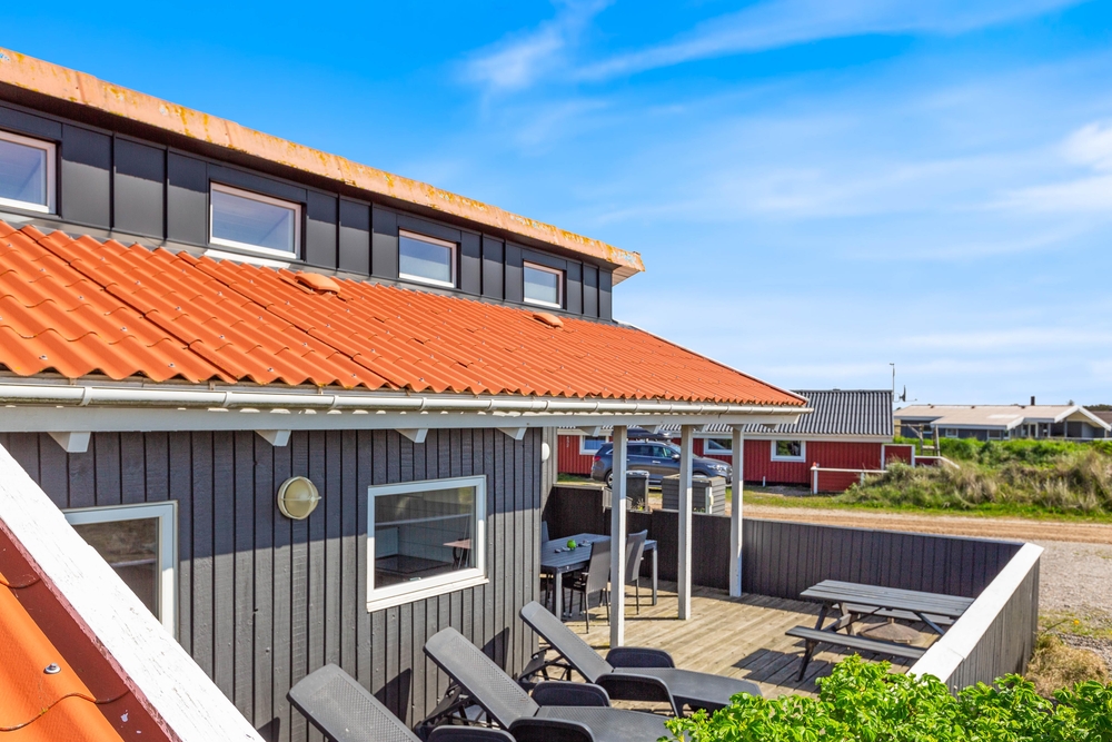 Ved feriehuset er der en sydvendt terrasse, hvor I kan nyde de gode solskinsdage og hyggelige grillaftener. Terrassen er lukket, så I roligt kan lade småbørn og hunde færdes frit.