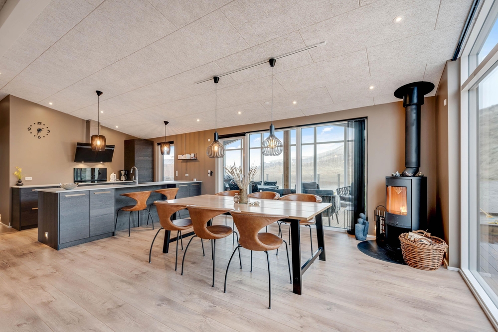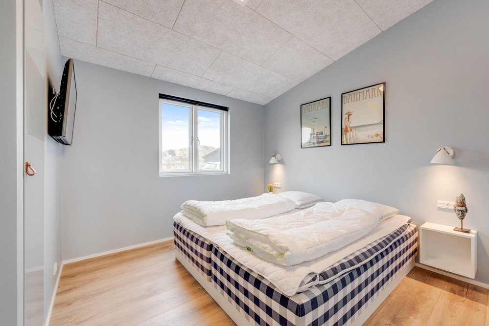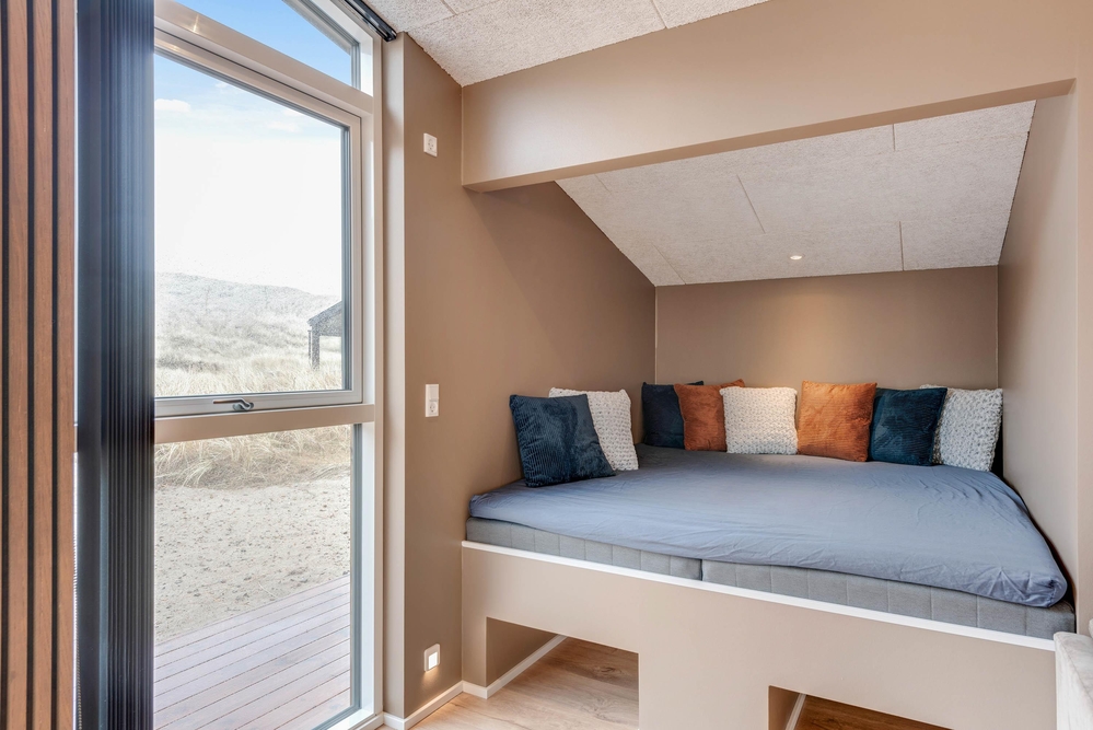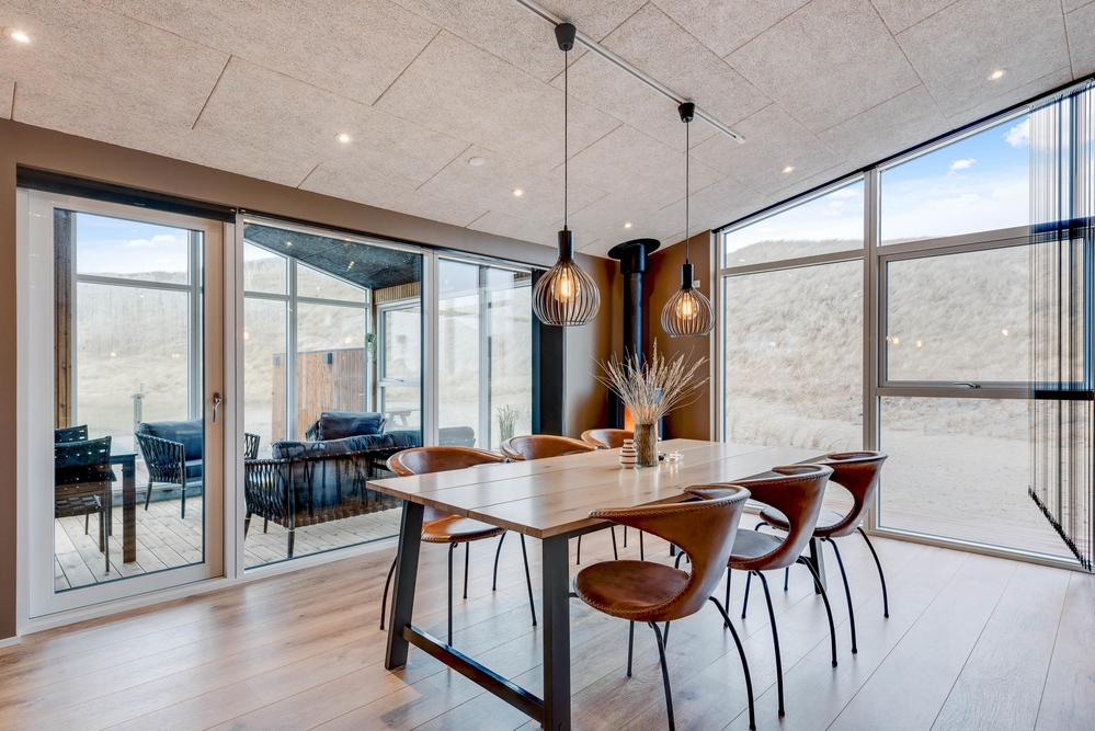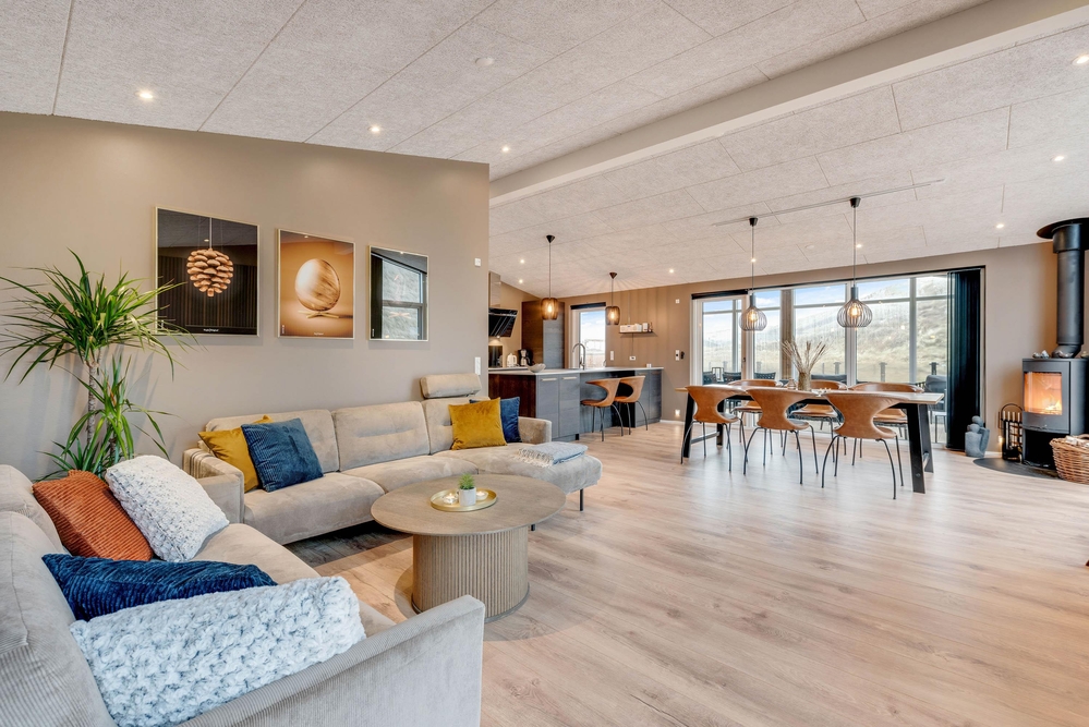 Det i 2021 byggede sommerhus er virkelig stilfuldt indrettet med gode kvalitetsmøbler, som I vil finde jer godt tilpas i under ferien. I alrummet, der kombinerer køkken, stue og spisestue, kan I samles til gode stunder omkring spisebordet eller i sofaerne foran tv?et. Brændeovnen, der står i alrummet, sætter prikken over i?et for sommerhusstemningen og bidrager med ekstra hygge.