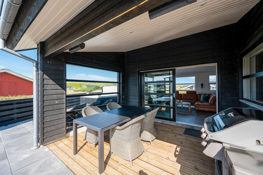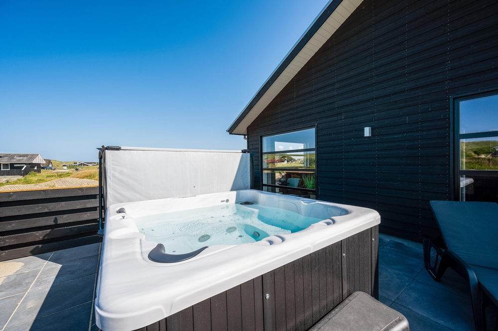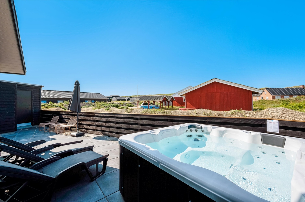 På sommerhusets dejlige terrasse kan I ugeneret slappe af og hygge jer i den lækre udendørs spa, der er et hit året rundt ? enten på de lune sommeraftner eller i de køligere måneder under en flot stjernehimmel. Udespaen har plads til 6 personer, og her kan I slutte dagen af med et køligt glas vin under stjernehimlen.