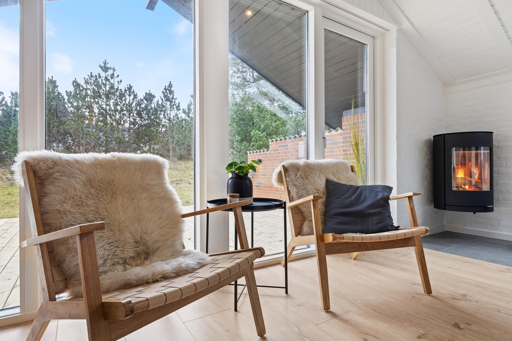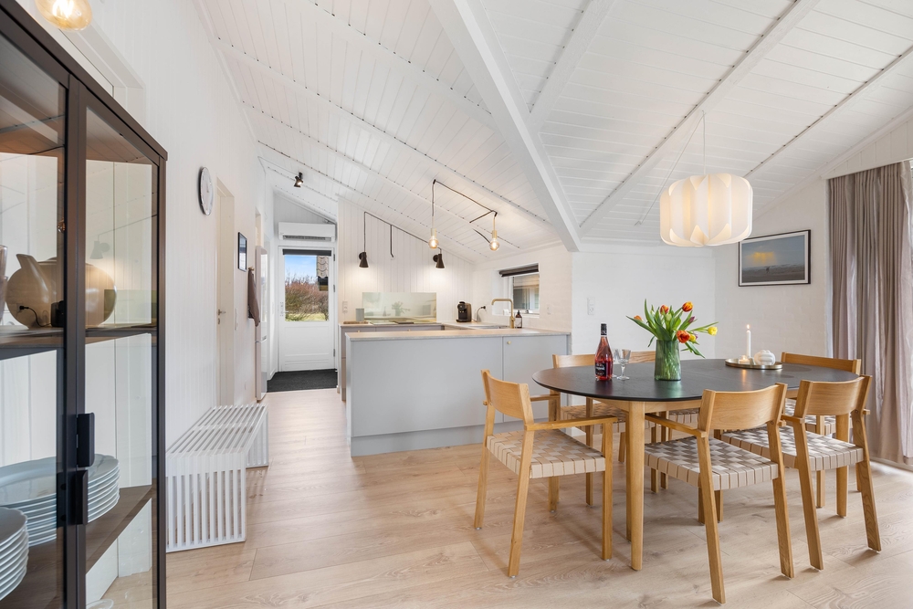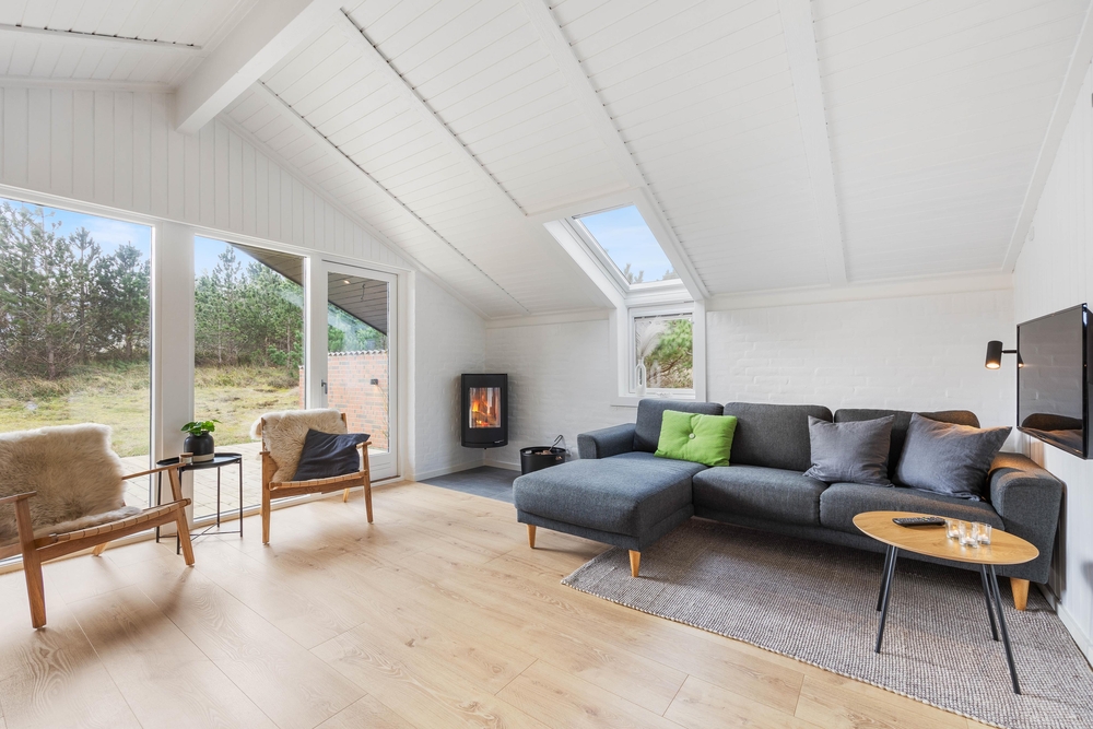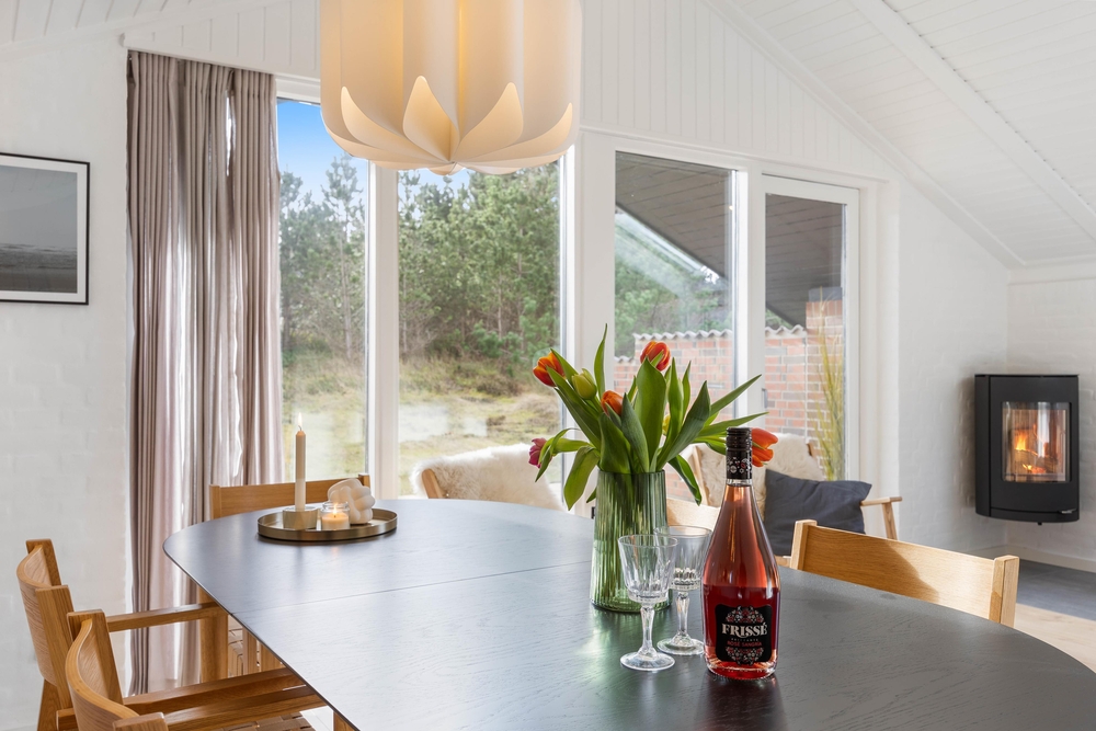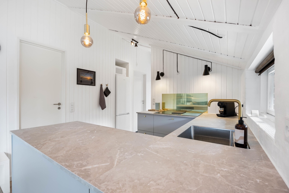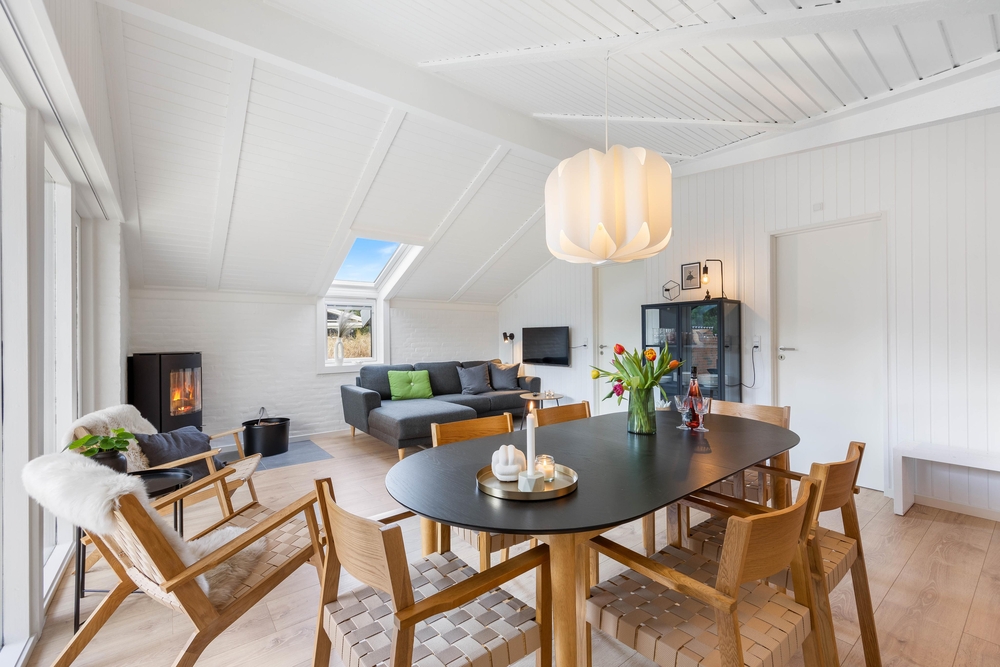 Den hyggelige opholdsstue er samlingspunktet her, hvor man kan slappe helt af i sofahjørnet foran brændeovnen, læse en god bog og nyde en god kop kaffe foran den knitrende ild. Det åbne køkken indeholder alt, hvad I behøver for at forkæle hinanden med lækre hjemmelavede måltider. Induktionskomfuret giver hurtig og intensiv effekt, og den separate fryser på 107 liter har plads nok til både opbevaring af fødevarer og is til desserten.
