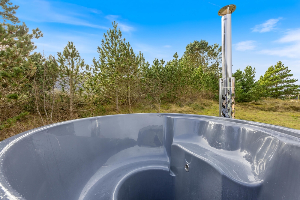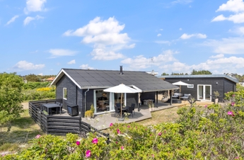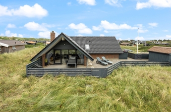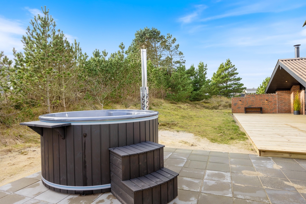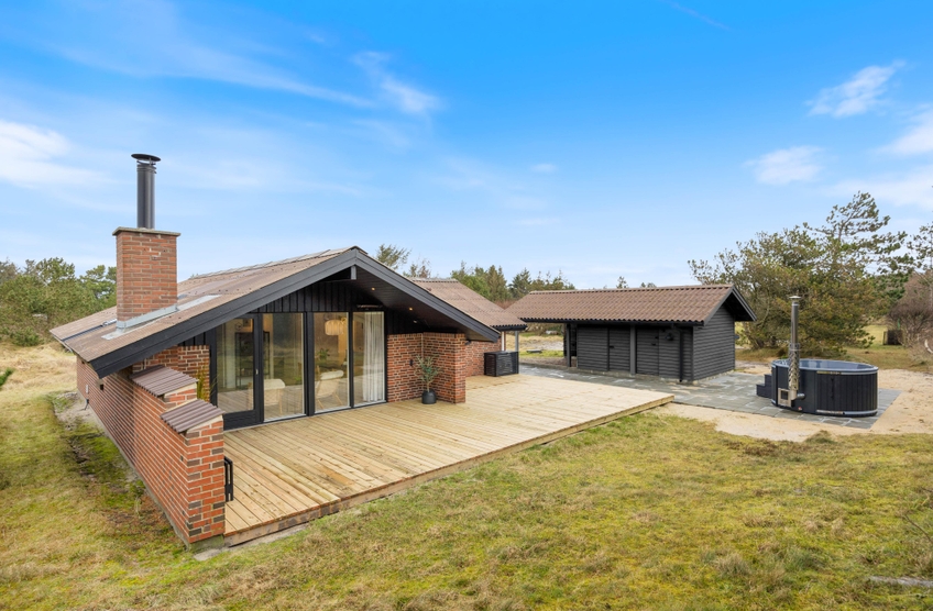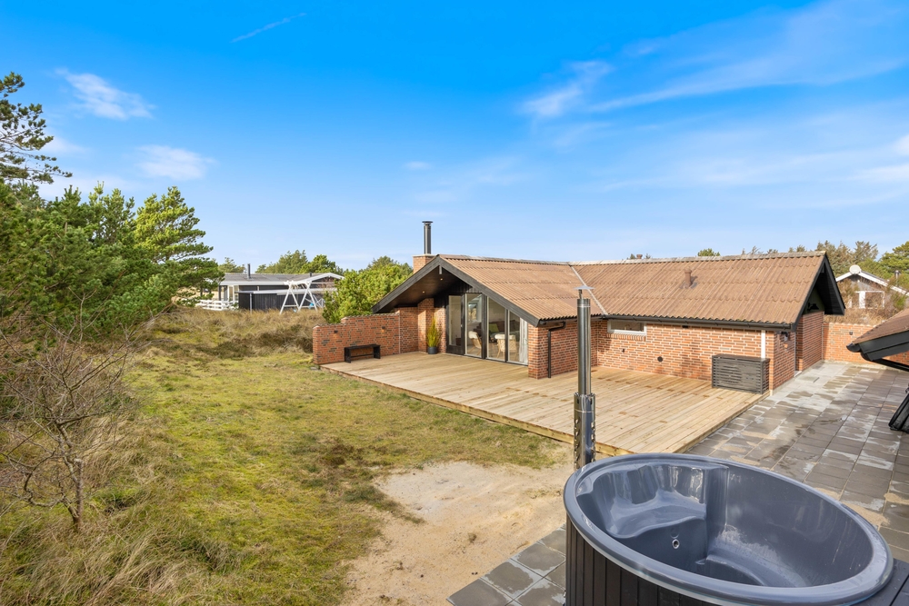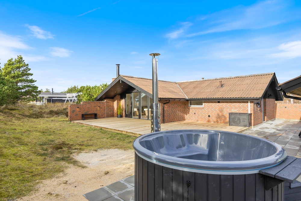Naturgrunden er delvis omgivet af træer, som afskærmer og giver mange gode kroge, hvor I kan føle jer ugenert. Der er rig mulighed for at nyde solens stråler på den store træterrasse ved feriehuset, og den overdækkede terrasse er sammen med terrassevarmeren med til at forlænge dagen. Tag solbad i liggestolene, eller slap af i havemøblerne. Vildmarksbadet kan I benytte i dag- eller aftentimerne, som det passer jer bedst. Udebruseren har både varmt og koldt vand og kan benyttes fra april til november. Tænd op i gasgrillen til aften, og nyd et lækkert grillmåltid sammen imens skyggerne bliver lange. I dette charmerende feriehus kan I nyde at bo tæt på naturen og følge dagens rytme. Stå op til solopgangen over fjorden ? og nyd solnedgangen, mens I ser himlen farves orangerød over klitterne mod vest.