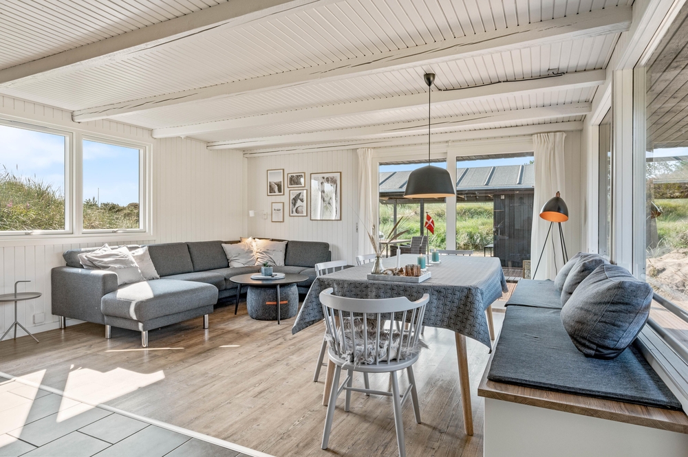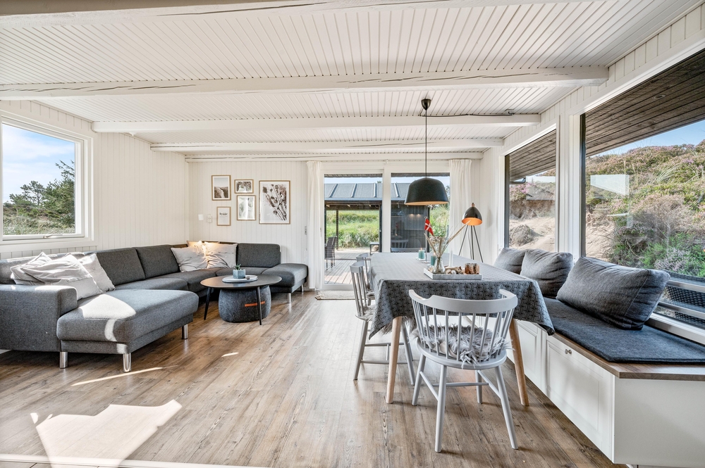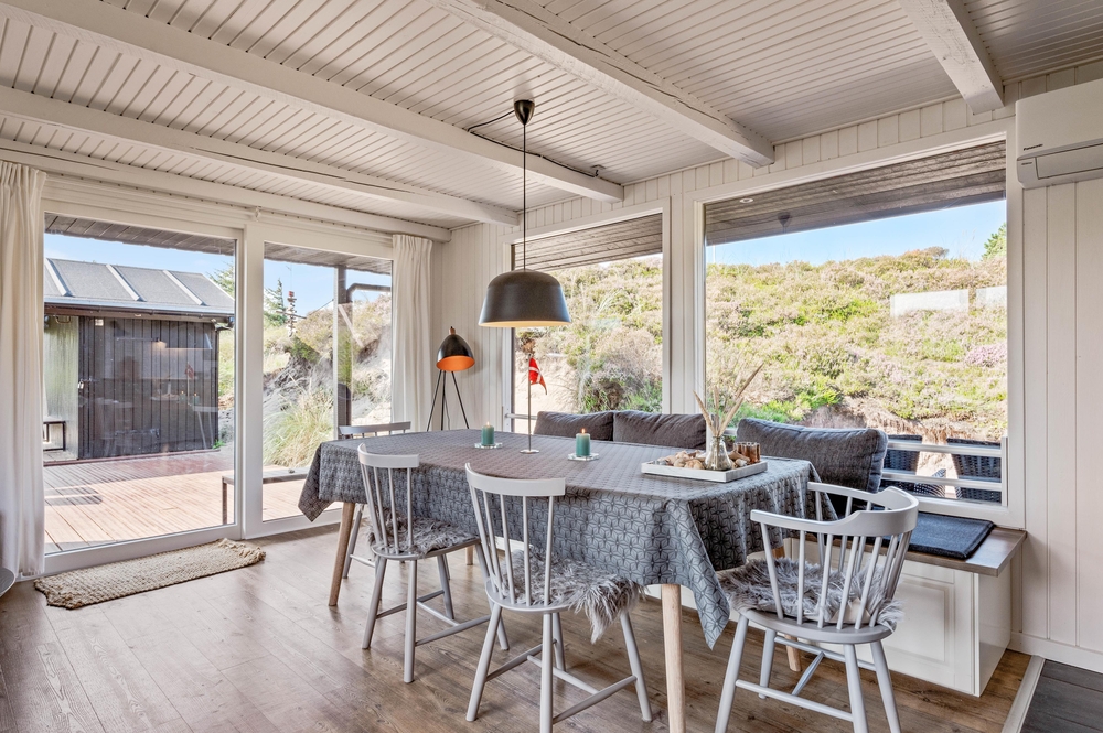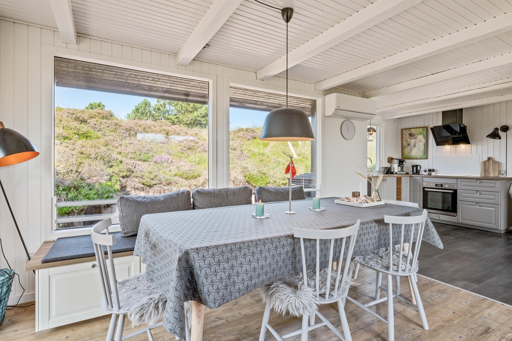 Flokken kan samles til hygge omkring måltiderne ved det store spisebord. Feriehusets store vinduer giver et skønt lysindfald og udsigt til de lyngbeklædte klitter.