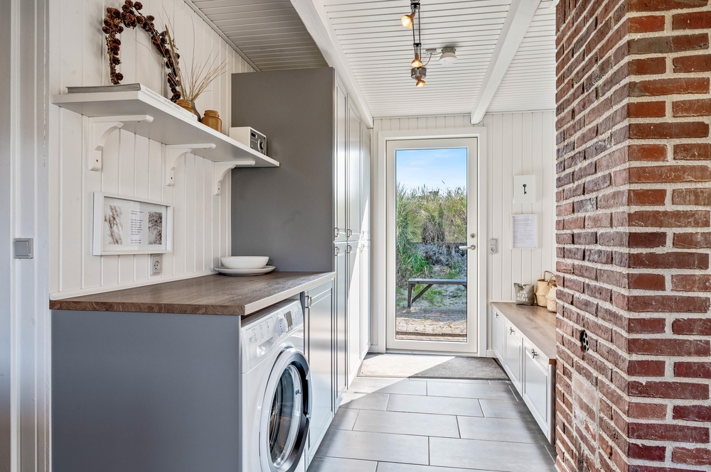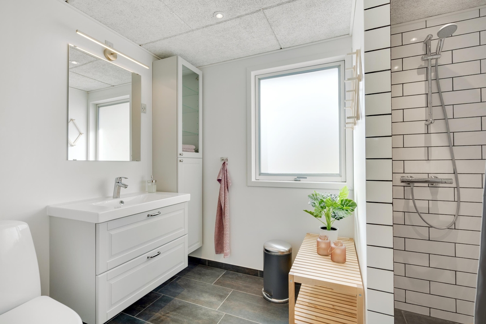 Badeværelset er med bruser og naturligvis gulvvarme. Sommerhuset er både smukt og praktisk indrettet, således at der er et godt indgangsområde med skabs- og bordplads og muligheden for at sidde ned, imens skoenes sløjfer skal bindes.