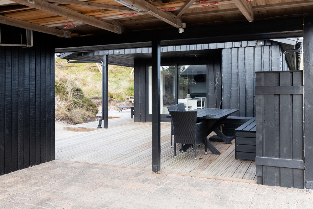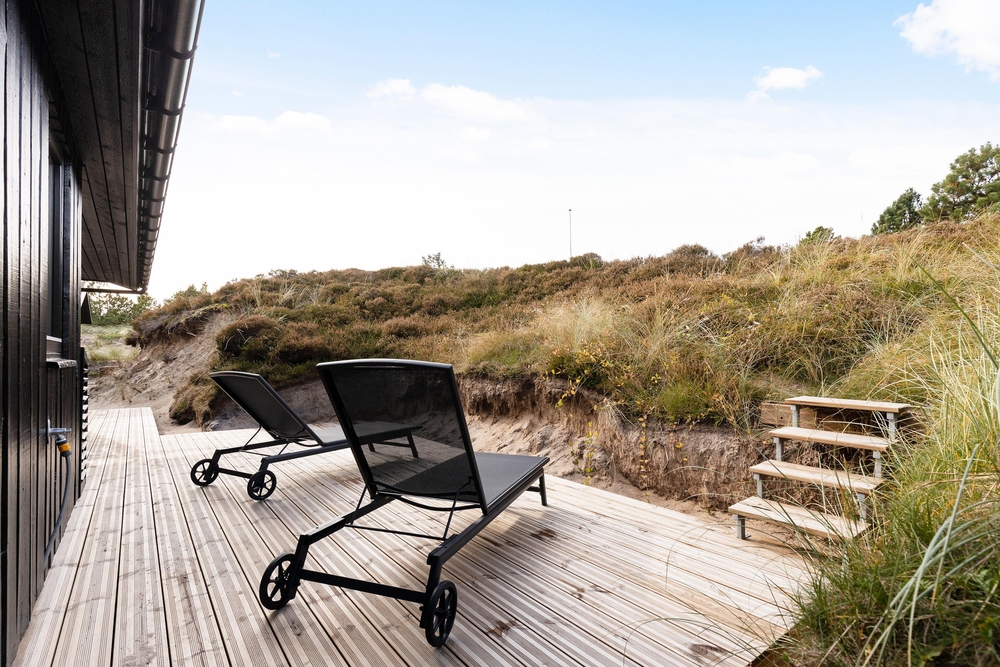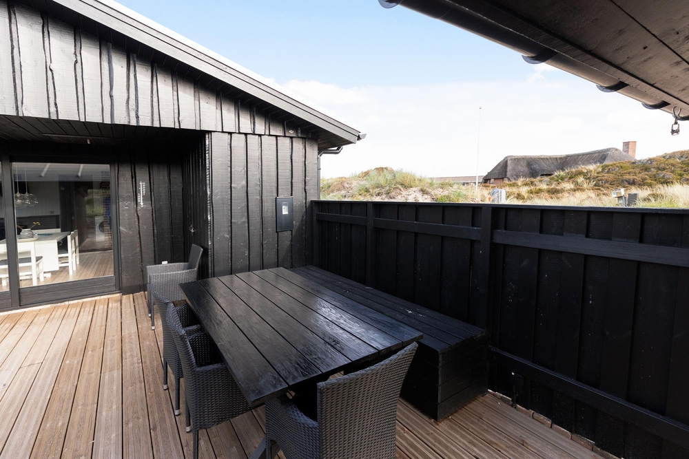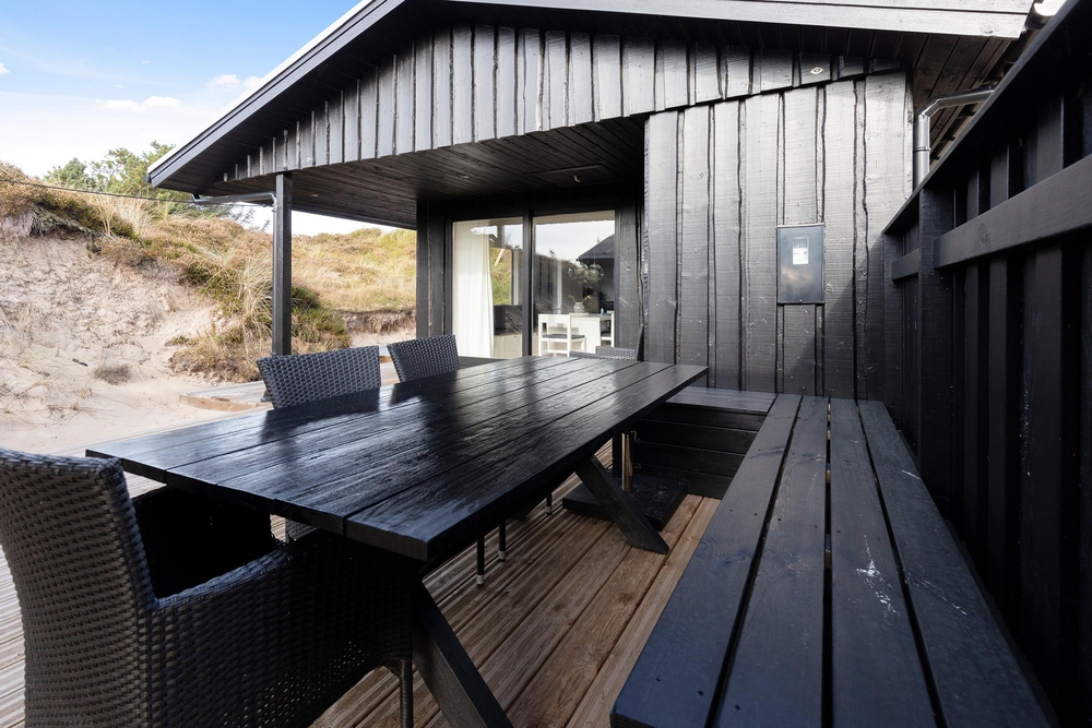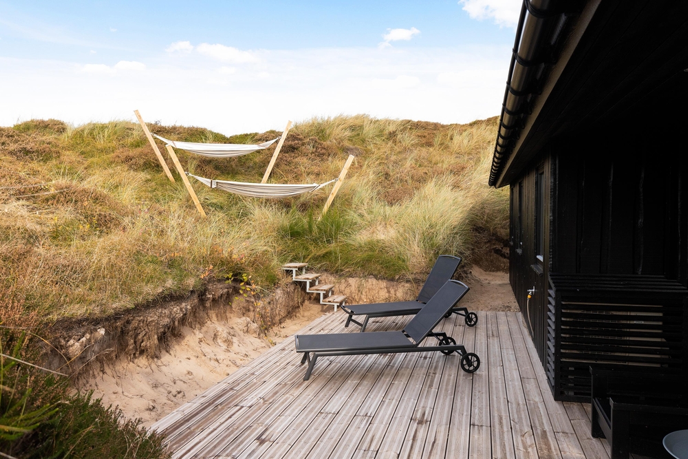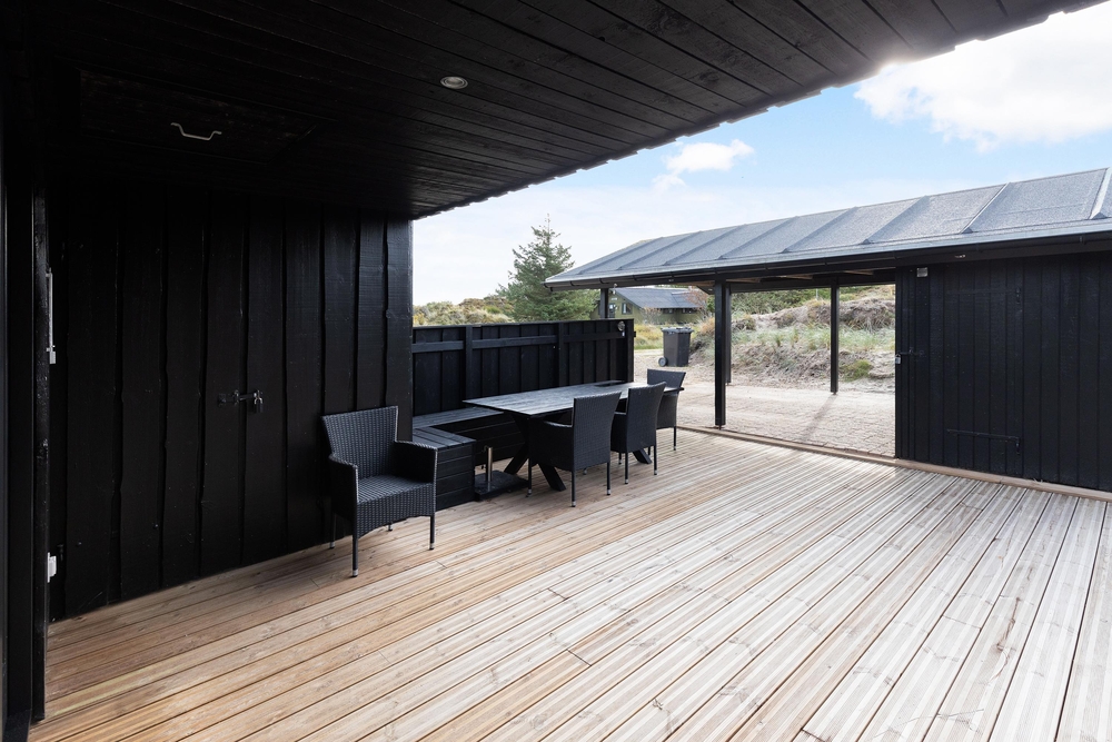 Fra stuen kommer I ud på det store fantastisk terrassedæk, der omkranser feriehuset. Her er der sørget for både ly og læ, så I kan nyde hver en solstråle og kan tilbringe mange timer med solbadning eller grillhygge. For en absolut naturoplevelse kan I lægge jer til rette i hængekøjen og bare nyde nærheden til naturen, der i sommermånederne her i Grærup er fyldt med lærkesang og duften af lyng.