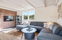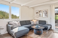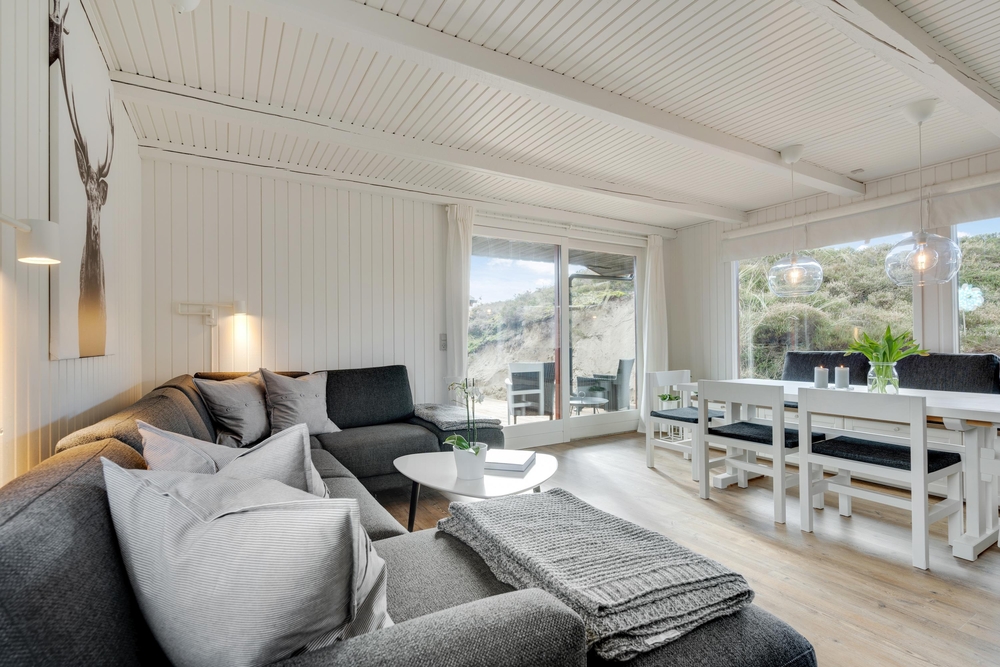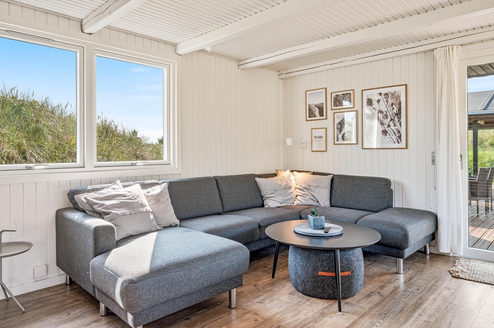 Stearinlys på sofabordet og hyggesnak fra spisebordet, hvor der er gang i et spil kort. Du sidder tilbagelænet i den store sofa med en bog på skødet og nyder stemningen. Sådan kunne en aften udspille sig i dette sommerhus, som indbyder til hygge og samvær med et stort sofahjørne.