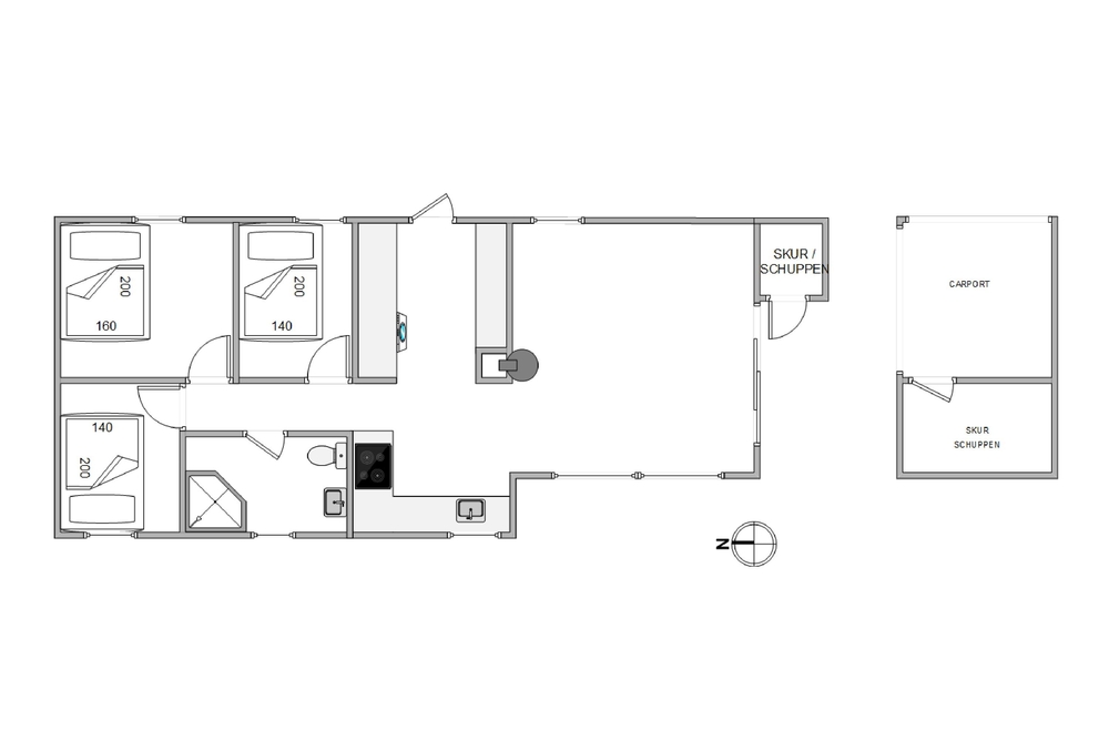 Sommerhuset på Bjørnedalen 27 har 3 soveværelser, som alle er indrettet med dobbeltsenge ? en lidt større (160×200) og 2 senge med 140×200.