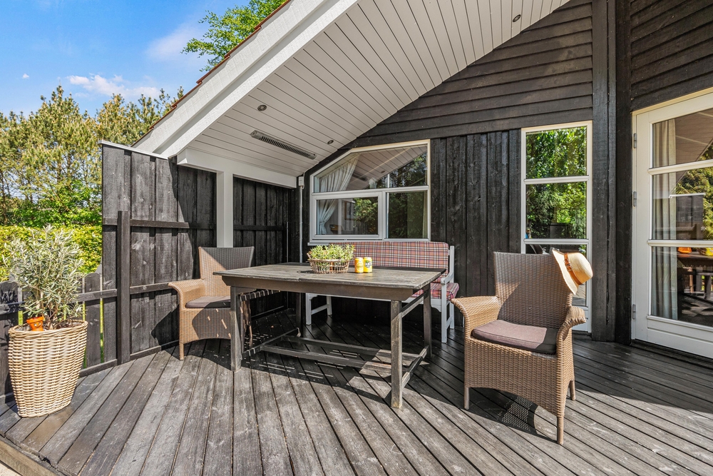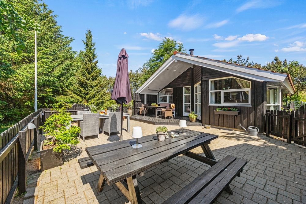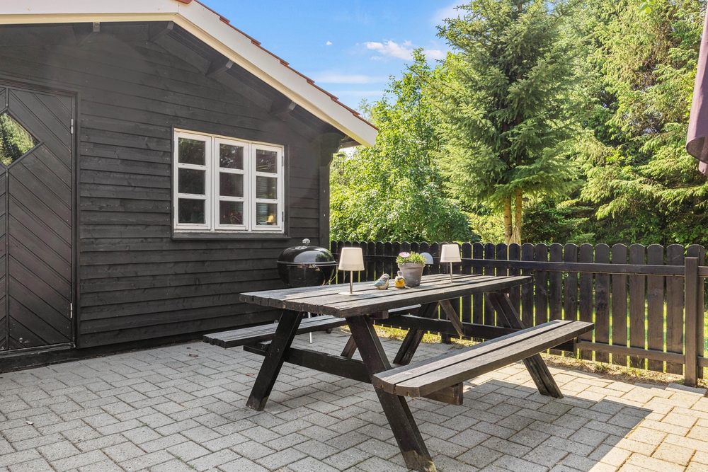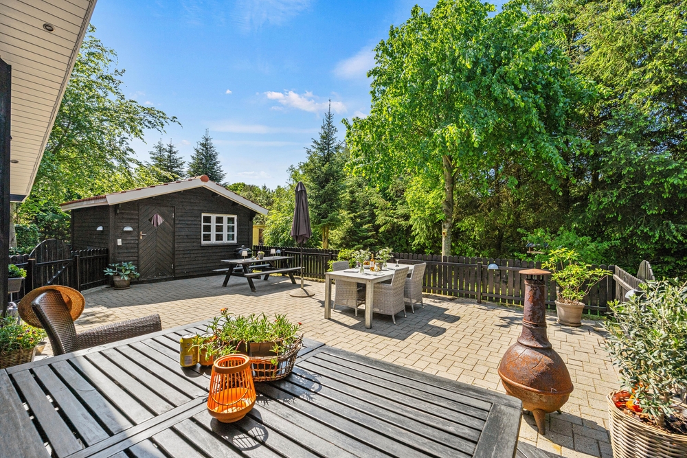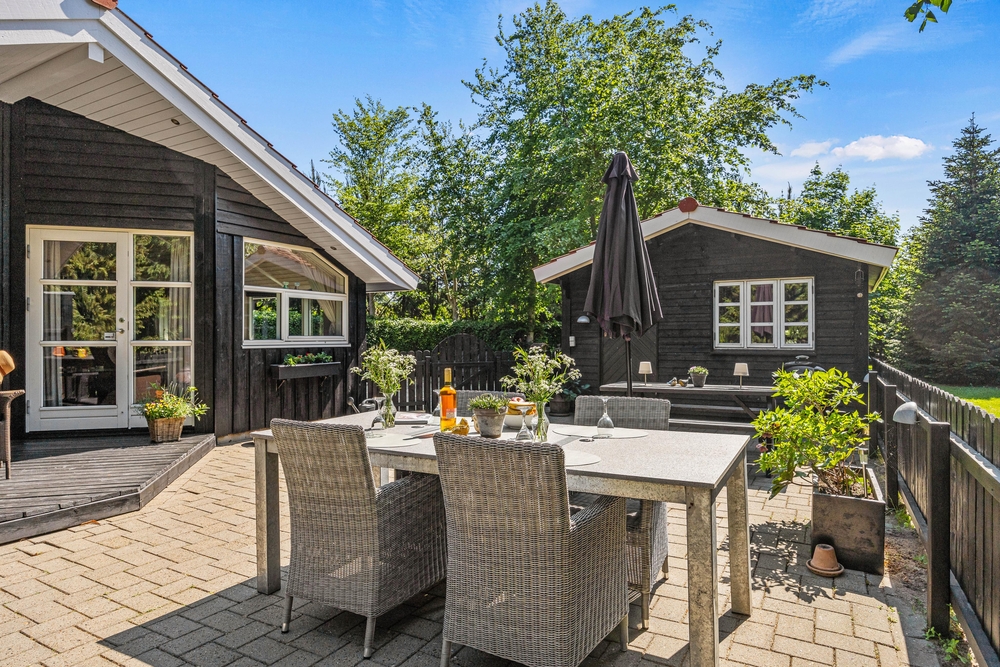 Fra stuen kan I gå direkte ud på den overdækkede og afskærmede del af terrassen, så I kan sidde ude, selv hvis det skulle dryppe lidt. Et trin ned derfra og I befinder jer under åben himmel. Den store flisebelagte terrasse er lukket af, så hunden ikke bare vandrer på eventyr på egen hånd. Havemøblerne, parasollen og grillen er alt, I behøver for at nyde en solrig dag udenfor.