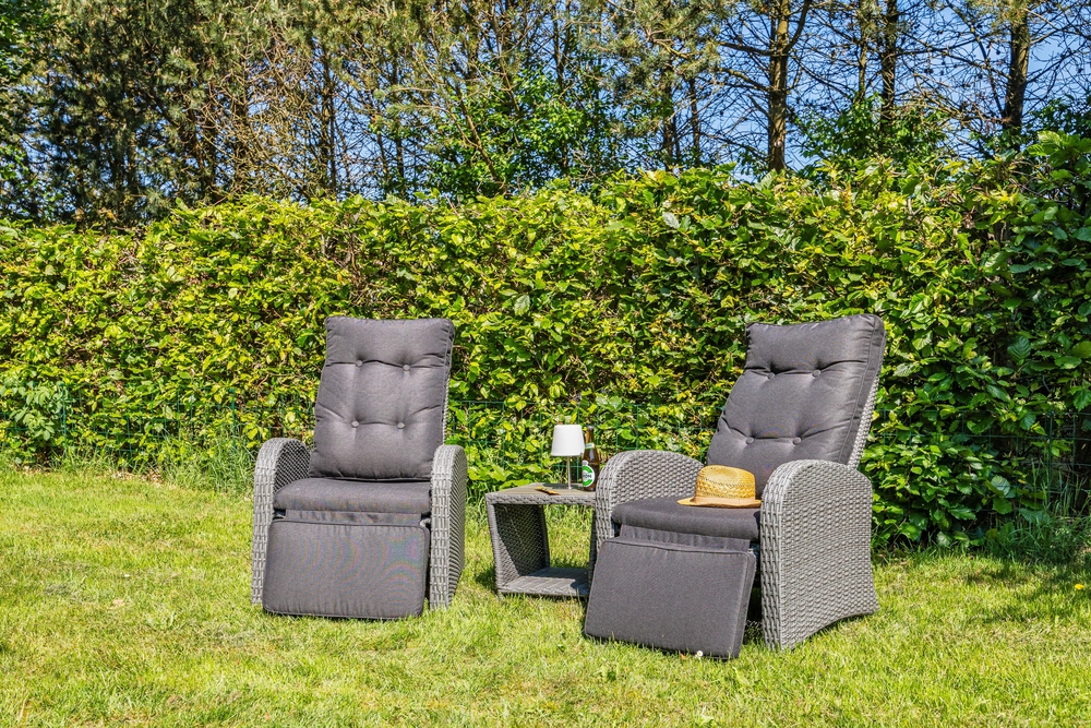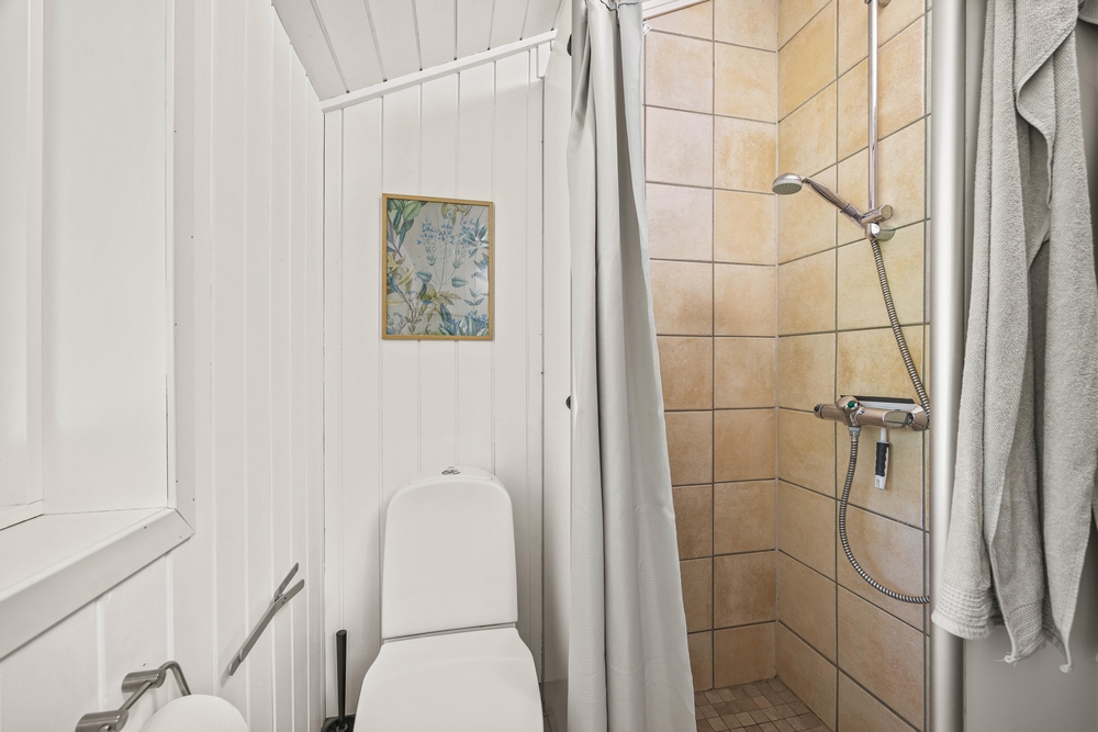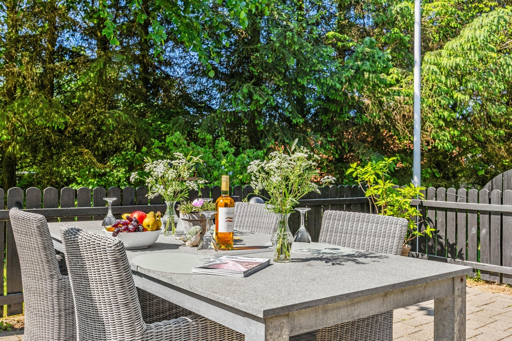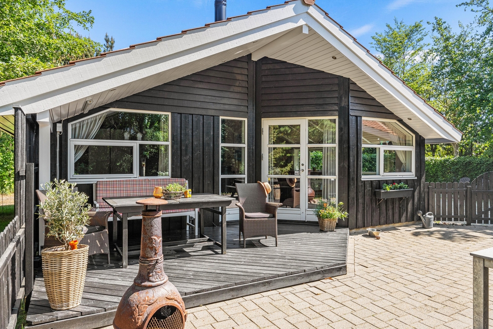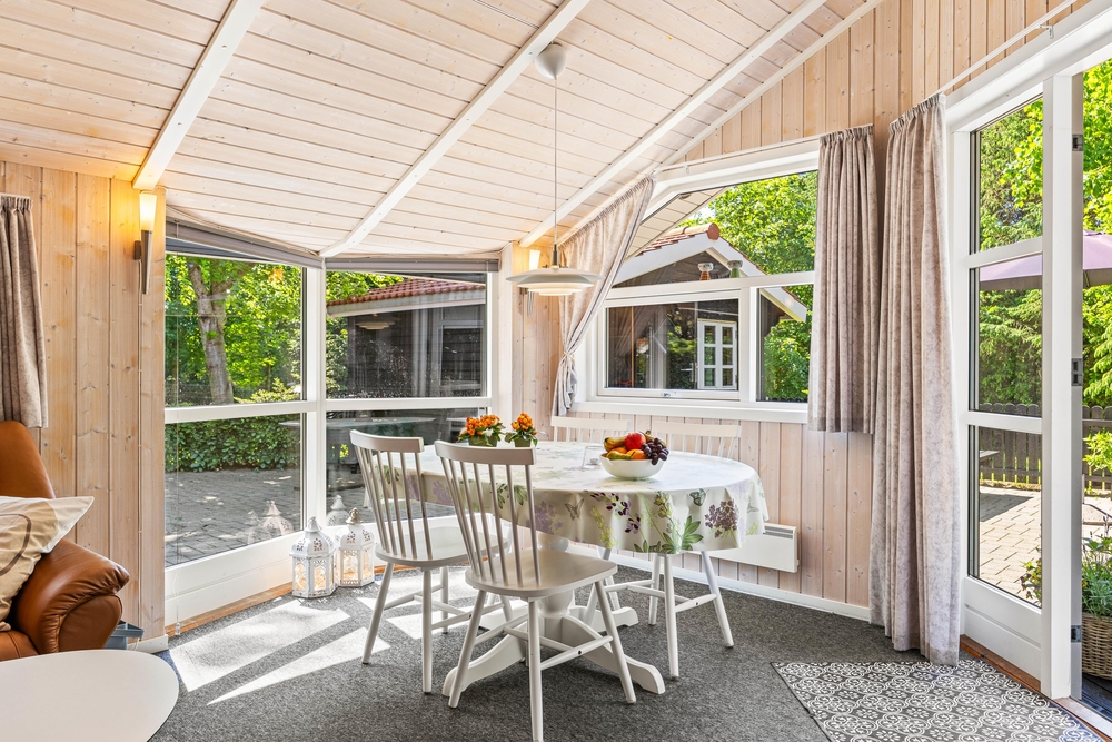 Fra stuen kan I gå direkte ud på den overdækkede og afskærmede del af terrassen, så I kan sidde ude, selv hvis det skulle dryppe lidt. Et trin ned derfra og I befinder jer under åben himmel. Den store flisebelagte terrasse er lukket af, så hunden ikke bare vandrer på eventyr på egen hånd. Havemøblerne, parasollen og grillen er alt, I behøver for at nyde en solrig dag udenfor.