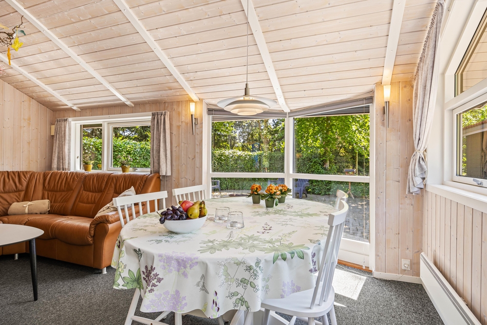 Trævæggene med de hvide lister og karme får det hele til at fremstå lyst og venligt, hvilket de mange vinduer omkring stuen og spisestuen også bidrager til. Begge dele ligger i åben forbindelse med køkkenet, så I kan holde øje med, hvad der foregår i stuen og snakke med, mens I står og rører i aftensmaden.