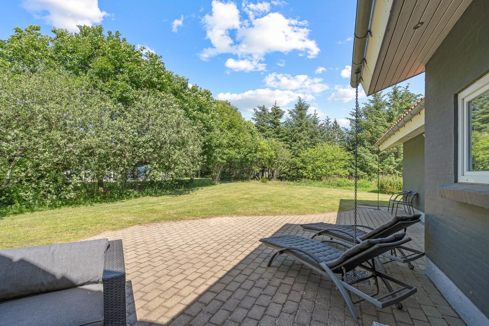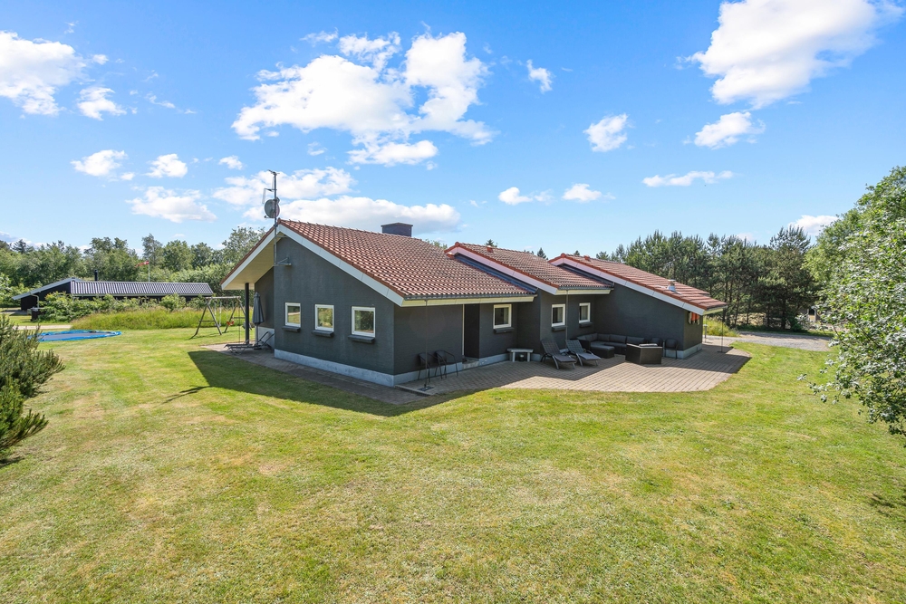 Havemøbler, parasol og liggestole giver jer mulighed for at slappe af og nyde solen. For de mindste er der både gynger, en sandkasse og en trampolin, der vil holde børnene underholdt og glade i timevis.