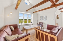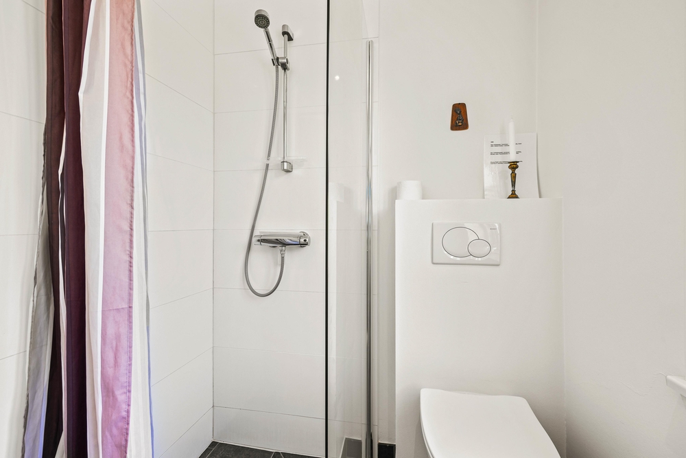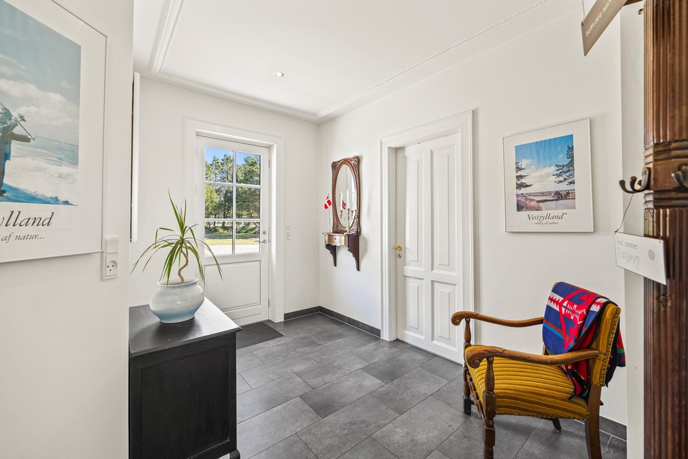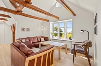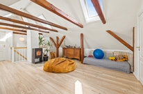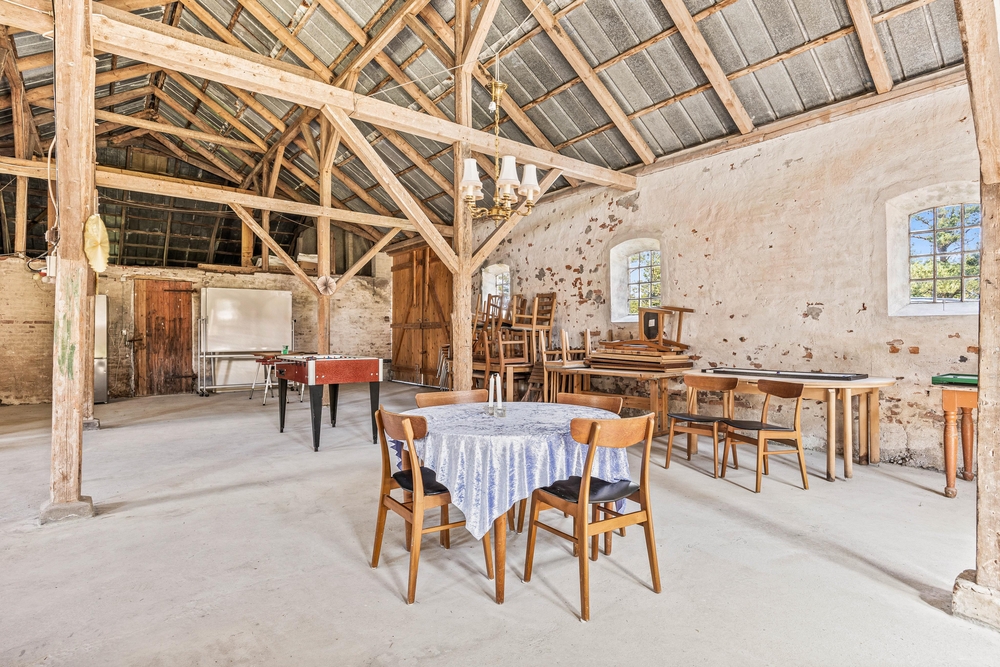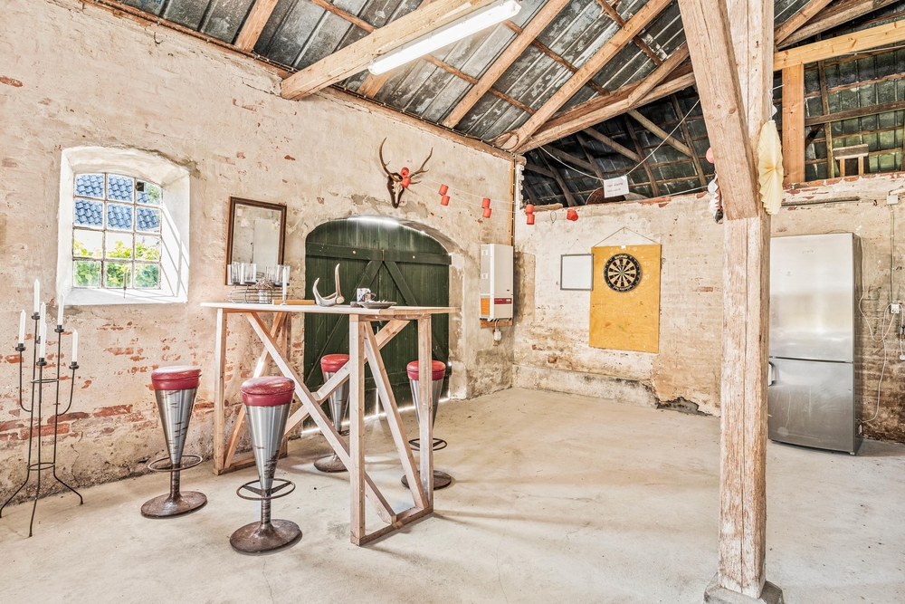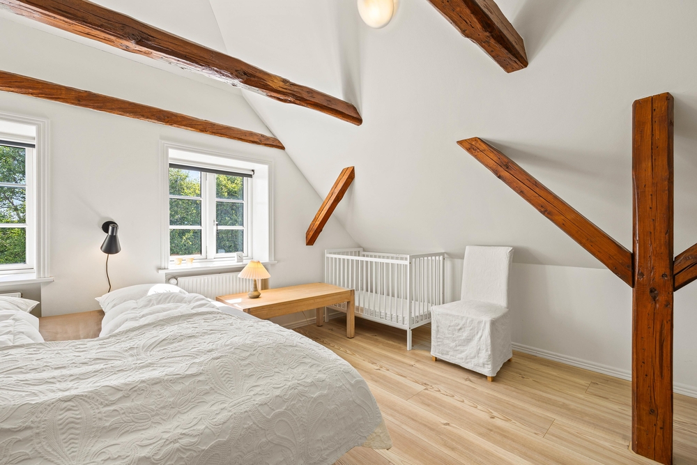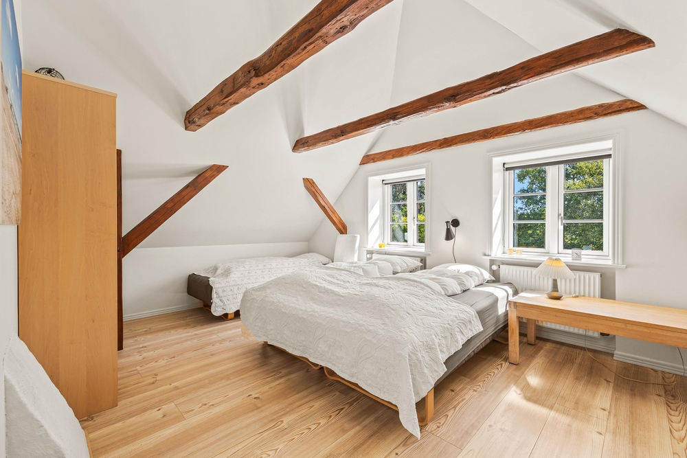 Rummene på 1. sal er med loft til kip og fritlagte bjælker, der gør rummene særdeles indbydende og charmerende.