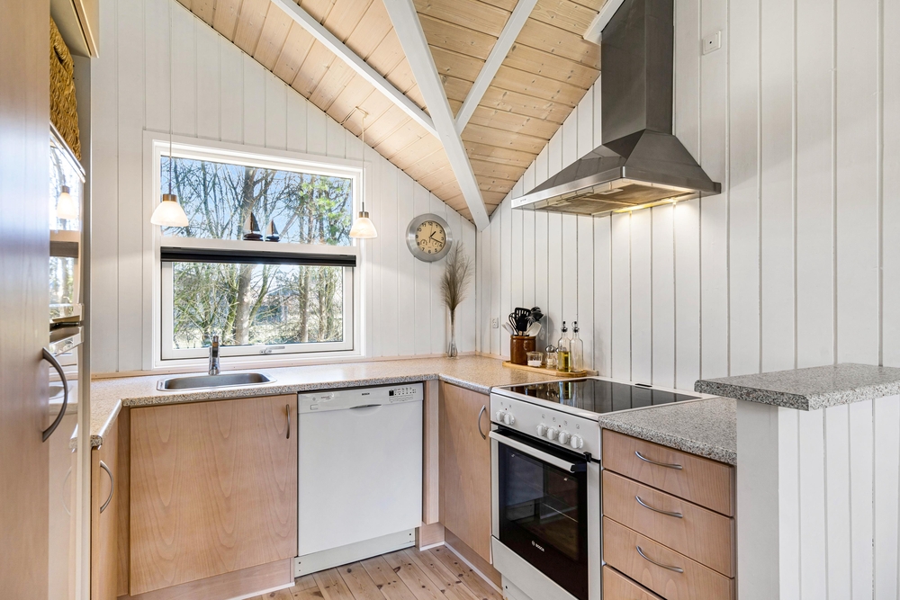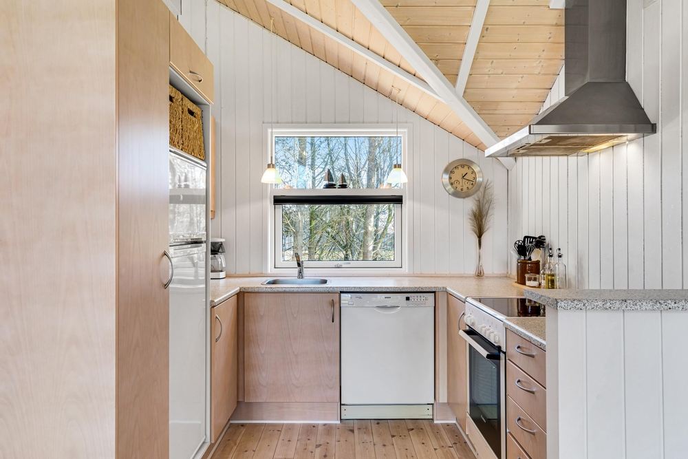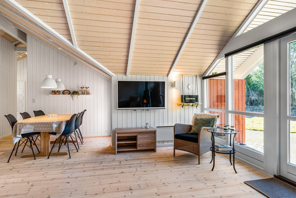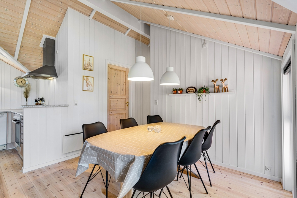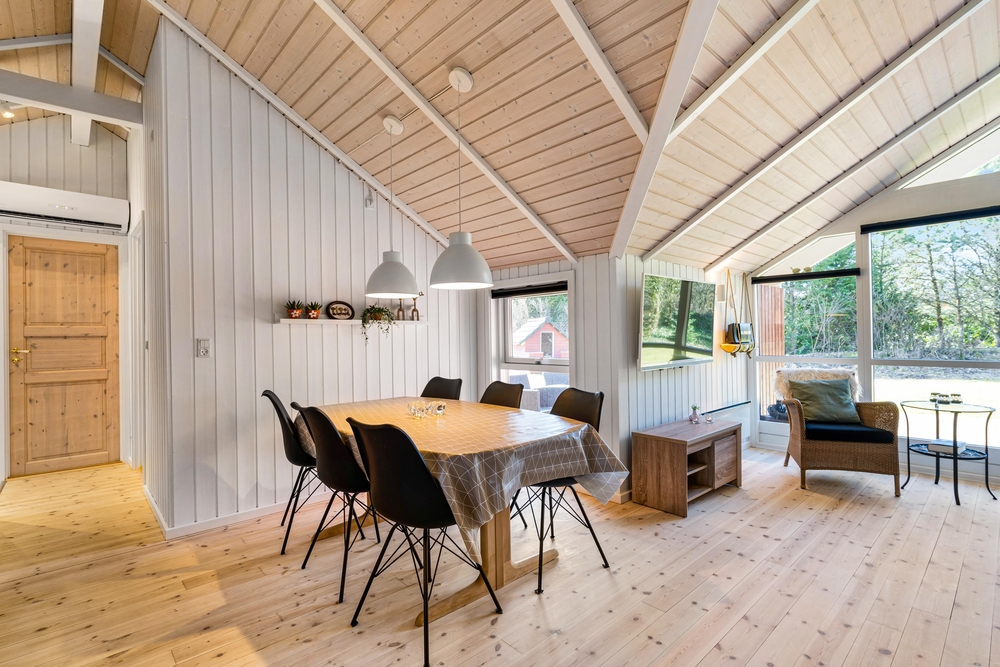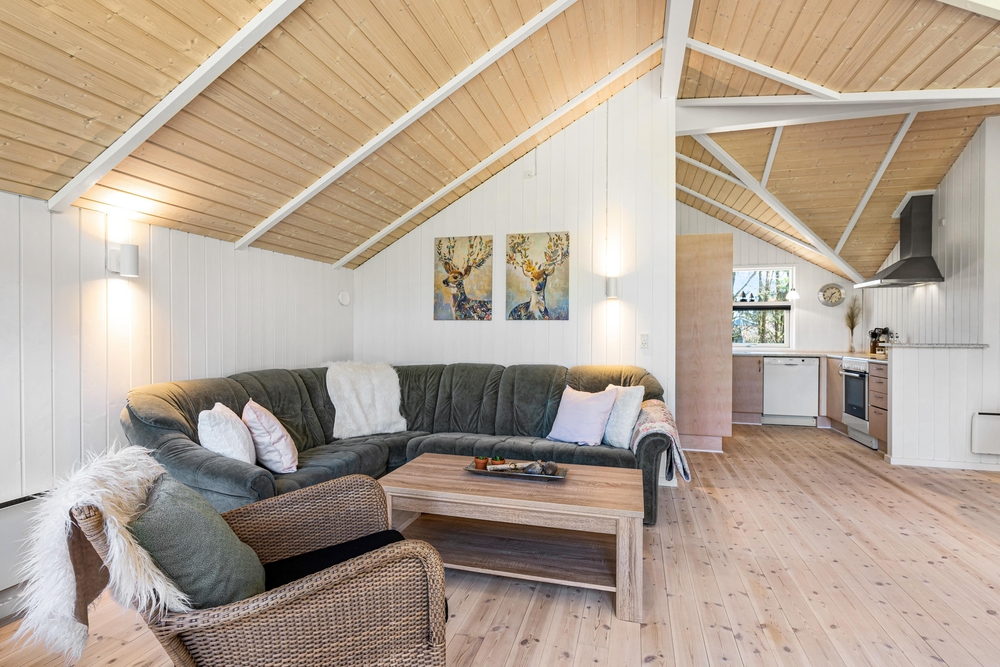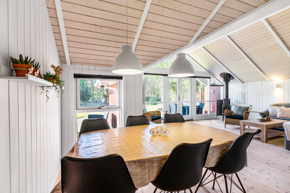 Det er nemt at se, at sommerhuset på Brombærvangen i 2021 har gennemgået en renovring. I bliver mødt af en dejlig åben og lys stue og spisestue, som byder op til mange hyggelige timer sammen med familien eller vennerne. Det store vinduesparti ud mod terrassen sørger virkelig for, at der kommer masser af lys ind i rummet. Og I kan rigtig nyde udsigten fra sofahjørnet.