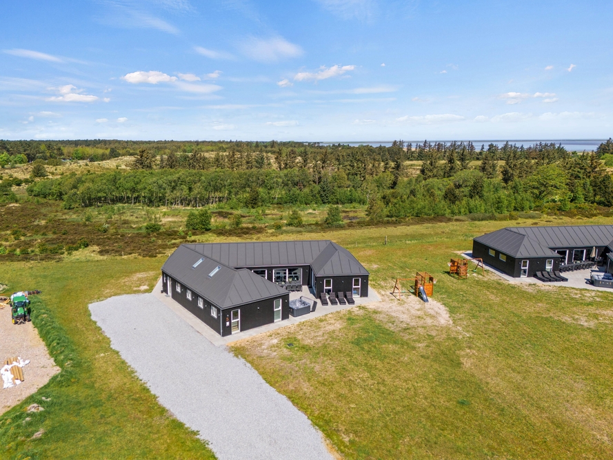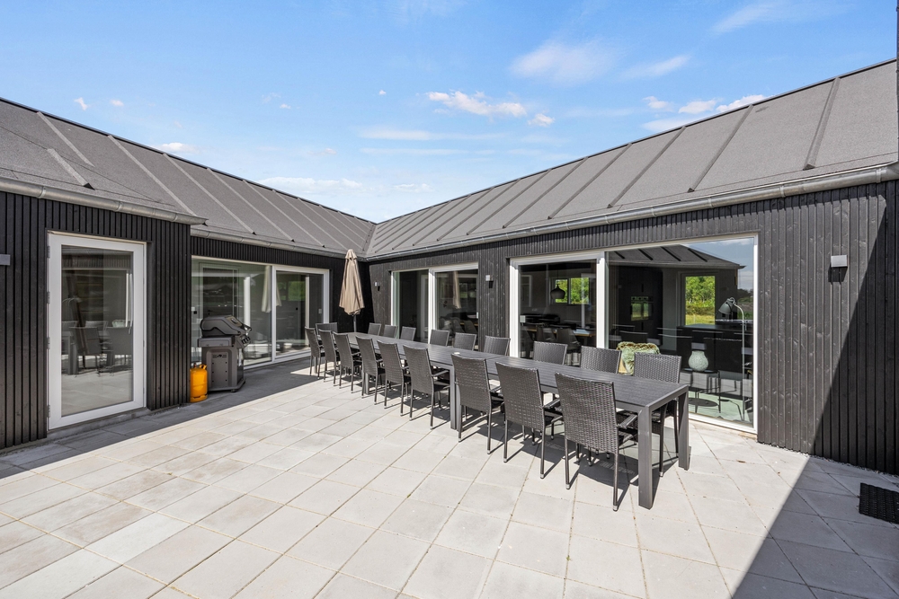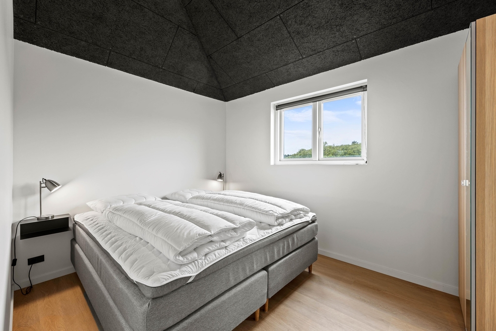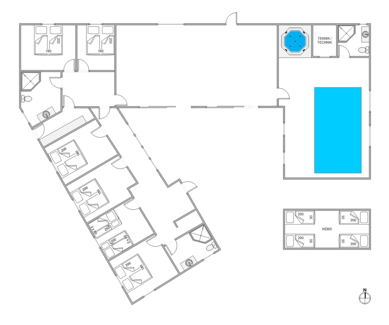 Jeres feriehus har en praktisk indretning. I den vestlige fløj ligger soveværelserne og to af badeværelserne, i midten den hyggelige stue og på den anden side pool området med det tredje badeværelse. I finder i alt 5 hyggelige soveværelser med dobbeltsenge, 1 soveværelse med køjesenge og 4 sovepladser på hemsen.