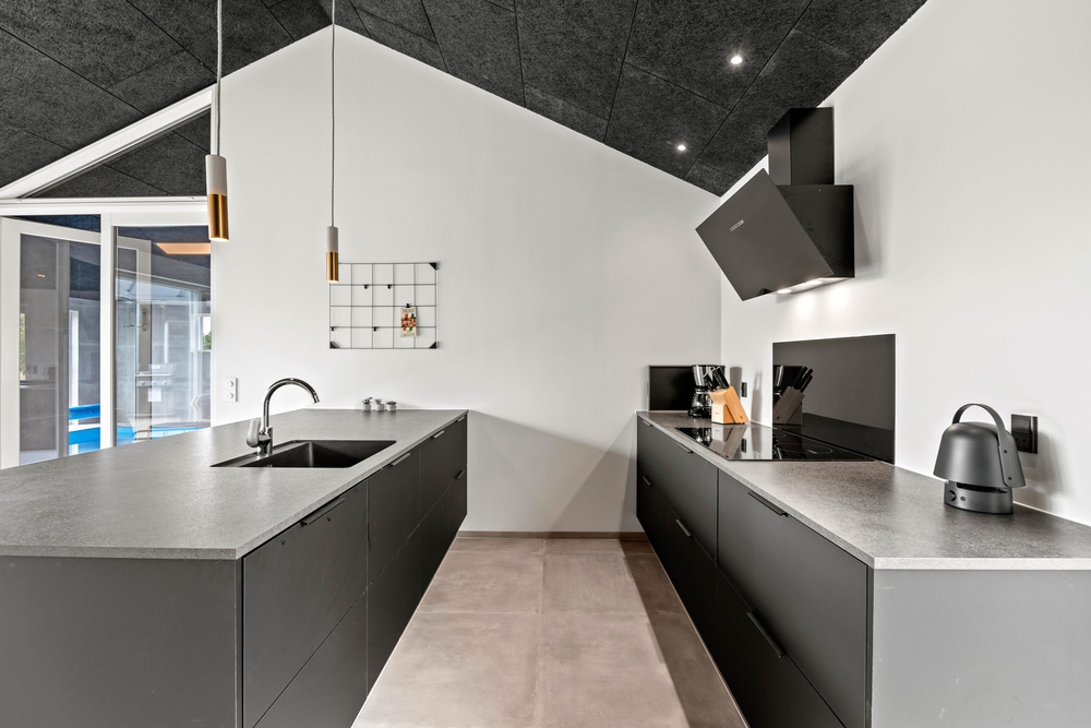 Den hyggelige atmosfære og det smarte design harmonerer perfekt med hinanden. Her kan I blot gøre det behageligt i sofaen, lytte til den knitrende ild i pejsen og spille et spil ved det store spisebord, mens I nyder stemningen i fulde drag. Hvis børnene vil have lidt fred og ro, kan de via en stige komme op på hemsen med enkeltsenge. I det veludstyrede køkken bliver madlavning en fælles begivenhed.