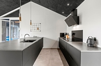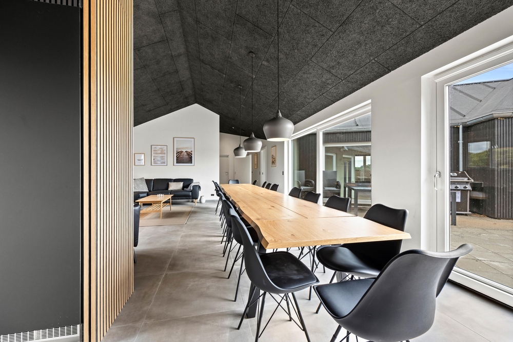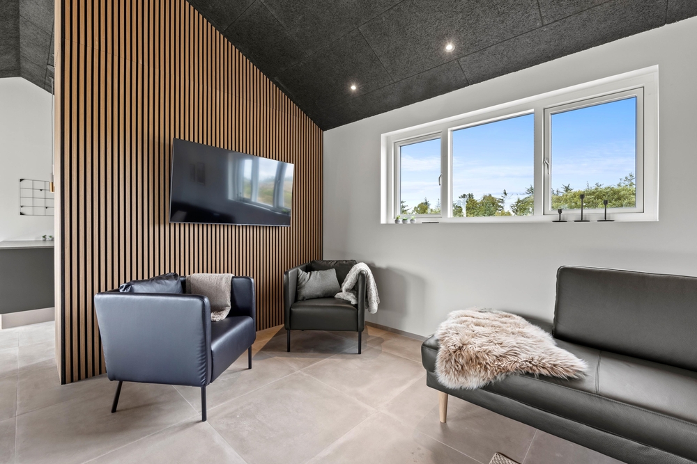 Hjertet i sommerhuset er den rummelige og åbne stue med spisebord og åbent køkken, som er en fornøjelse at opholde sig i. De mange vinduer bader ikke kun opholdsrummet i et fantastisk lys, men giver jer også en følelse af at være helt tæt på naturen.